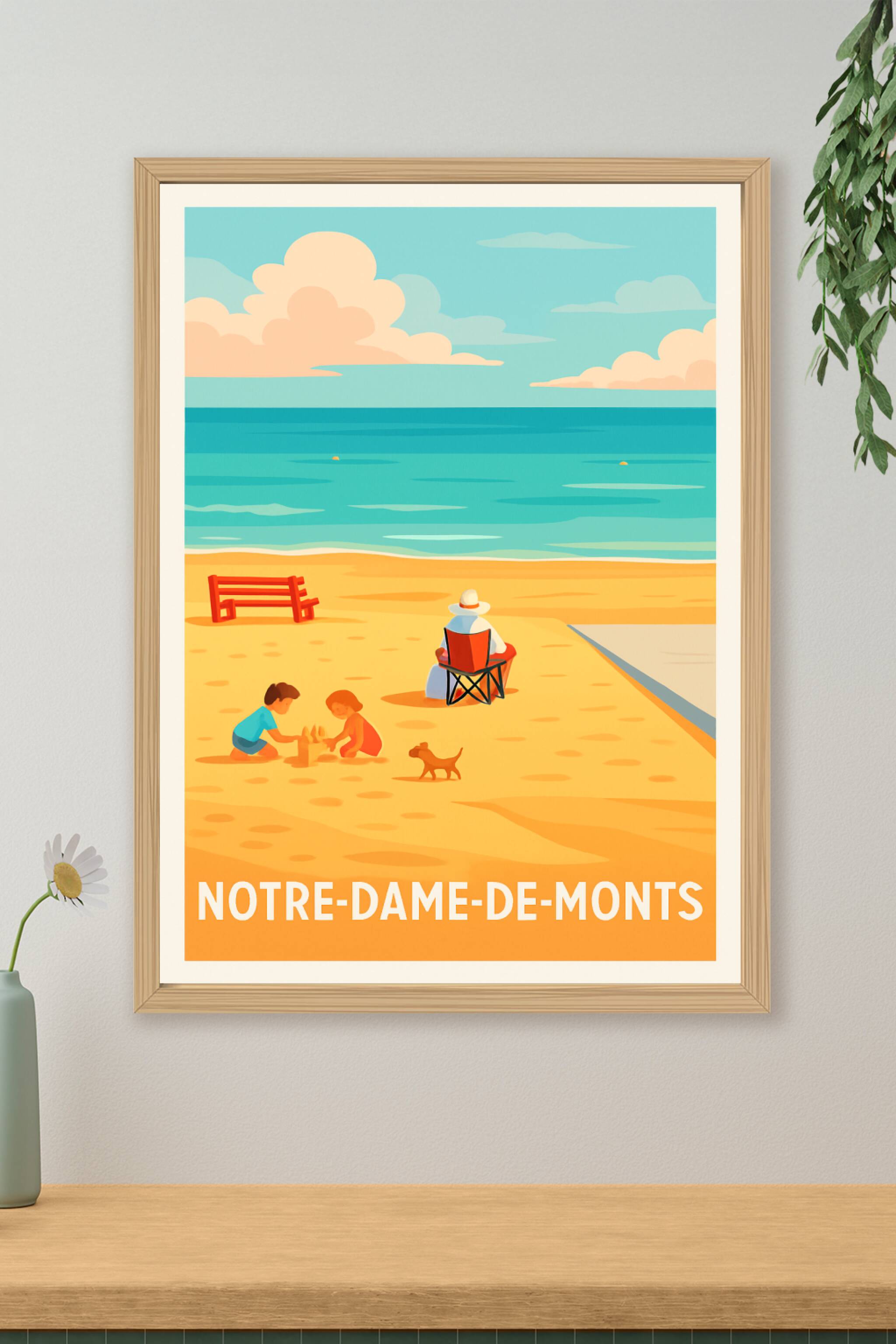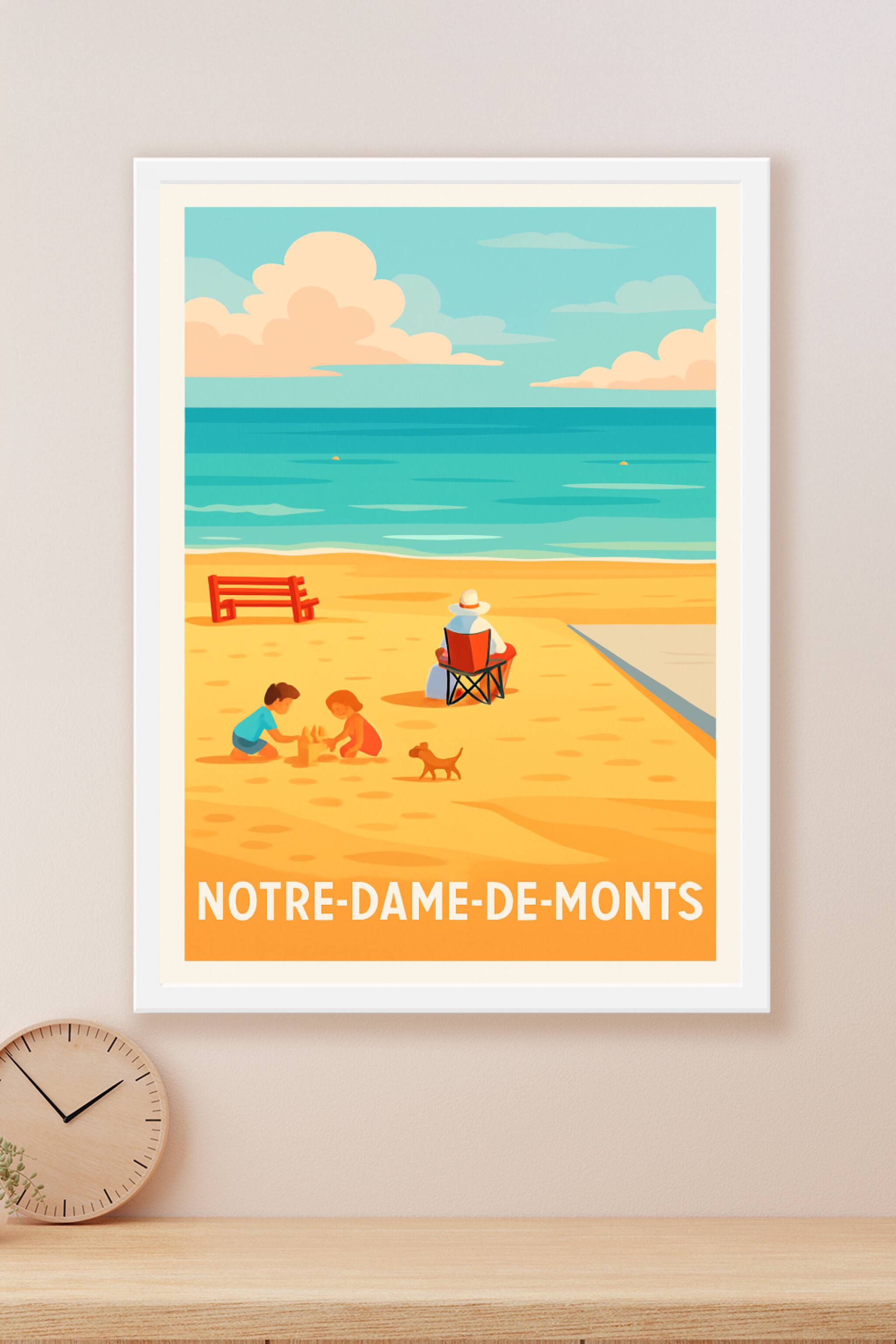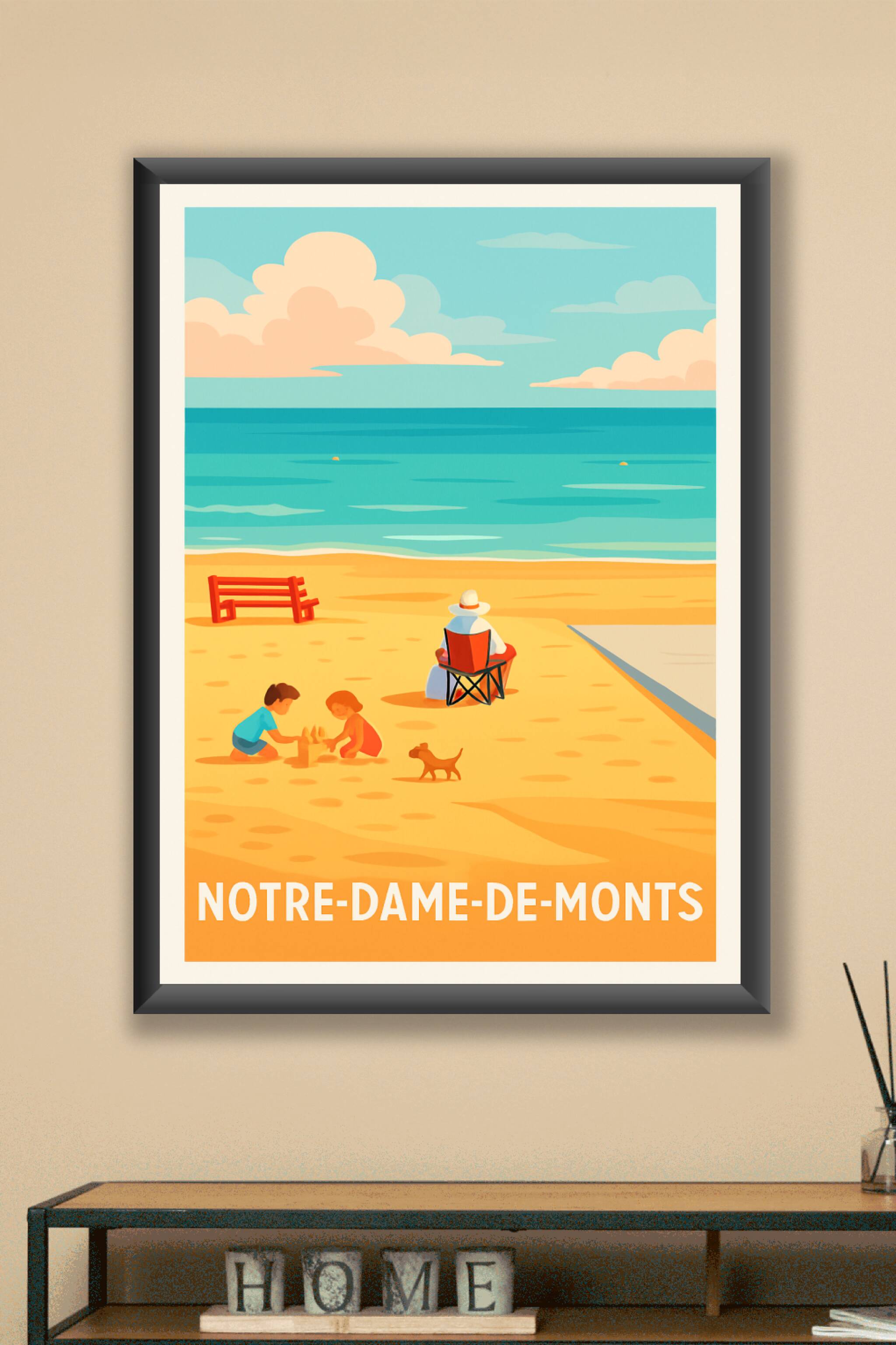 Cette affiche au style délicatement vintage capture une scène paisible sur la plage de Notre-Dame-de-Monts, où deux enfants jouent dans le sable so...