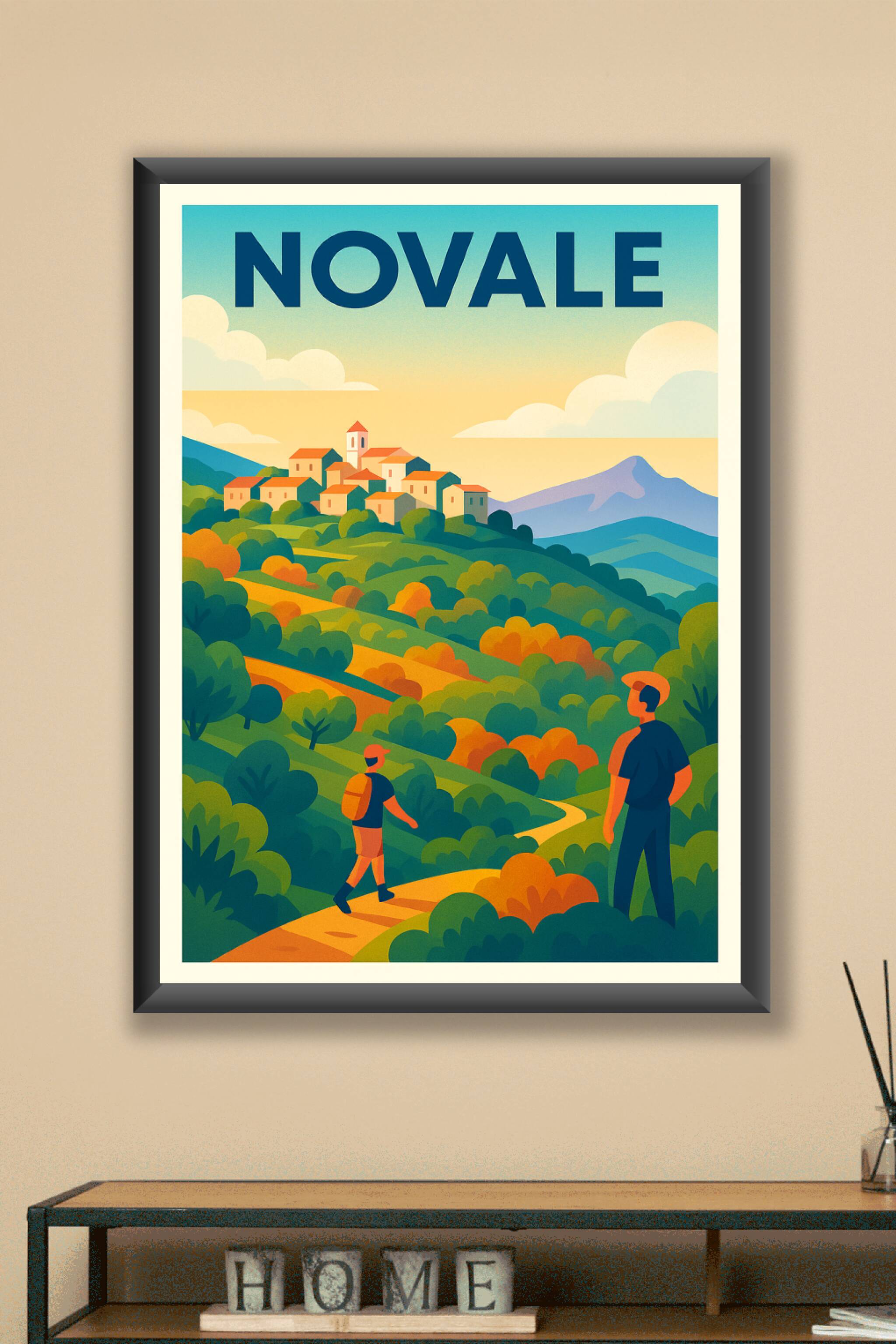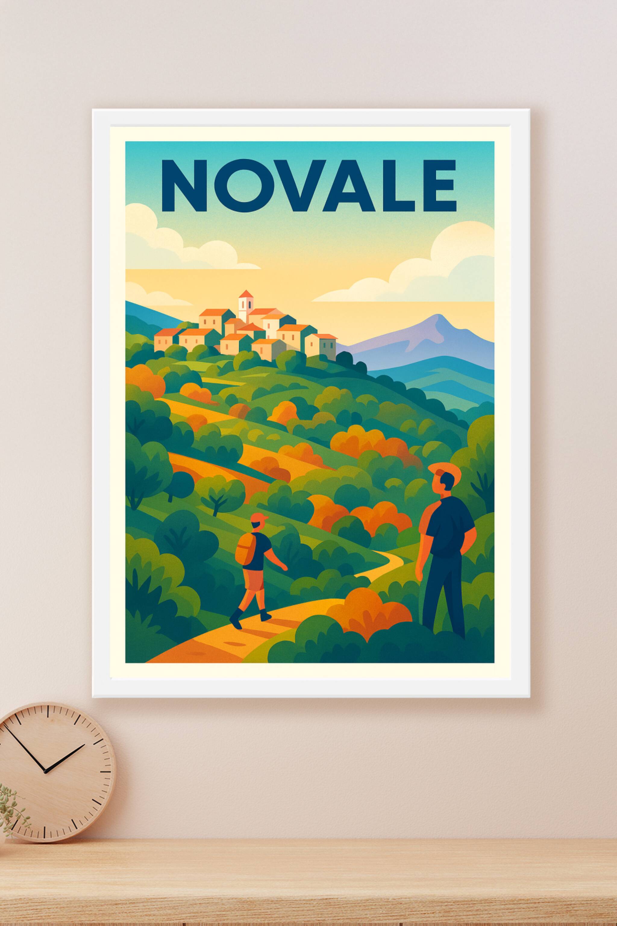 Découvrez la sérénité et la beauté authentique de Novale avec cette affiche illustrée aux couleurs chaudes et apaisantes. Ce poster invite à l'évasion en représentant un charmant village perché entouré de collines verdoyantes et de sentiers sinueux, parfait pour les amoureux de randonnée et de paysages naturels. Imprimé en tirage "Fine Art" sur papier 305g coton, cette affiche garantit une qualité d'impression supérieure, des couleurs profondes et une durabilité exceptionnelle. Disponible en formats A1 à A4, avec ou sans cadre, ce poster apportera une touche d'inspiration et de fraîcheur à votre intérieur. Une pièce unique à offrir ou à s'offrir pour embellir votre décoration tout en célébrant la douceur de vivre à Novale.
