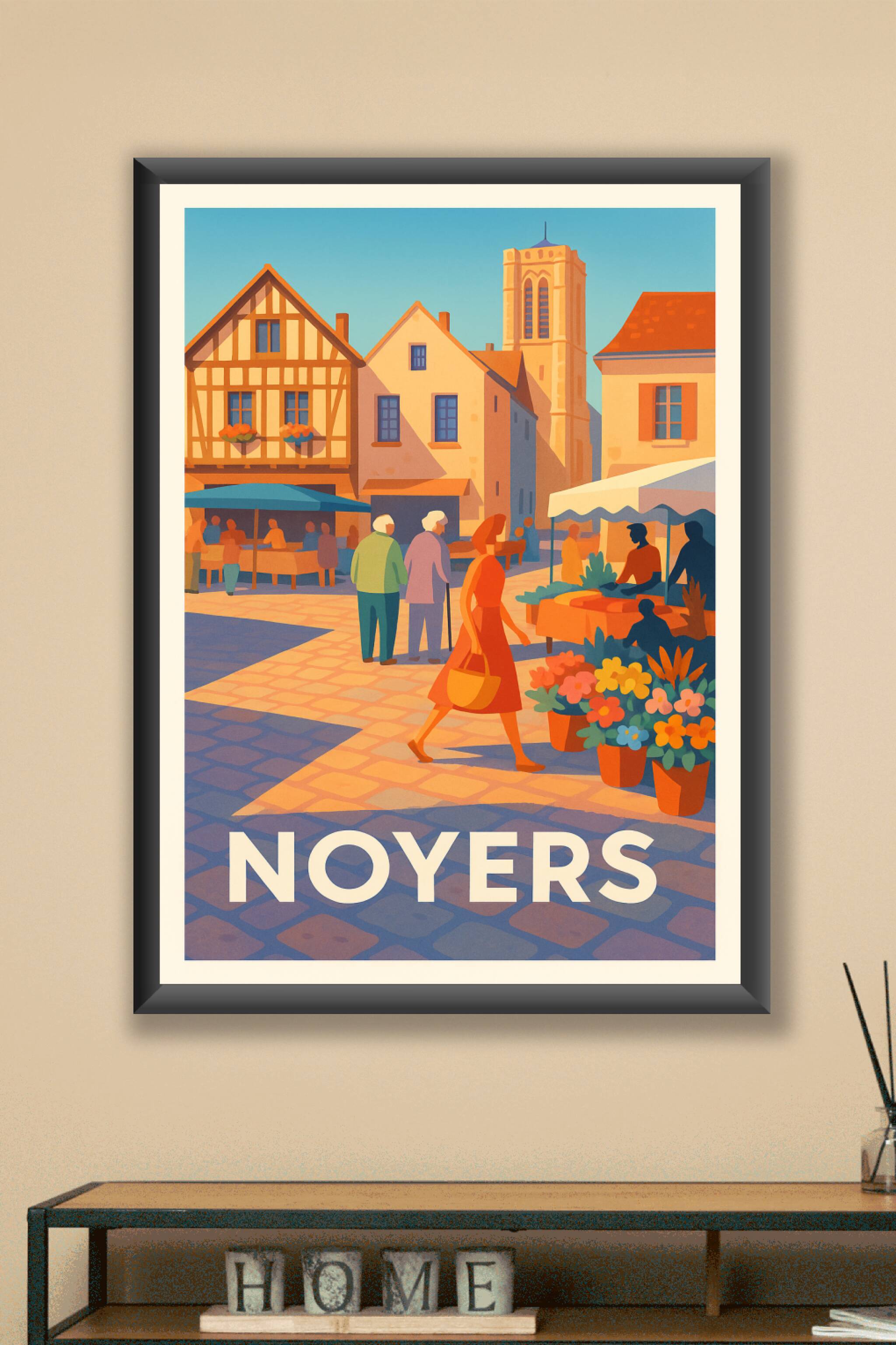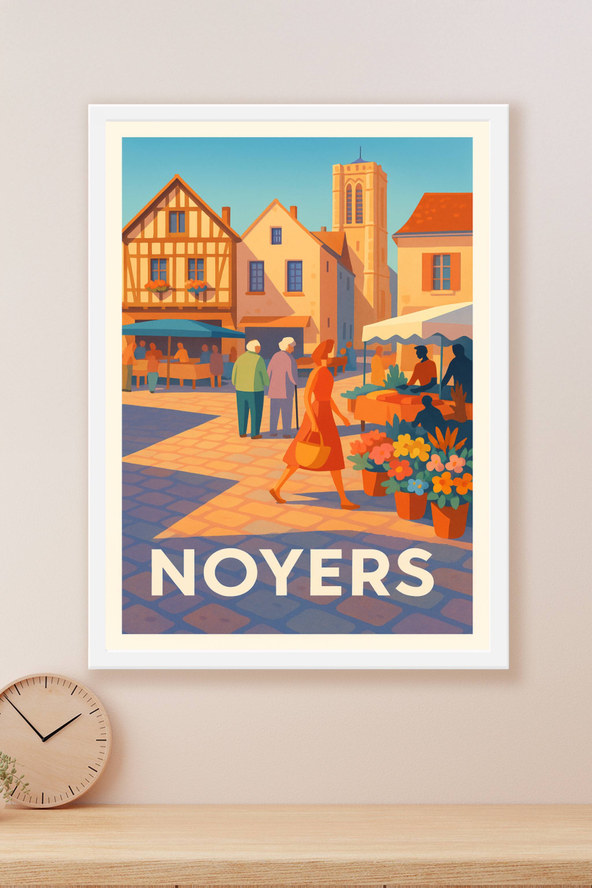 Découvrez l'atmosphère chaleureuse et pittoresque de Noyers à travers cette affiche illustrée qui capture la douceur de vivre sur la place du march...