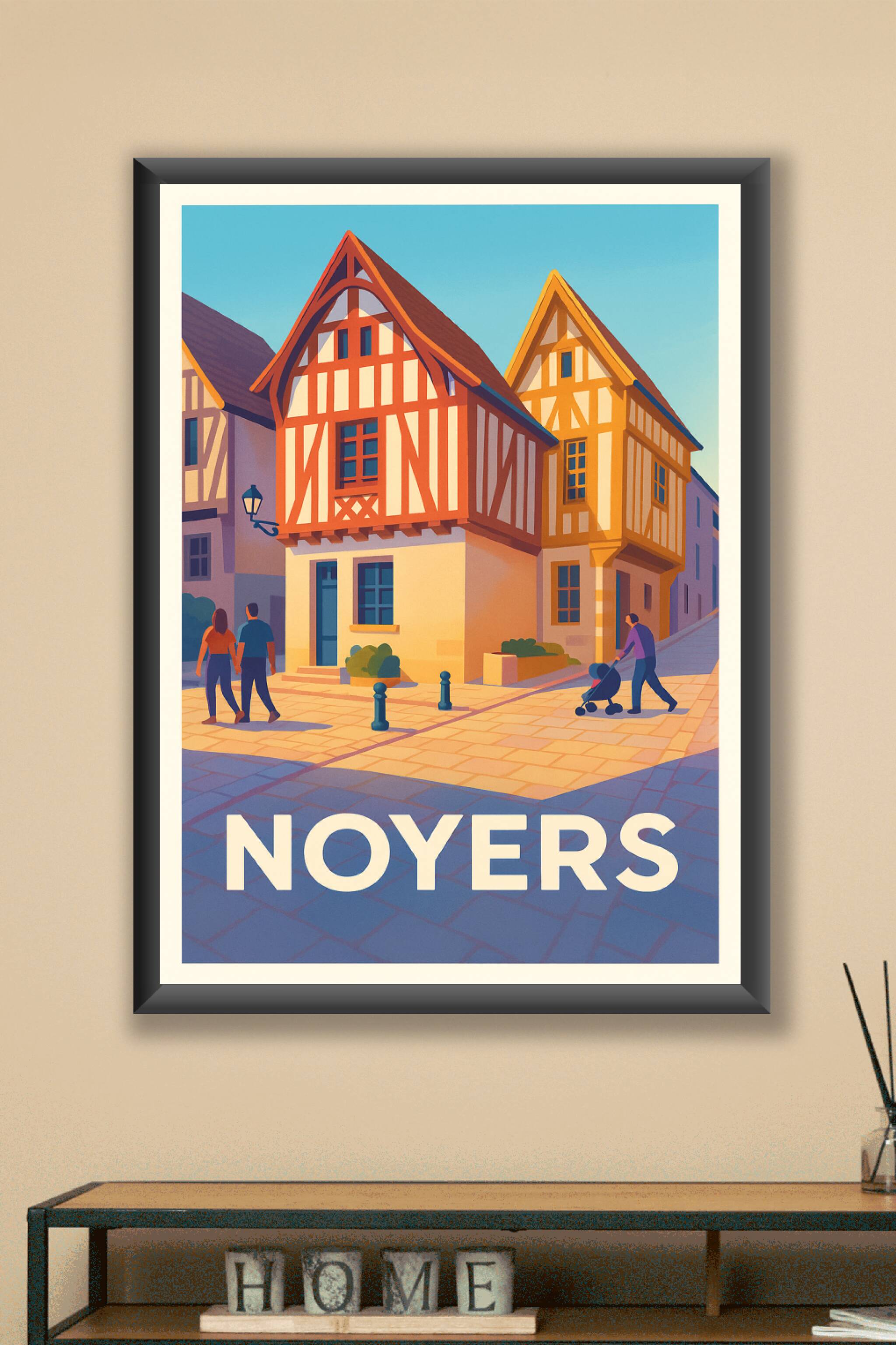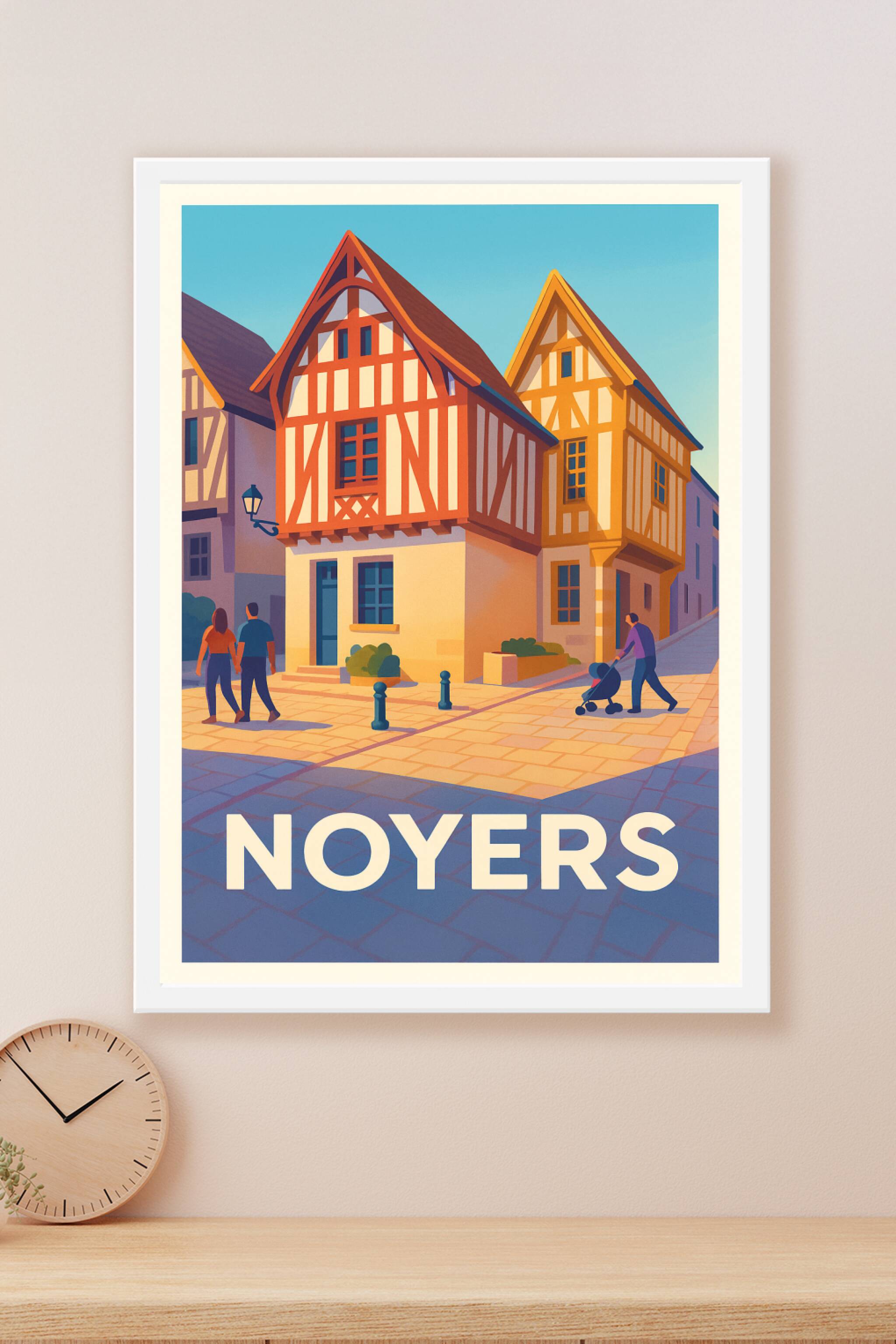 Découvrez le charme authentique de Noyers avec cette affiche illustrée mettant en valeur ses maisons à colombages typiques baignées de lumière doré...
