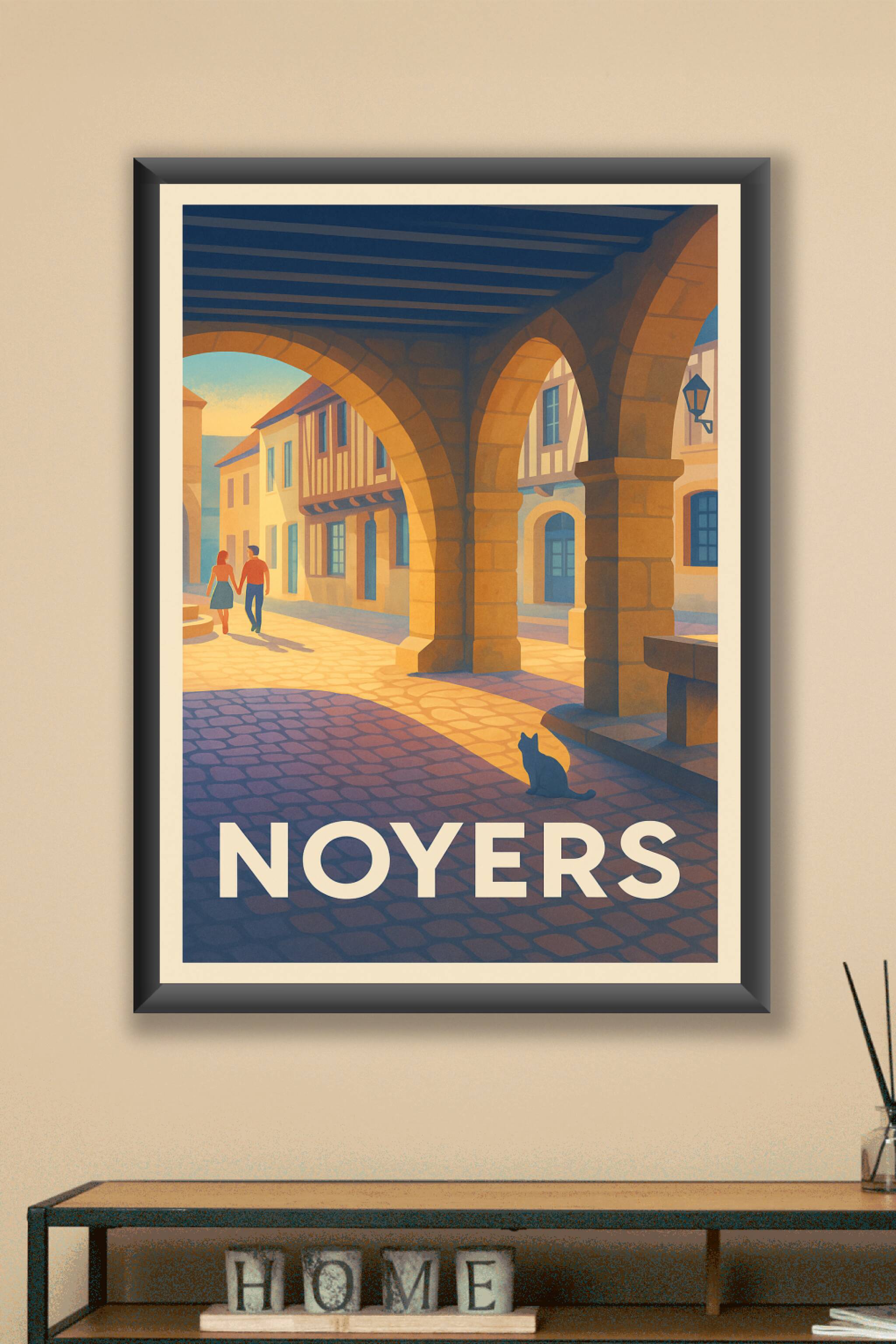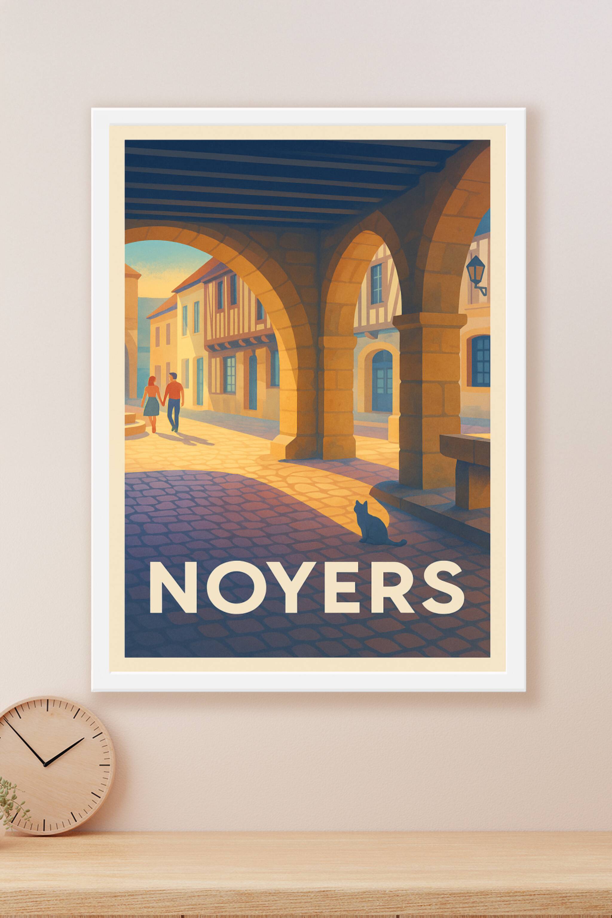 Découvrez l'atmosphère paisible et authentique de Noyers à travers cette affiche illustrée aux teintes chaleureuses. Le poster capture une scène emblématique sous les arcades médiévales, où la lumière dorée du soleil éclaire les pavés et révèle la beauté des maisons à colombages, symboles du patrimoine de cette charmante cité. Imprimée en tirage "Fine Art" sur papier 305g coton, cette affiche garantit une qualité d'impression remarquable et une longue durabilité des couleurs. Disponible en formats A1 à A4, avec ou sans cadre, elle s'adapte parfaitement à votre décoration intérieure. Offrez-vous ou offrez à vos proches un souvenir élégant de Noyers, conjuguant histoire et douceur de vivre.