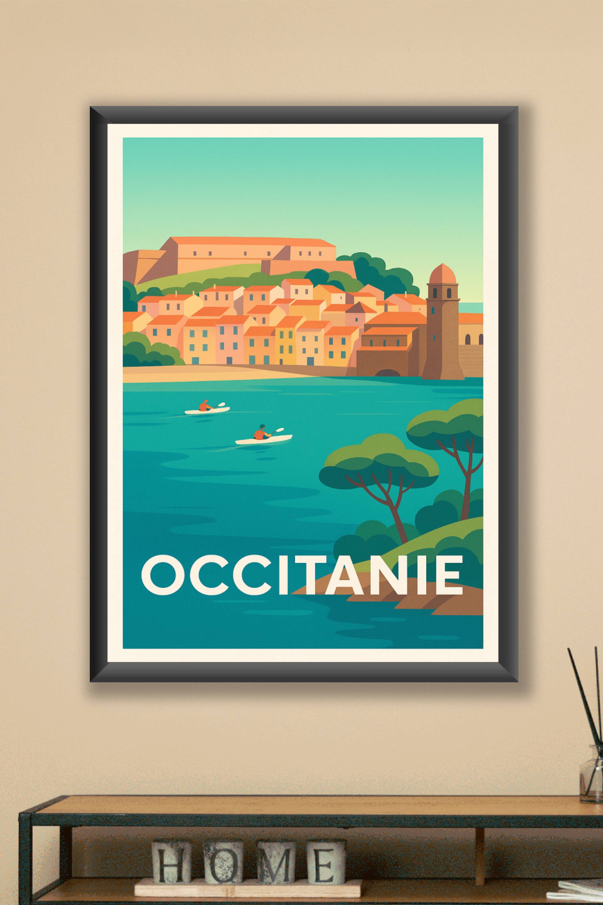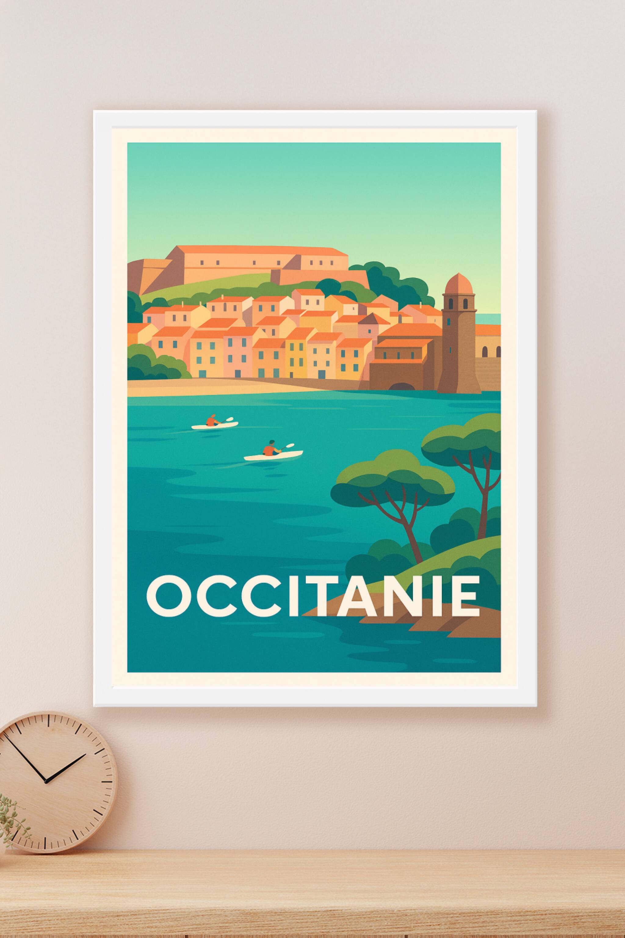Apportez une touche de douceur méditerranéenne à votre intérieur avec cette affiche illustrée représentant la charmante région d'Occitanie et ses p...