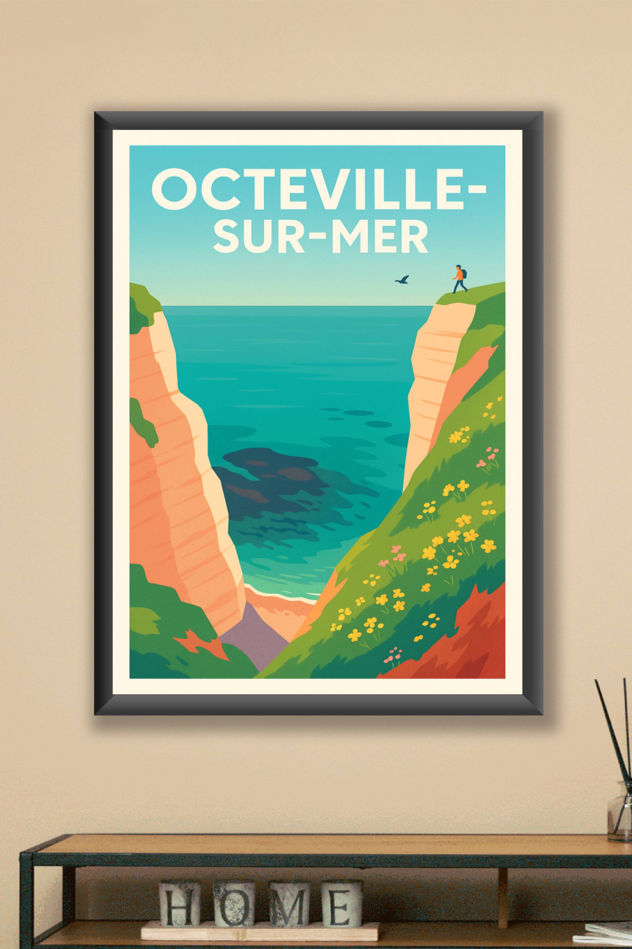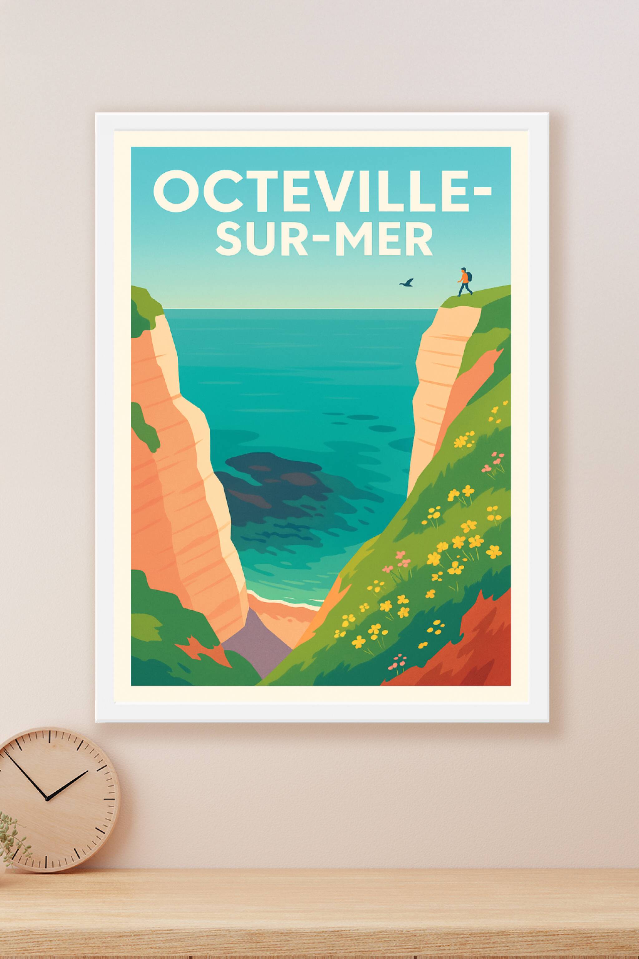Découvrez Octeville-sur-Mer à travers cette affiche captivante qui met en lumière ses majestueuses falaises et son océan apaisant. Ce poster au des...