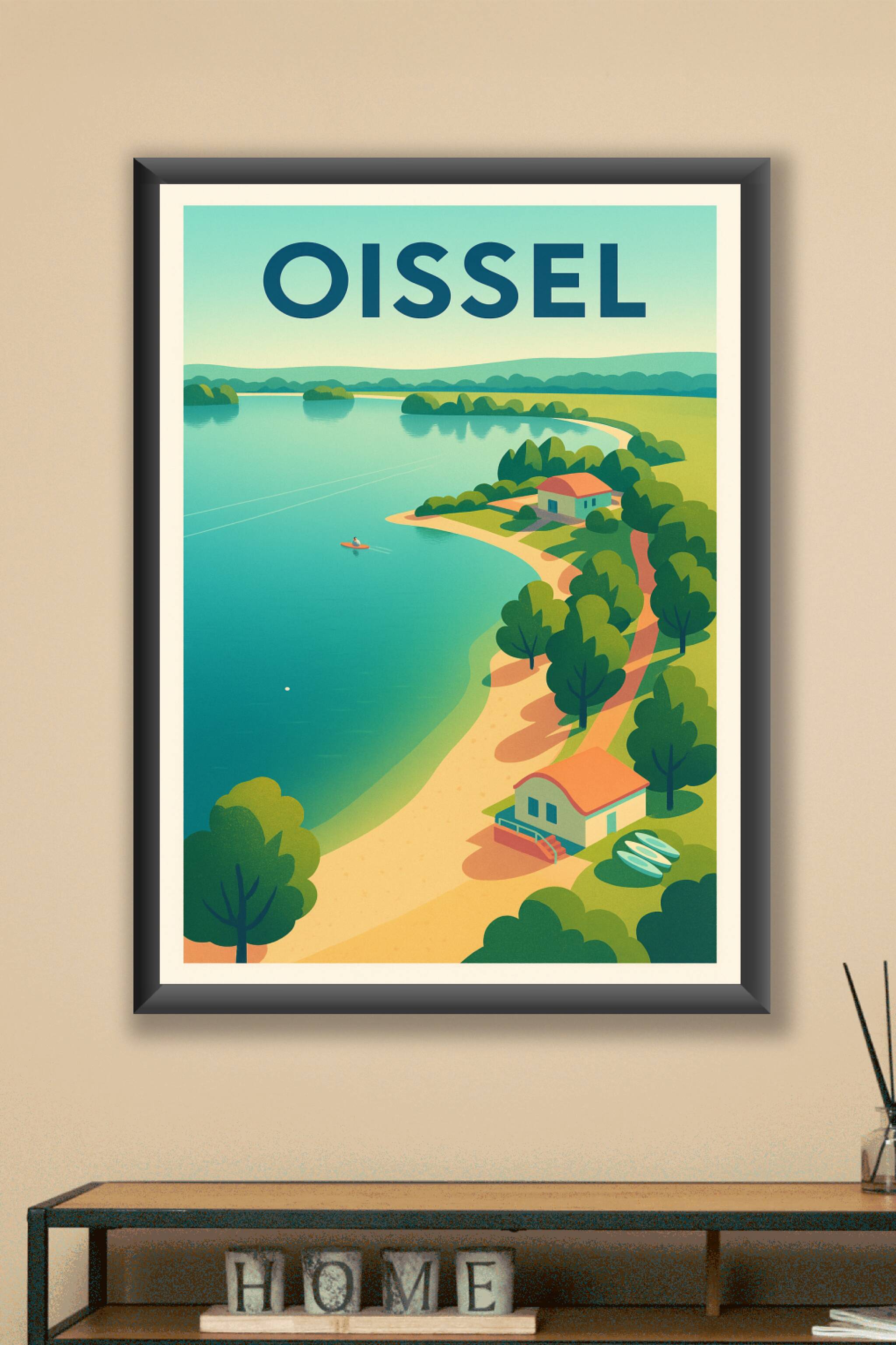 Découvrez la sérénité d'Oissel avec cette affiche illustrée qui capture un paysage idyllique au bord d'un lac paisible, bordé de chemins ombragés e...