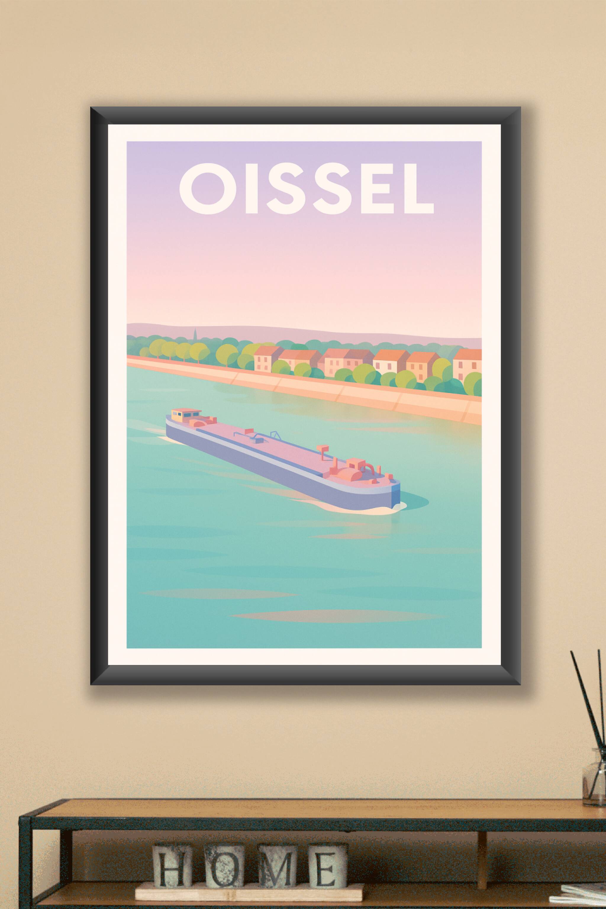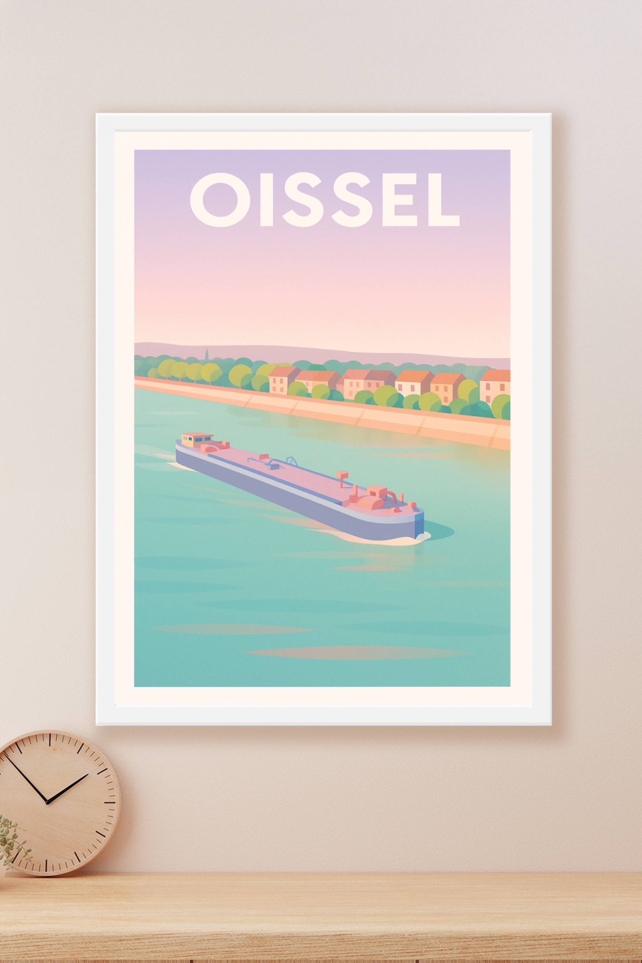 Découvrez la douceur du paysage fluvial d'Oissel avec cette affiche au design épuré et aux couleurs pastel apaisantes. Ce poster met en scène un ba...
