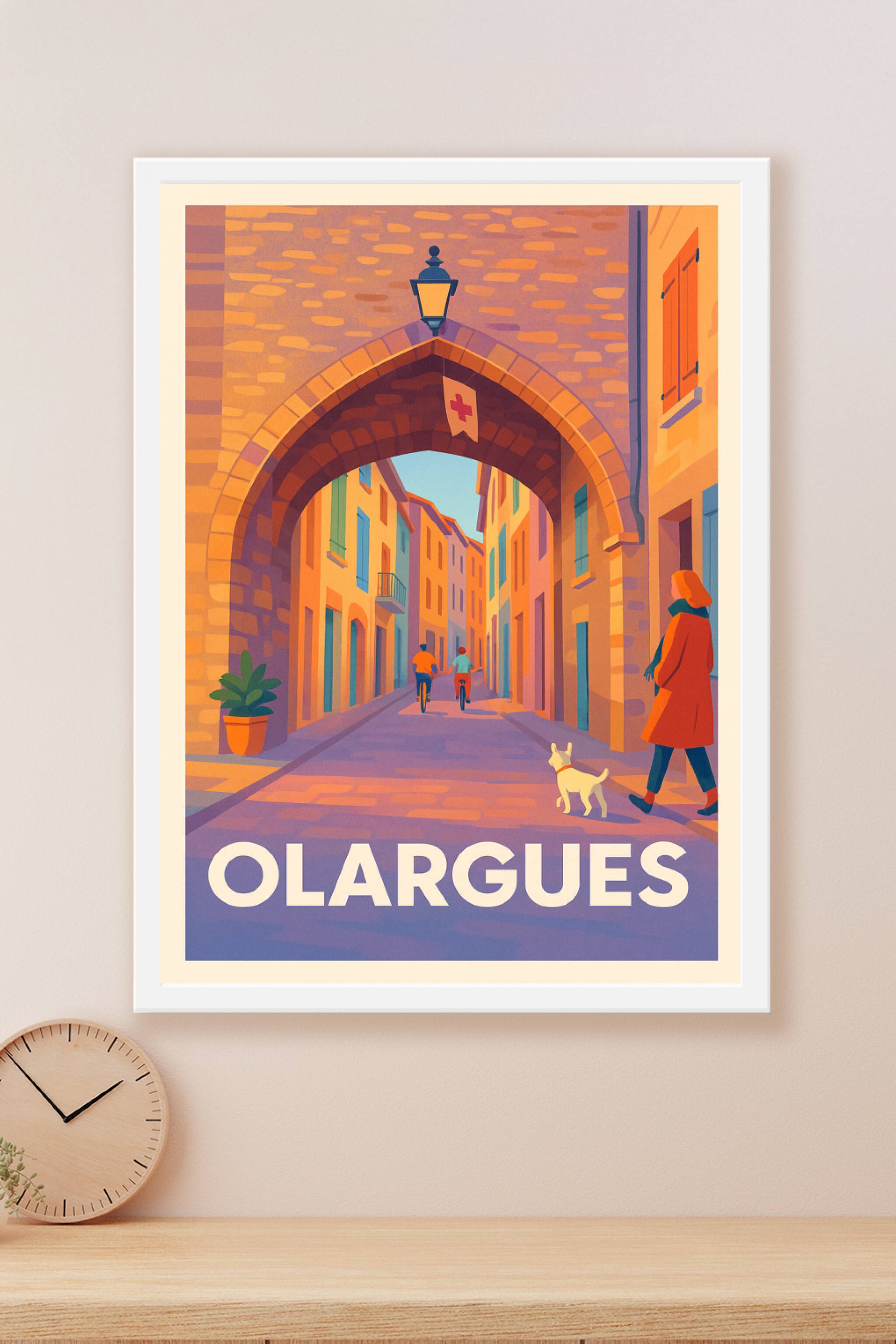 Découvrez le charme authentique d'Olargues avec cette affiche illustrée mettant en scène une typique ruelle médiévale sous une arche de pierre cara...