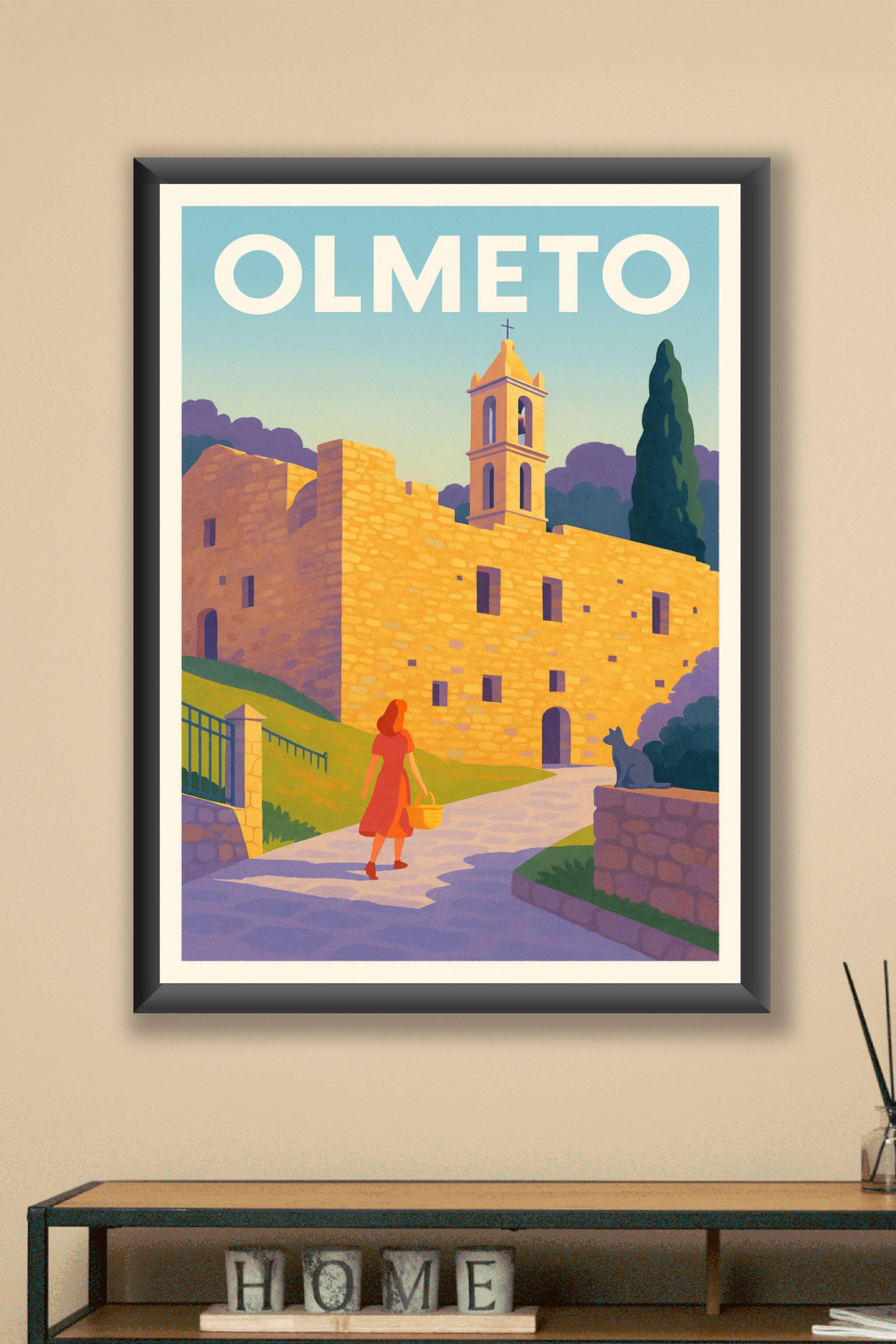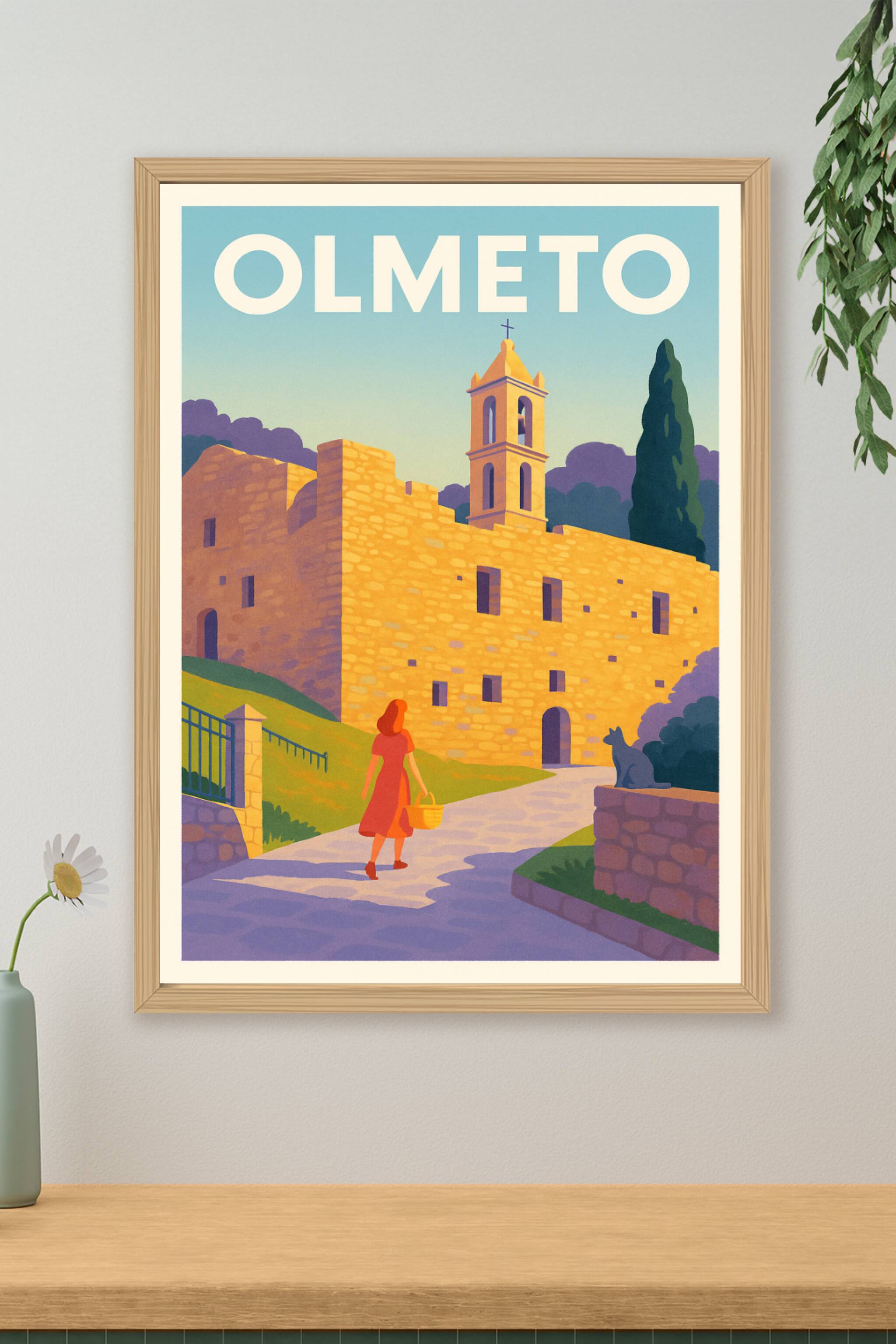 Découvrez l’atmosphère paisible d'Olmeto avec cette affiche illustrée mettant en scène un ancien édifice en pierre baigné par la lumière douce du s...