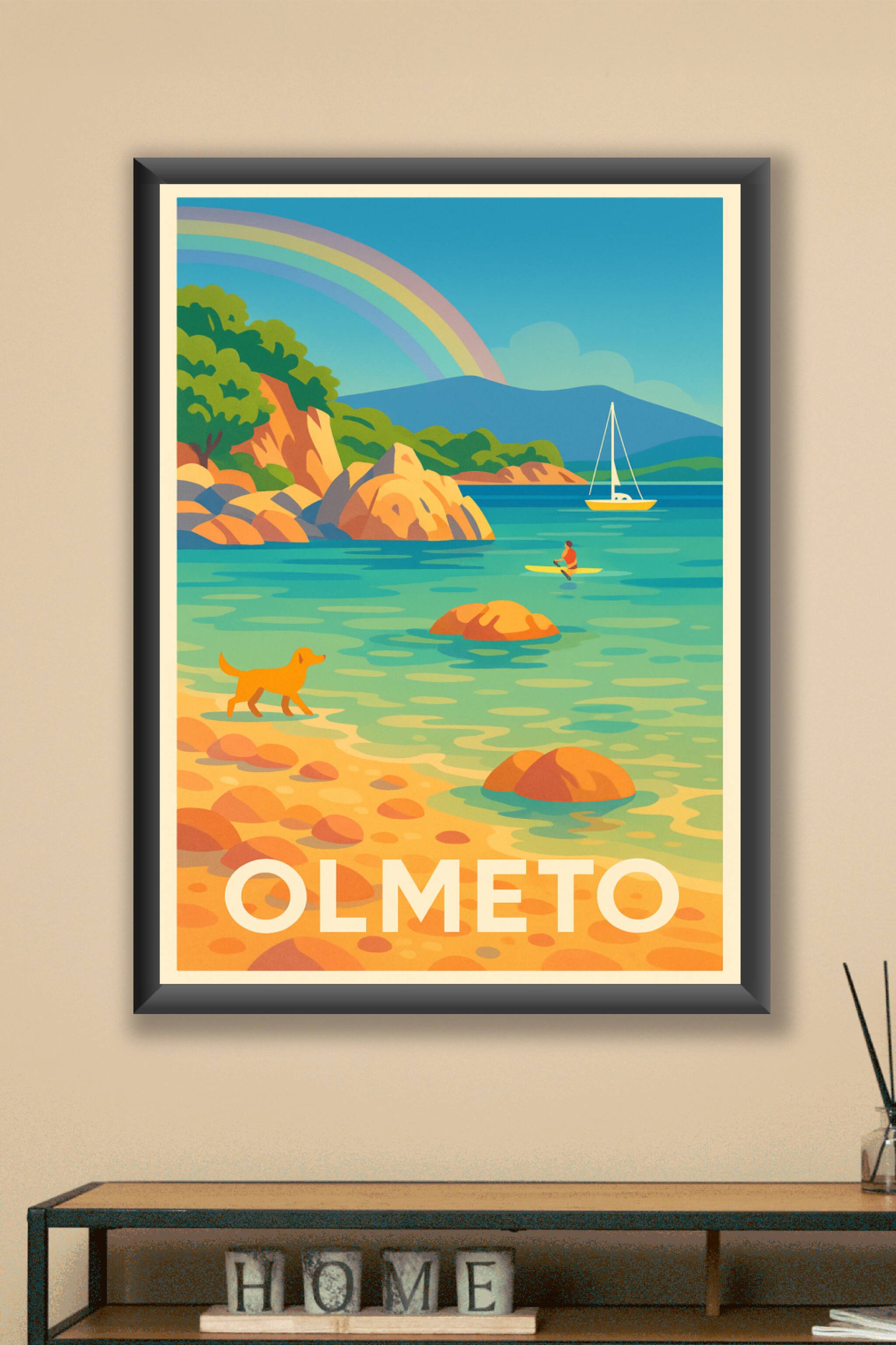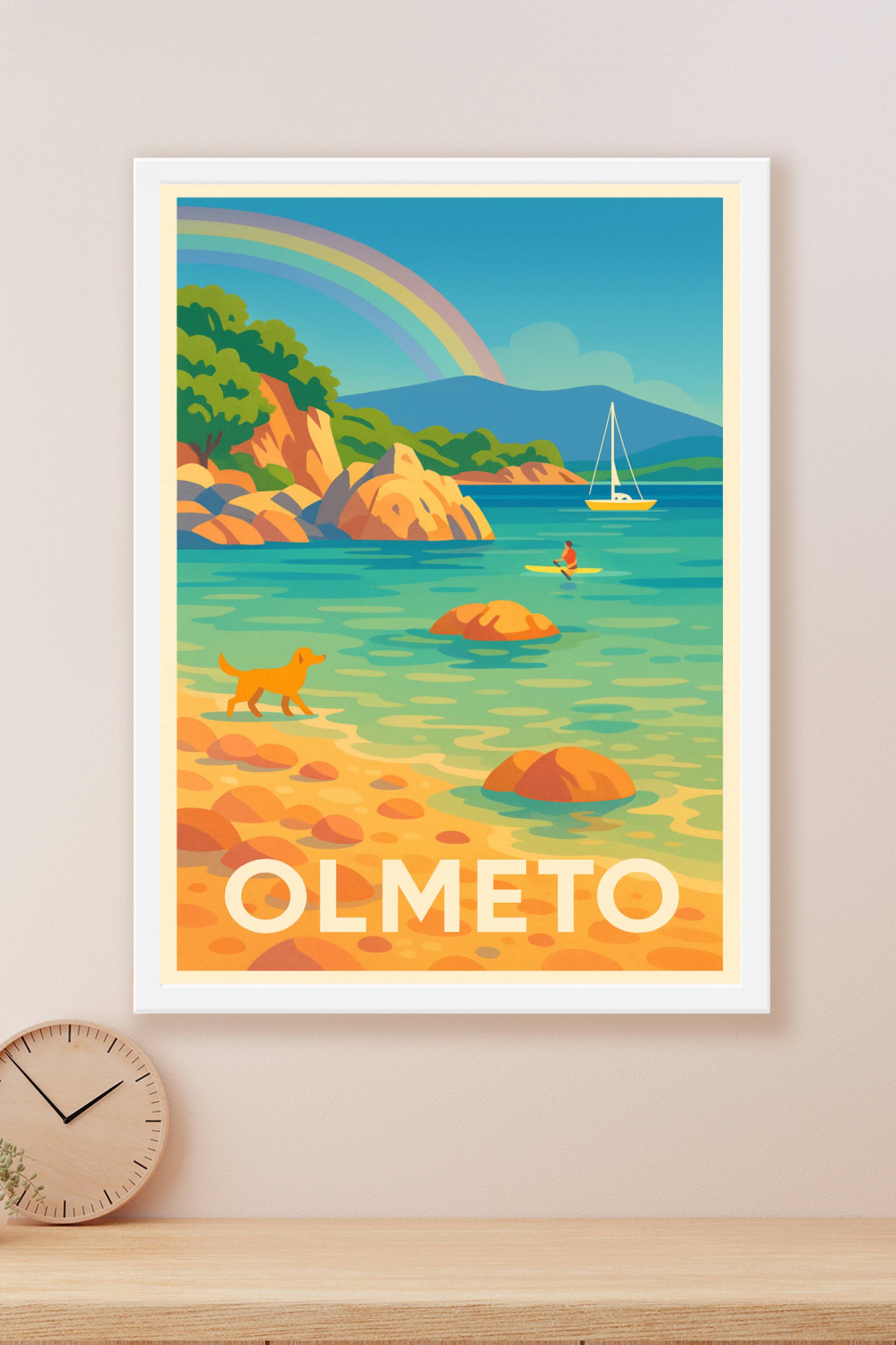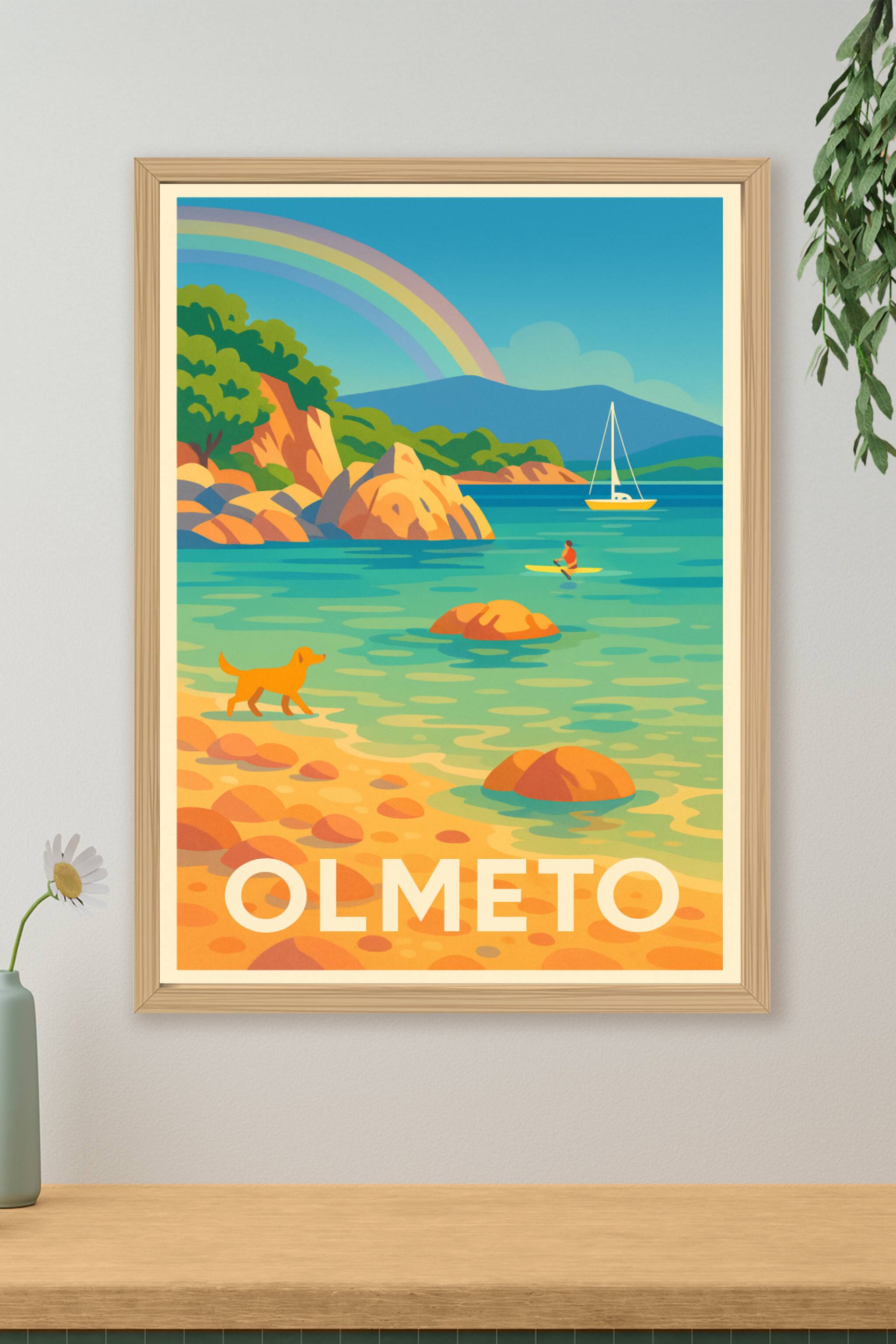 Découvrez la sérénité côtière d'Olmeto avec cette affiche illustrée aux couleurs vibrantes et apaisantes. Cette scène idyllique met en avant une pl...