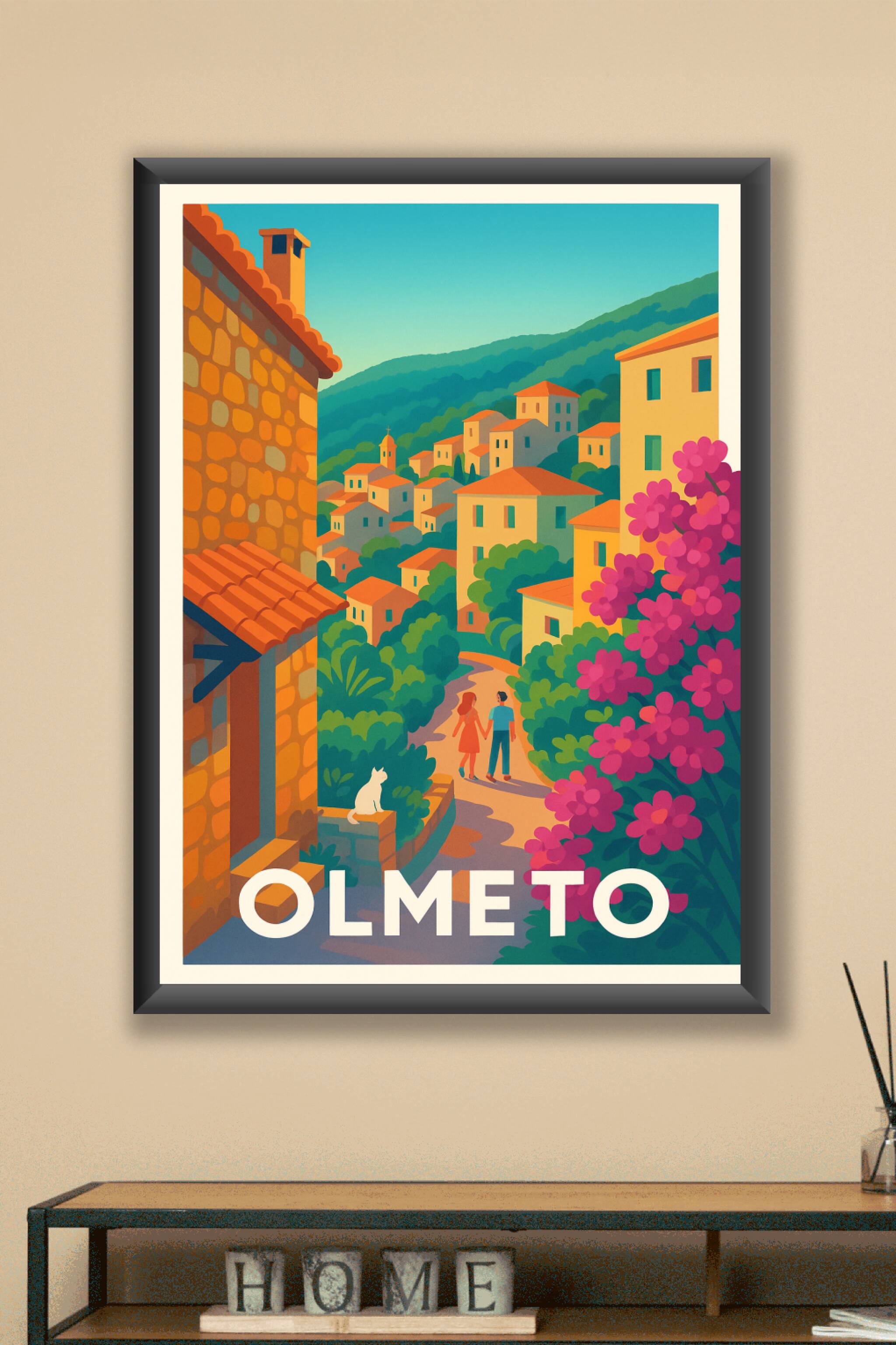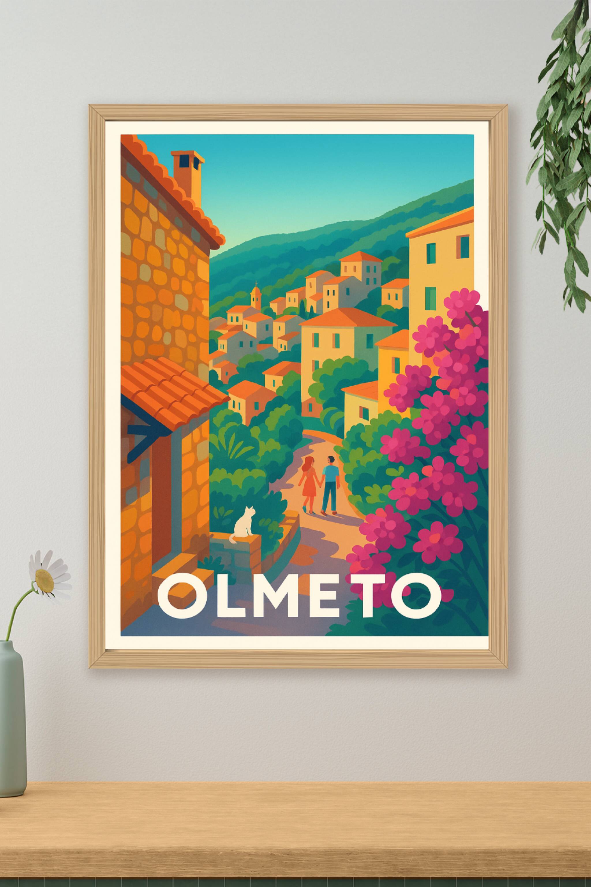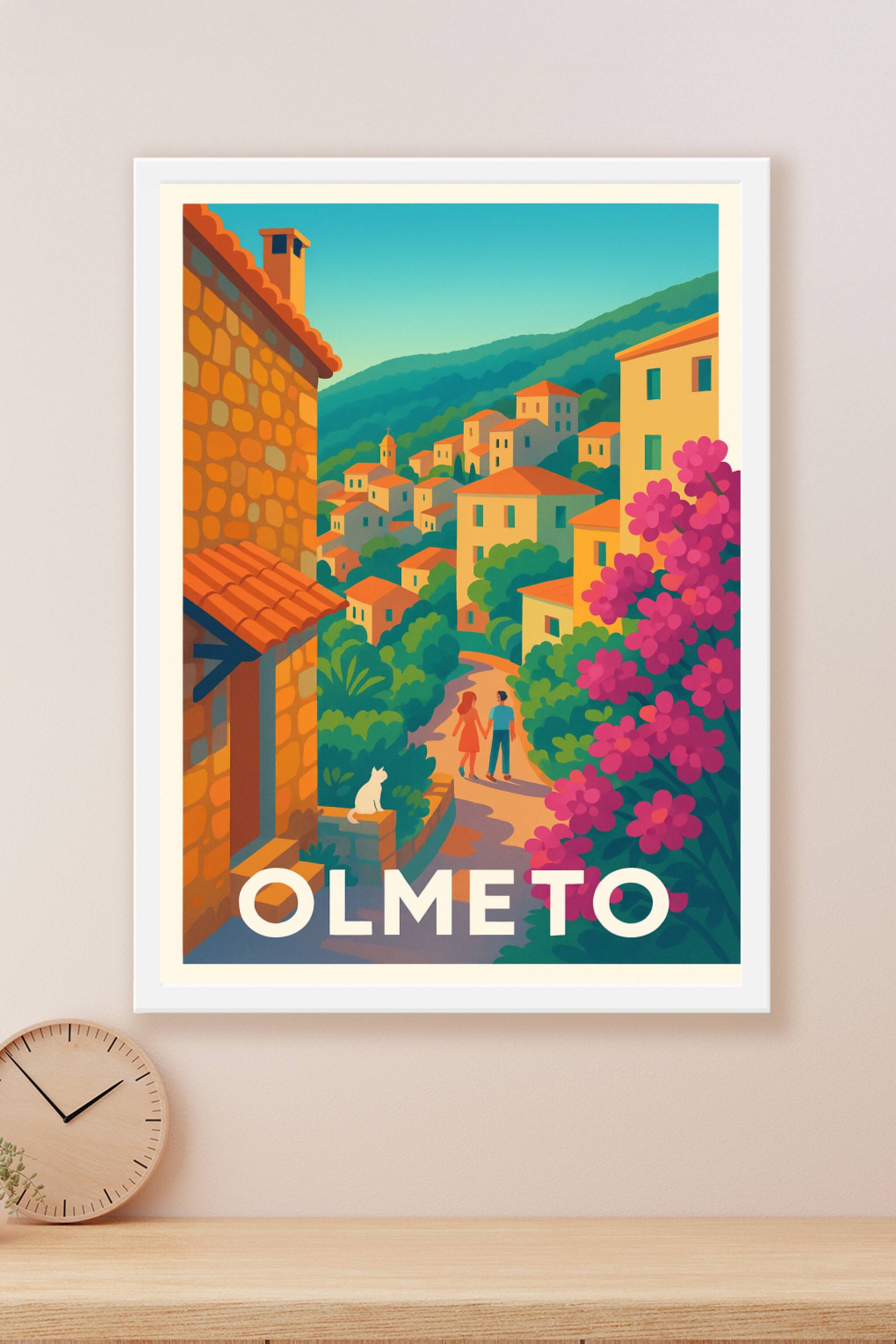 Découvrez la douceur de vivre à Olmeto avec cette affiche illustrée aux couleurs chaudes et apaisantes qui capture l'essence d'un village corse typ...