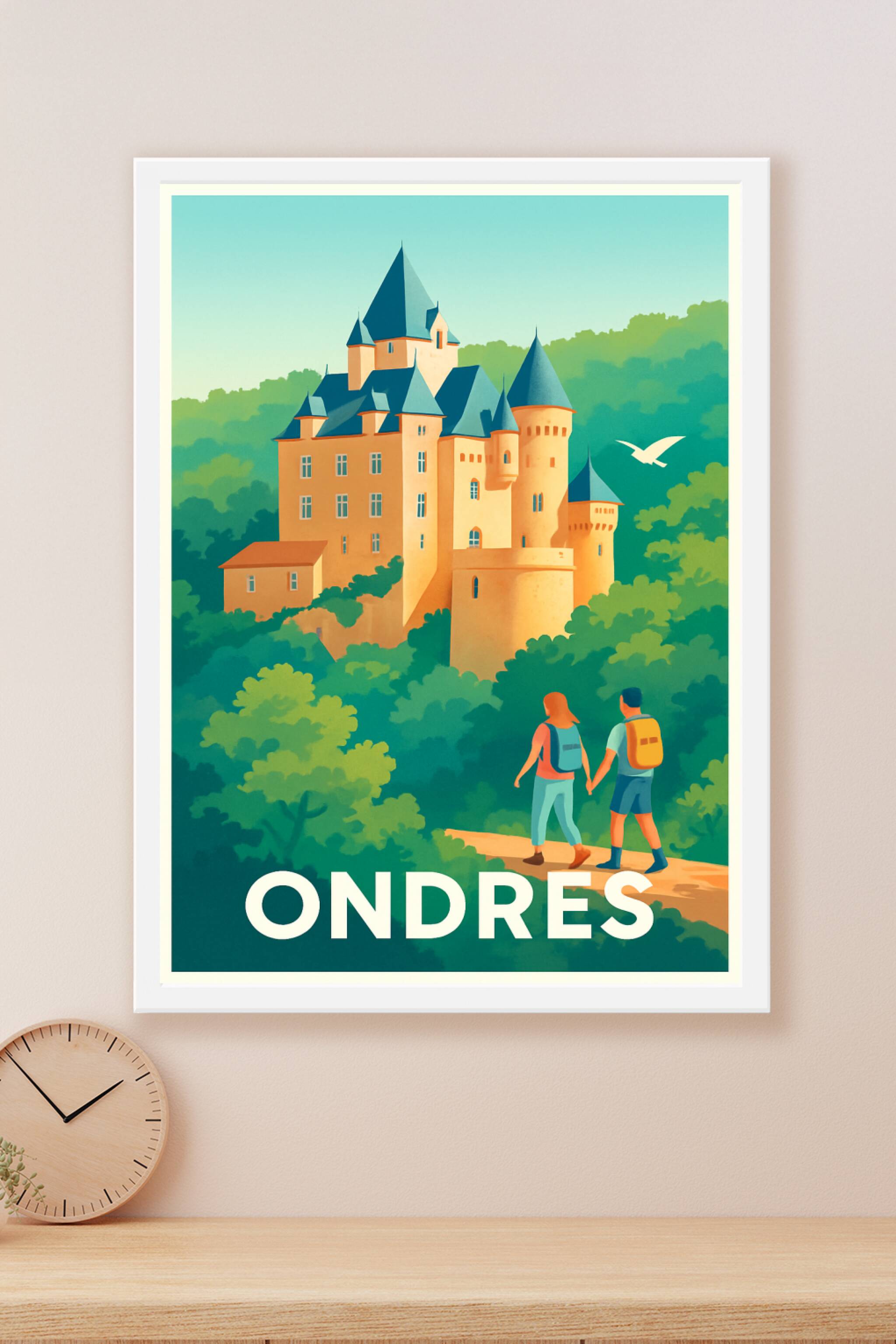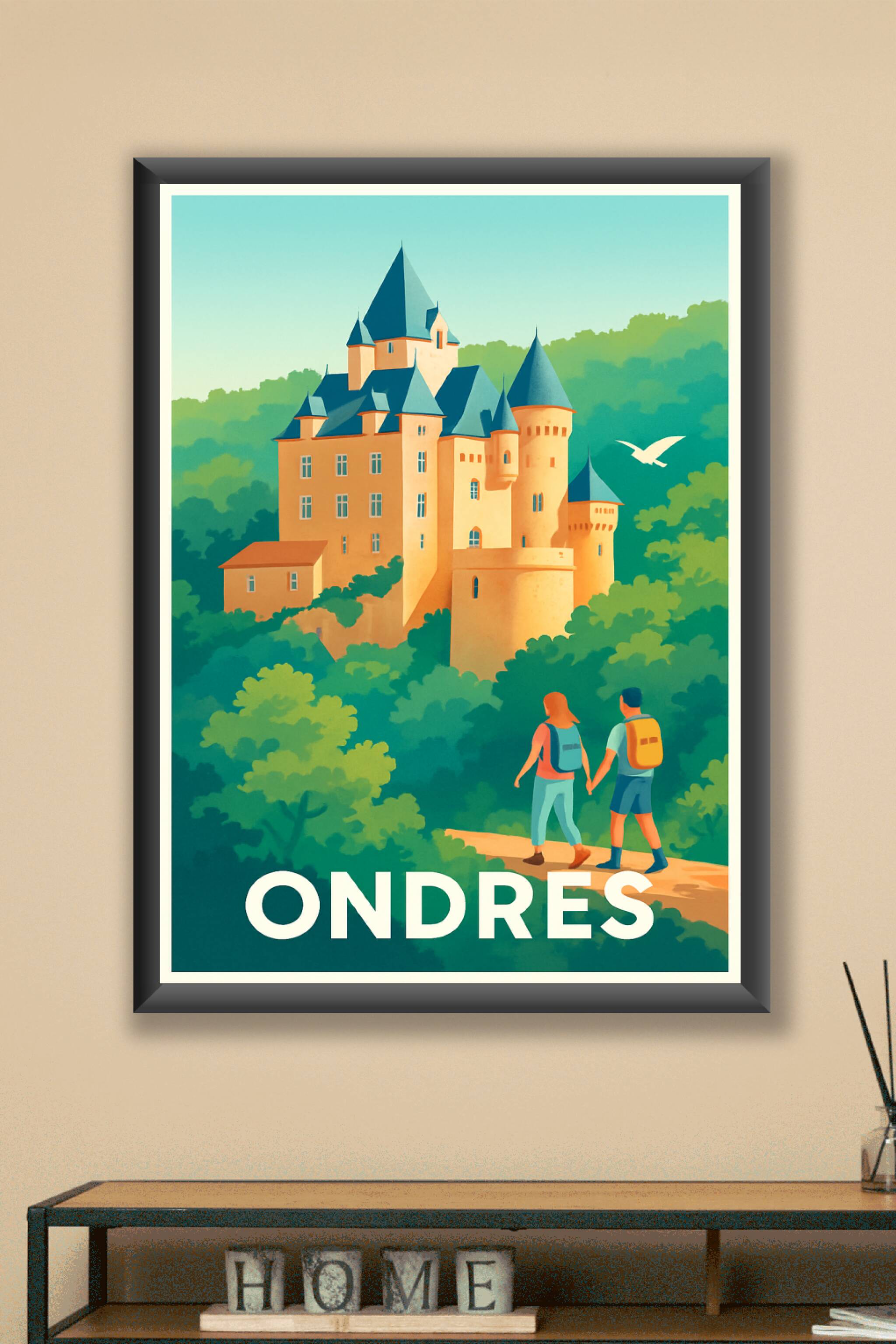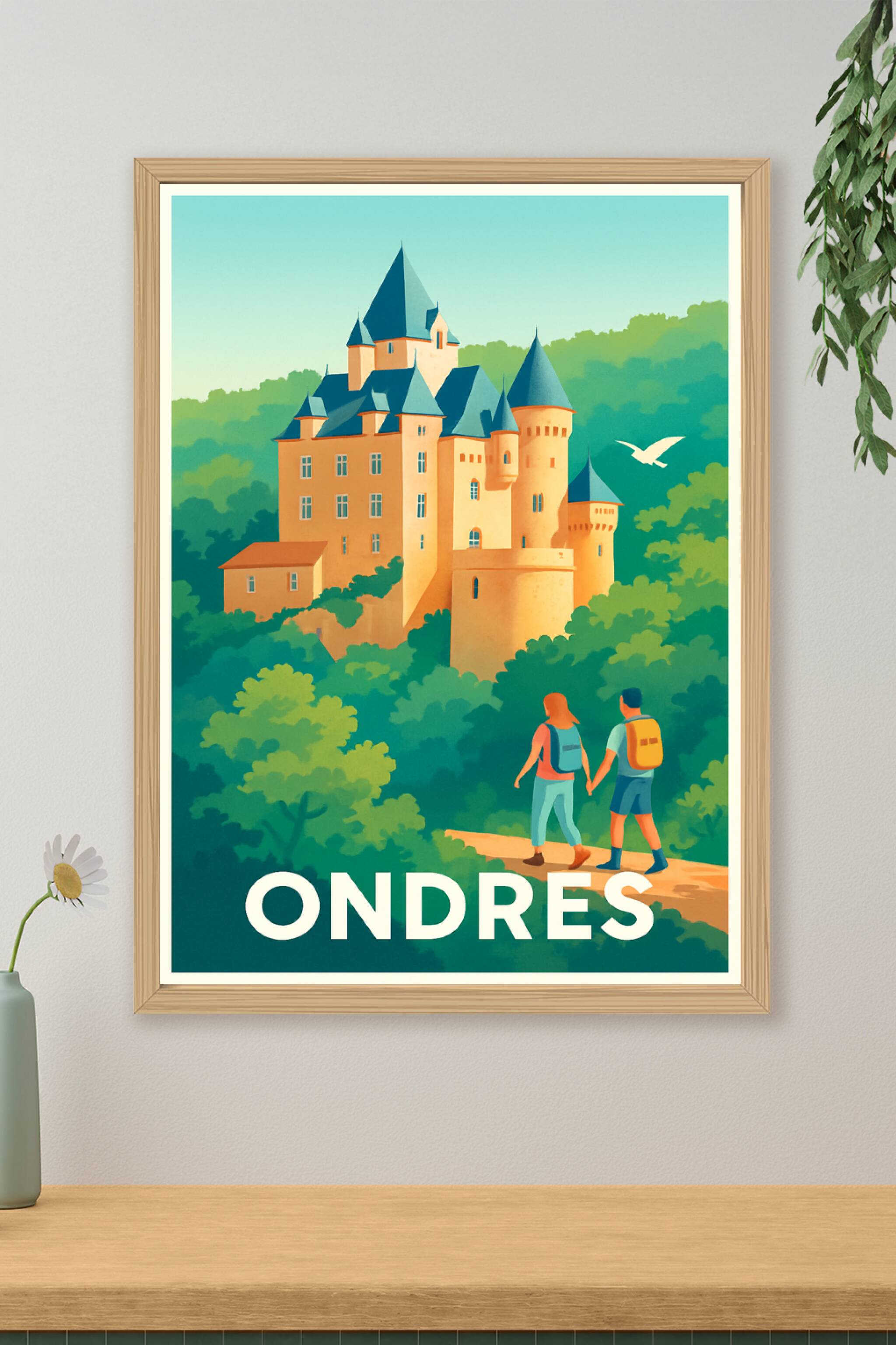Découvrez la douceur et le charme d'Ondres à travers cette affiche illustrée mettant en avant un magnifique château entouré de verdure luxuriante e...