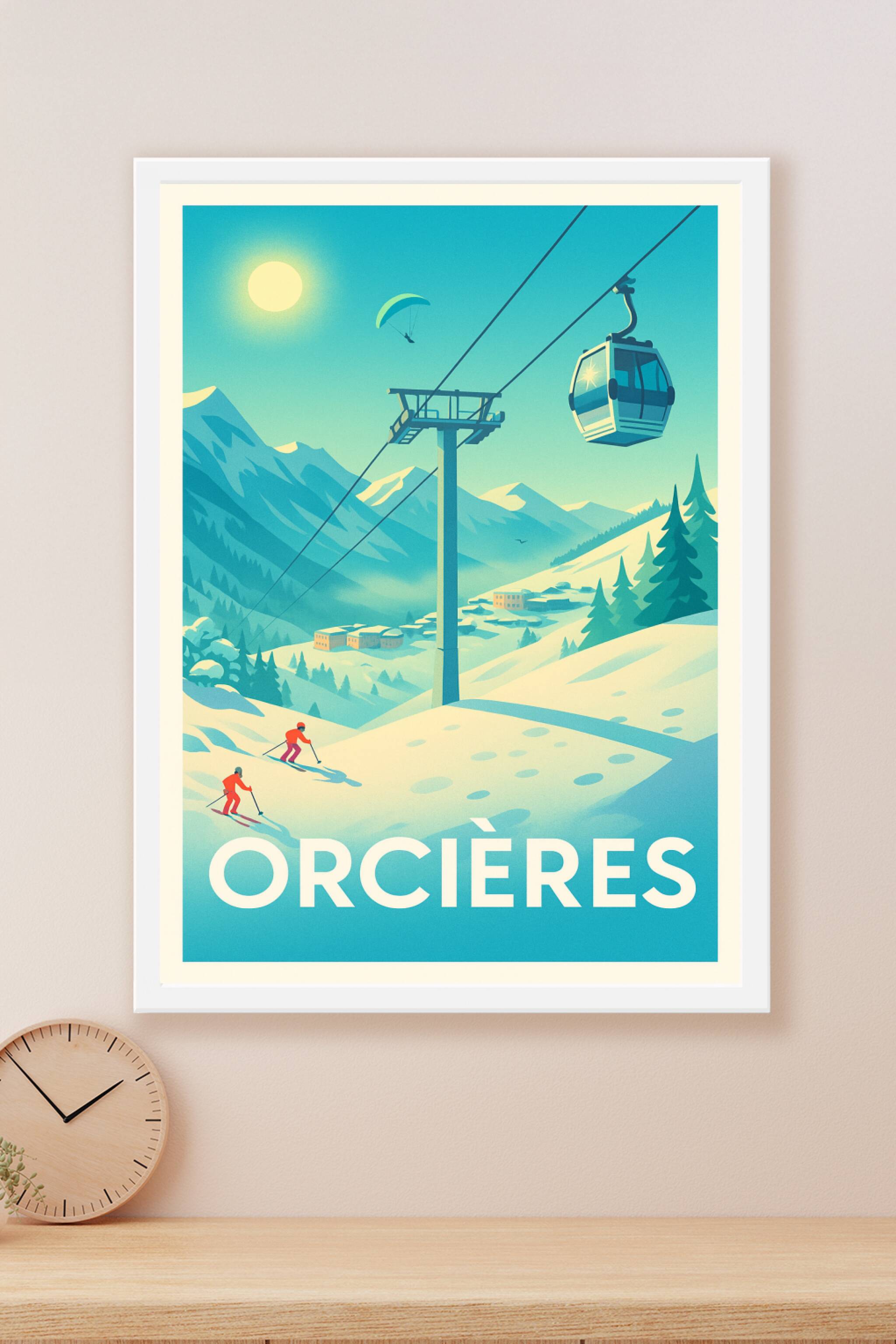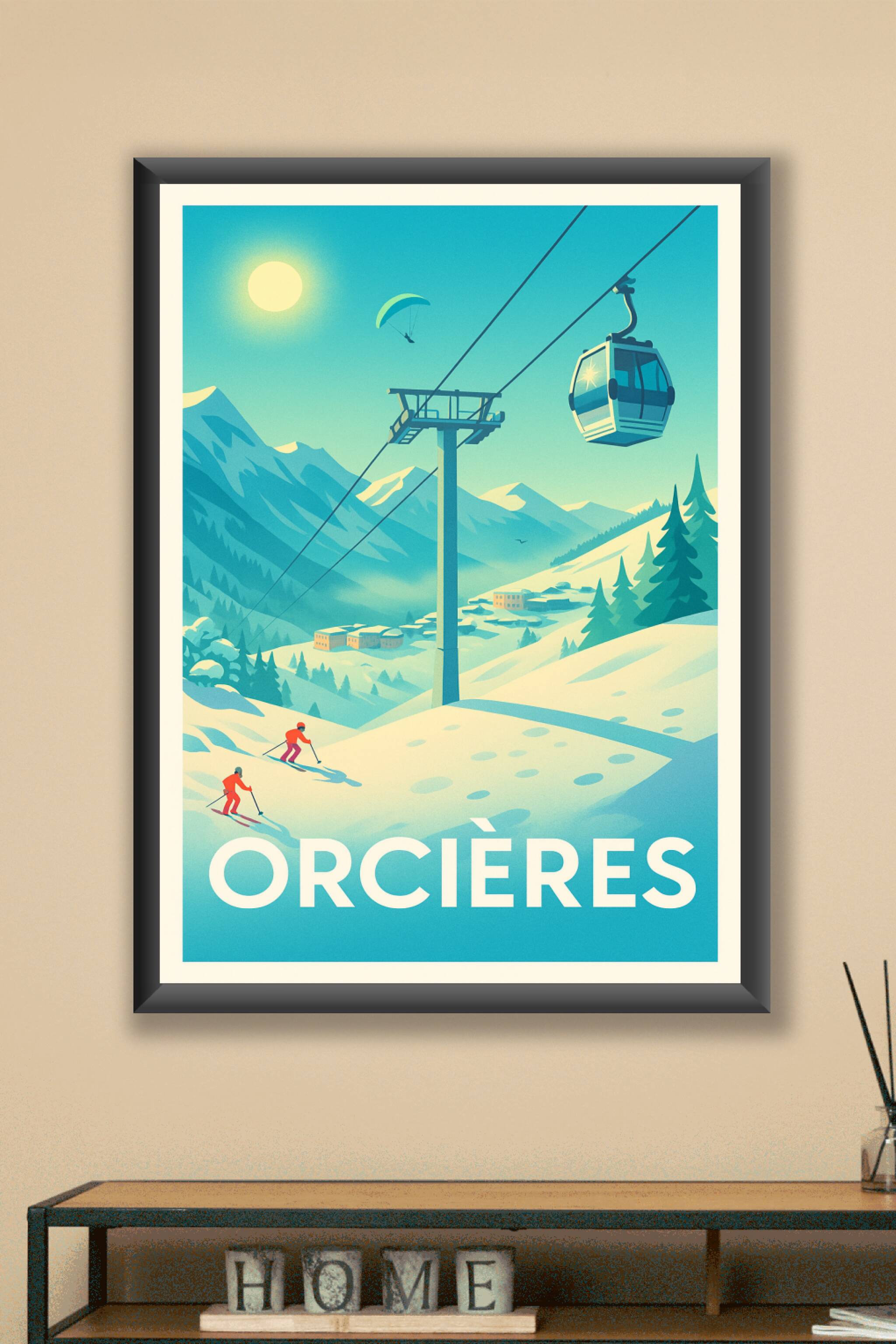 Découvrez la beauté hivernale d'Orcières avec cette affiche représentant des skieurs glissant sur les pentes enneigées, un téléphérique moderne et ...