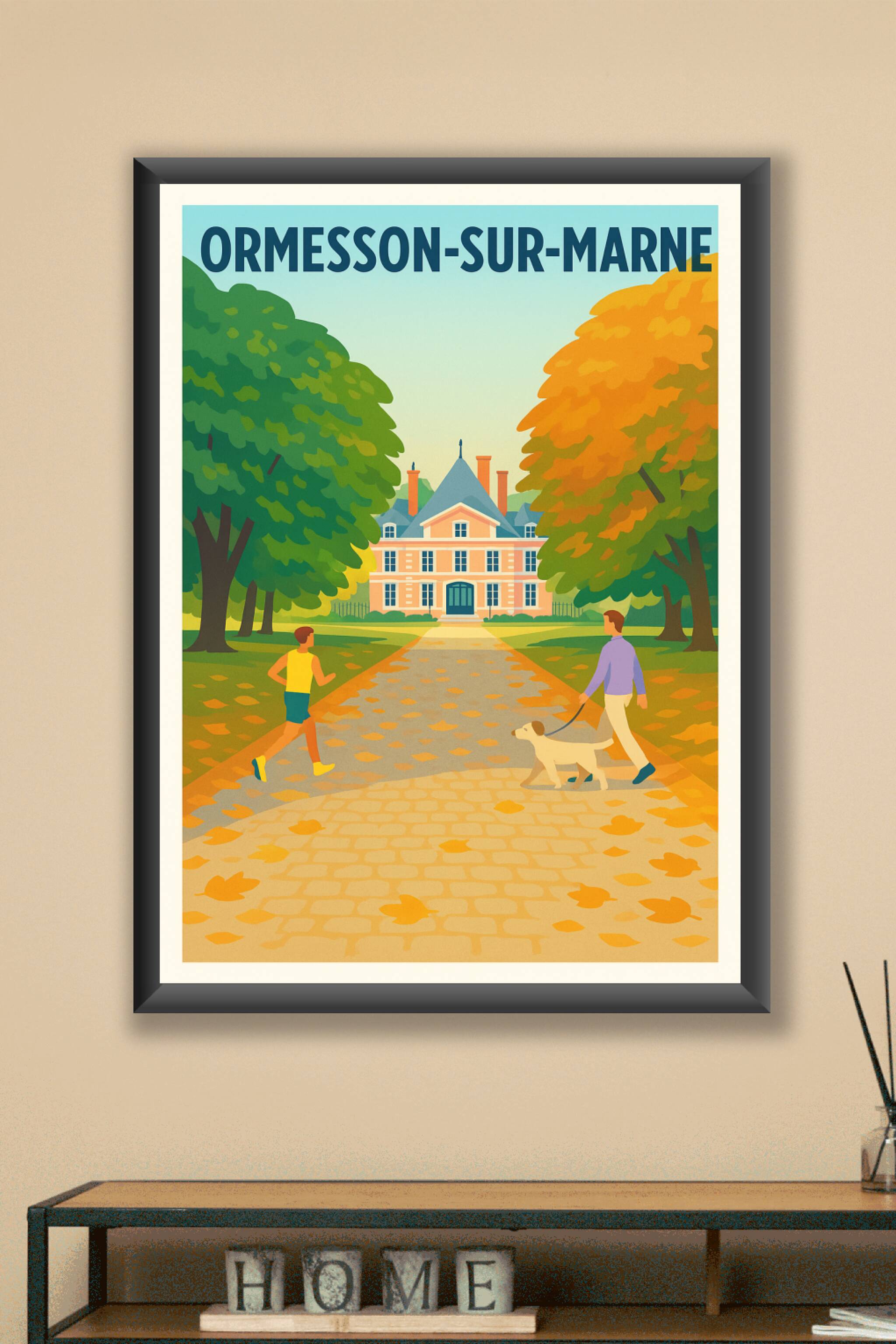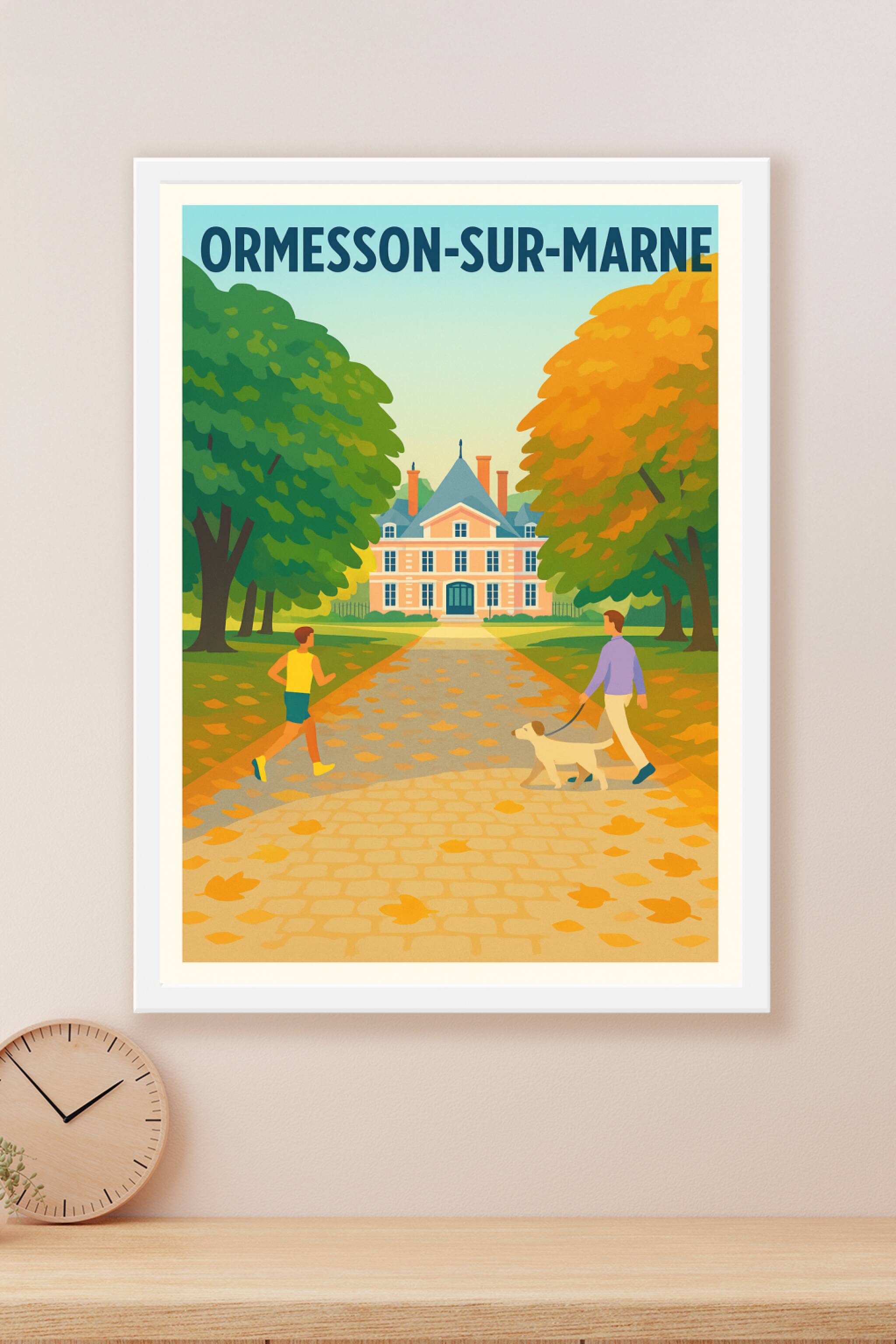Découvrez cette affiche illustrée qui capture l'essence paisible d'Ormesson-sur-Marne en plein automne, avec son château emblématique bordé d'arbre...