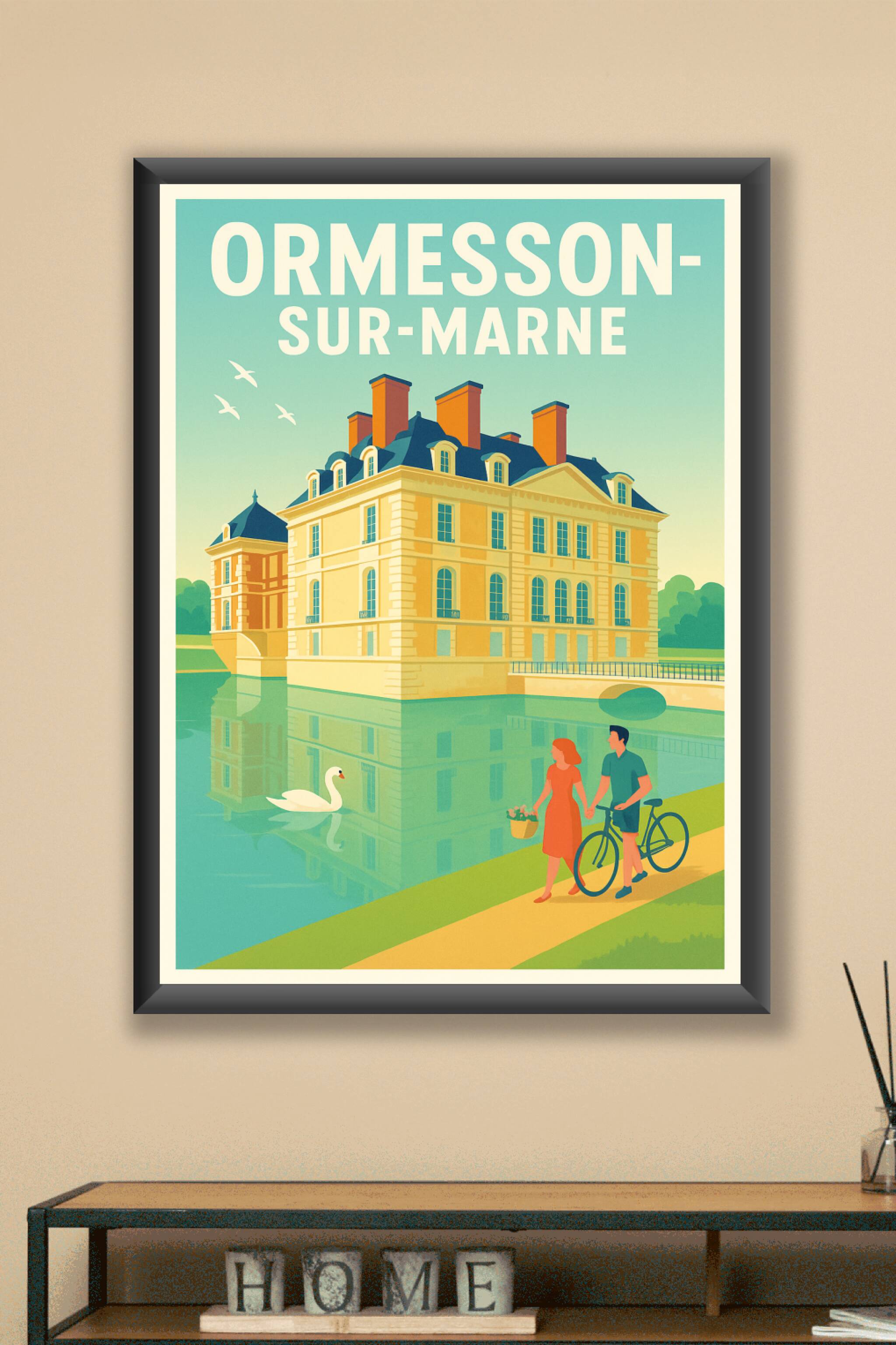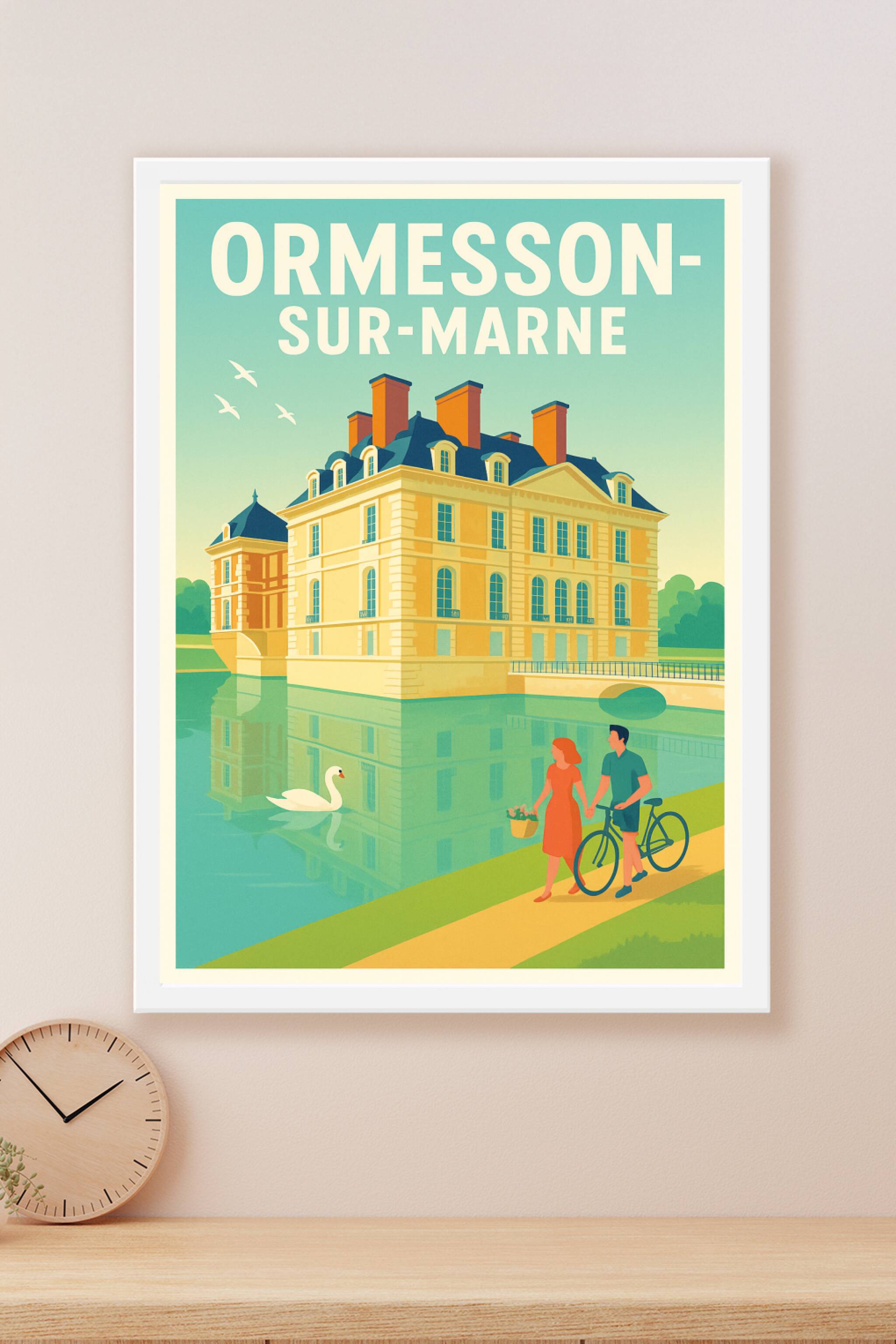 Découvrez l'élégance et la douceur de vivre à Ormesson-sur-Marne avec cette affiche illustrée mettant en scène son magnifique château entouré d'eau...