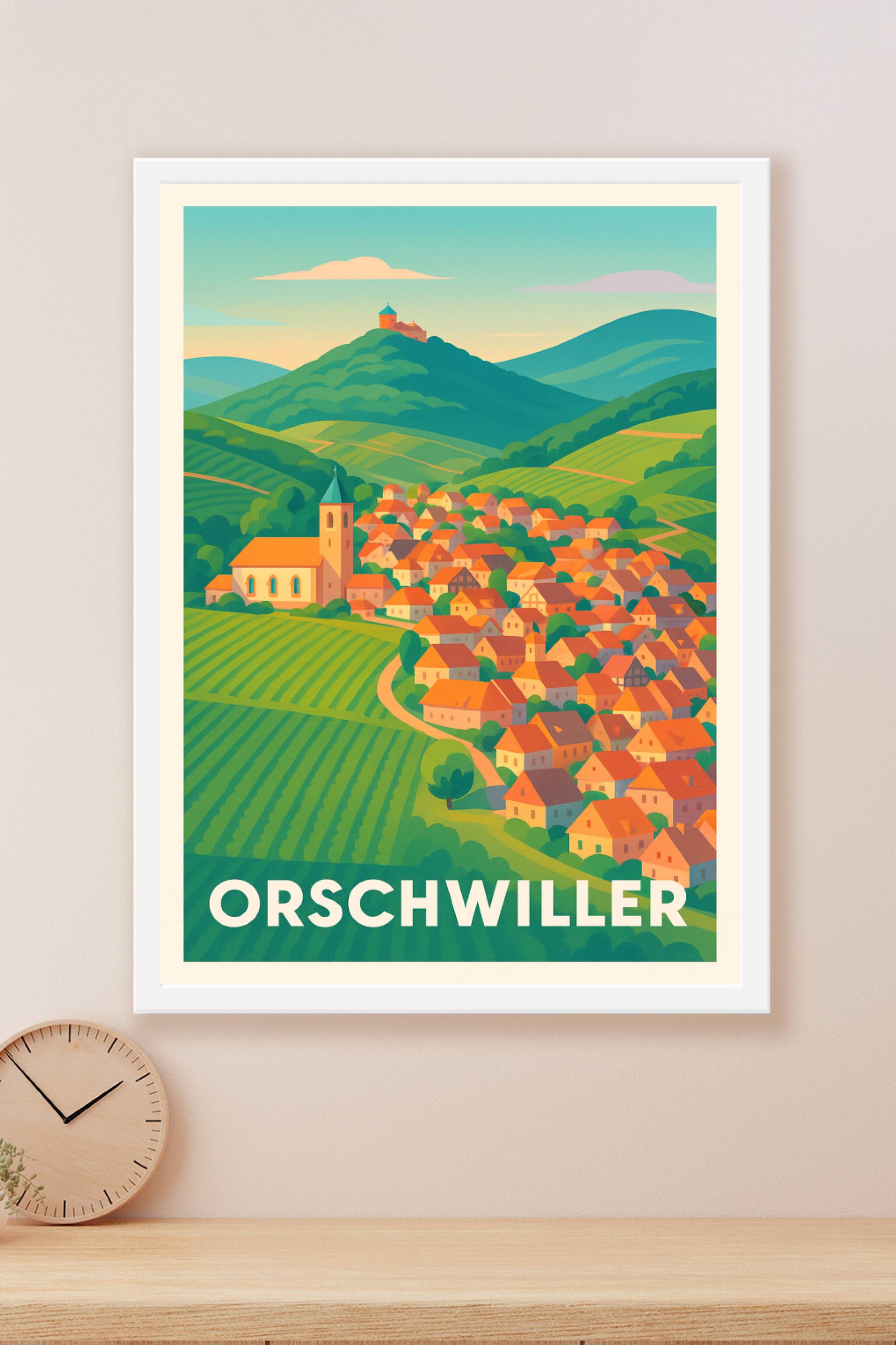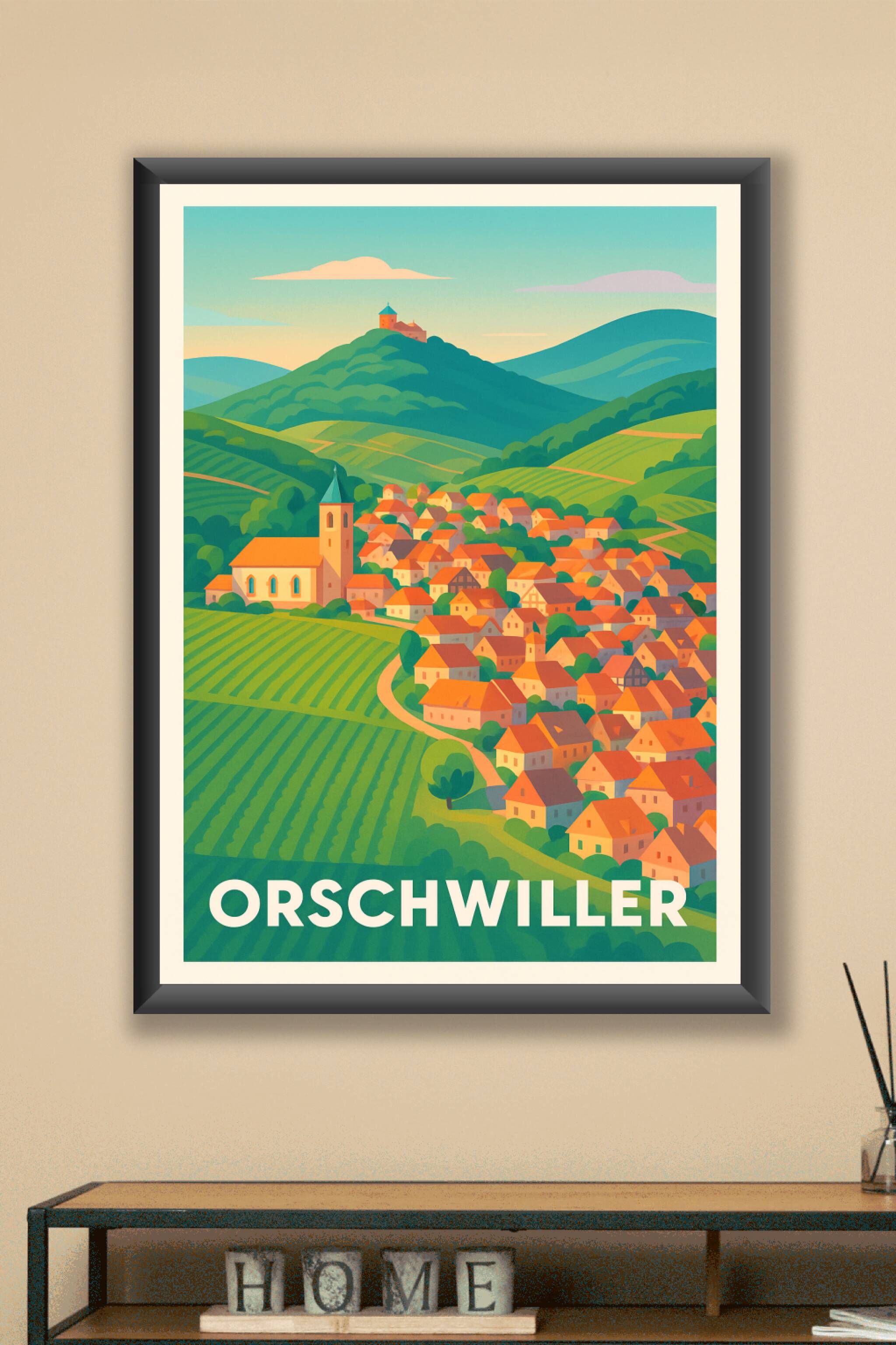 Découvrez l'atmosphère paisible et pittoresque d'Orschwiller avec cette affiche illustrée aux tons chaleureux et harmonieux. Ce poster met en valeu...