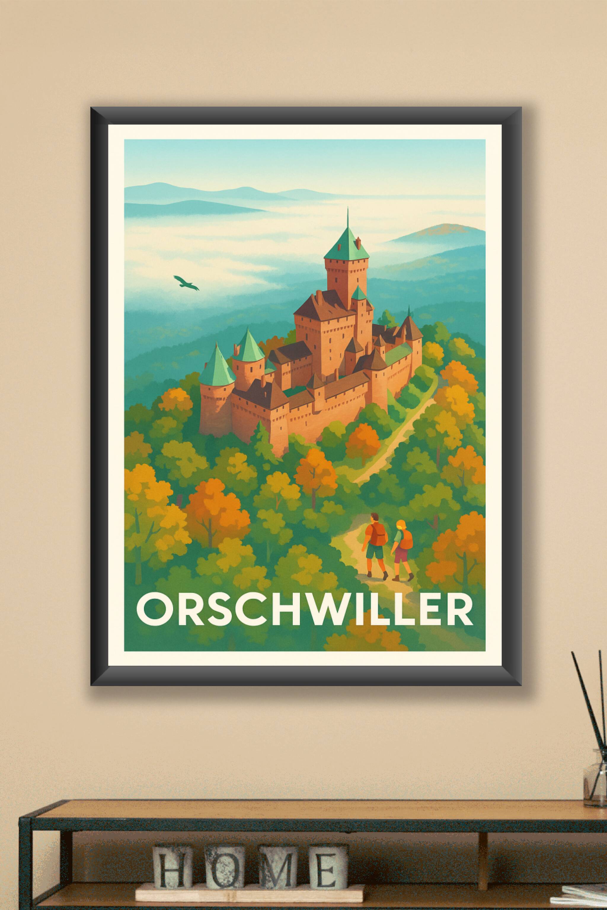 Découvrez la majesté du château d'Orschwiller, niché au milieu d'une forêt flamboyante aux couleurs d'automne, avec cette affiche illustrée au style vintage. Ce poster évoque l'aventure et la sérénité d'une randonnée au pied de cette forteresse historique, surplombée par un ciel apaisant et une brume légère. Imprimée en tirage "Fine Art" sur papier 305g coton, cette affiche offre une qualité d'impression exceptionnelle, avec des couleurs vives et une finition haute définition. Disponible en formats A1 à A4, avec ou sans cadre, cette affiche est idéale pour enrichir votre décoration intérieure ou offrir un souvenir d'Alsace subtil et élégant.