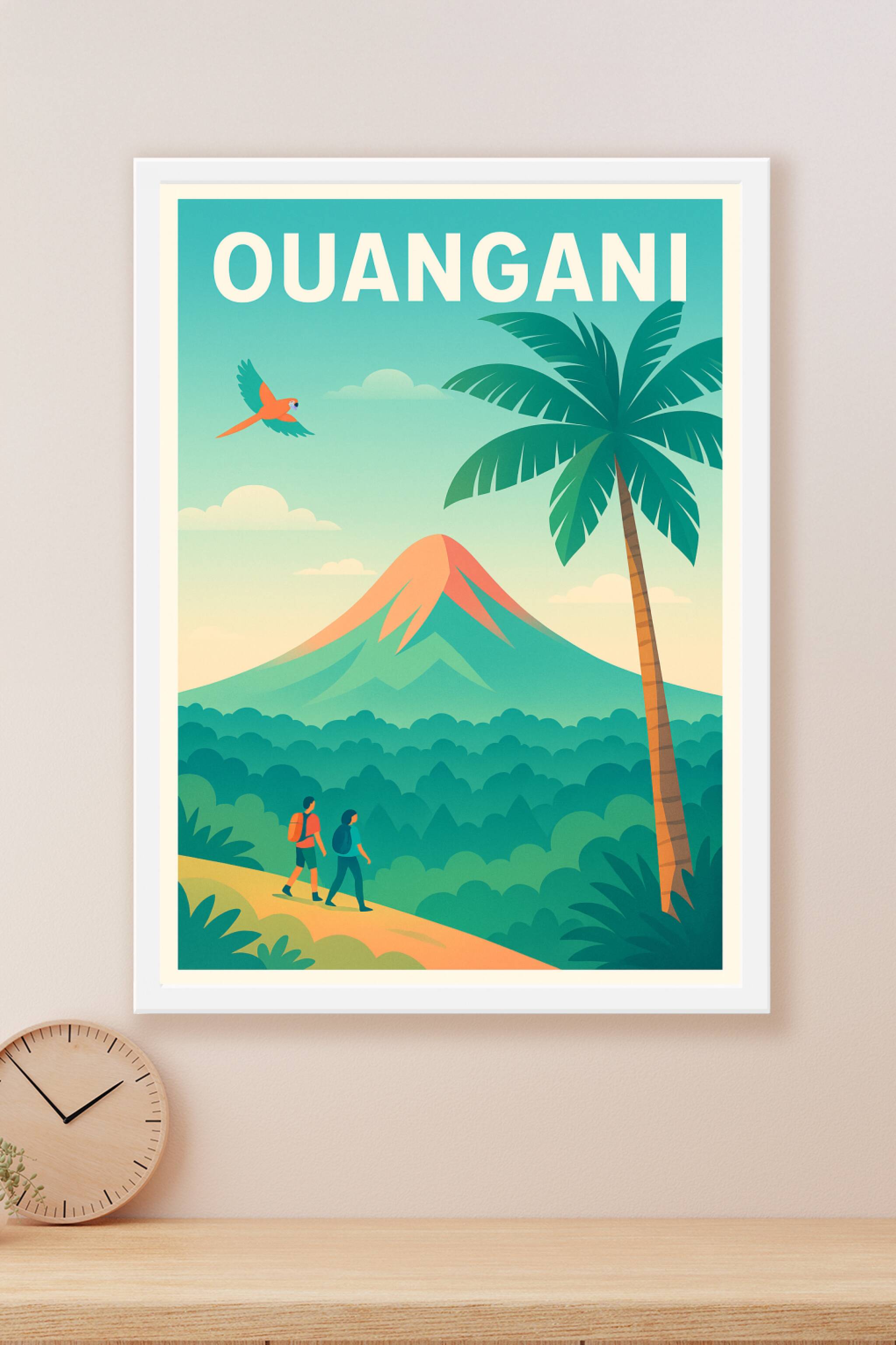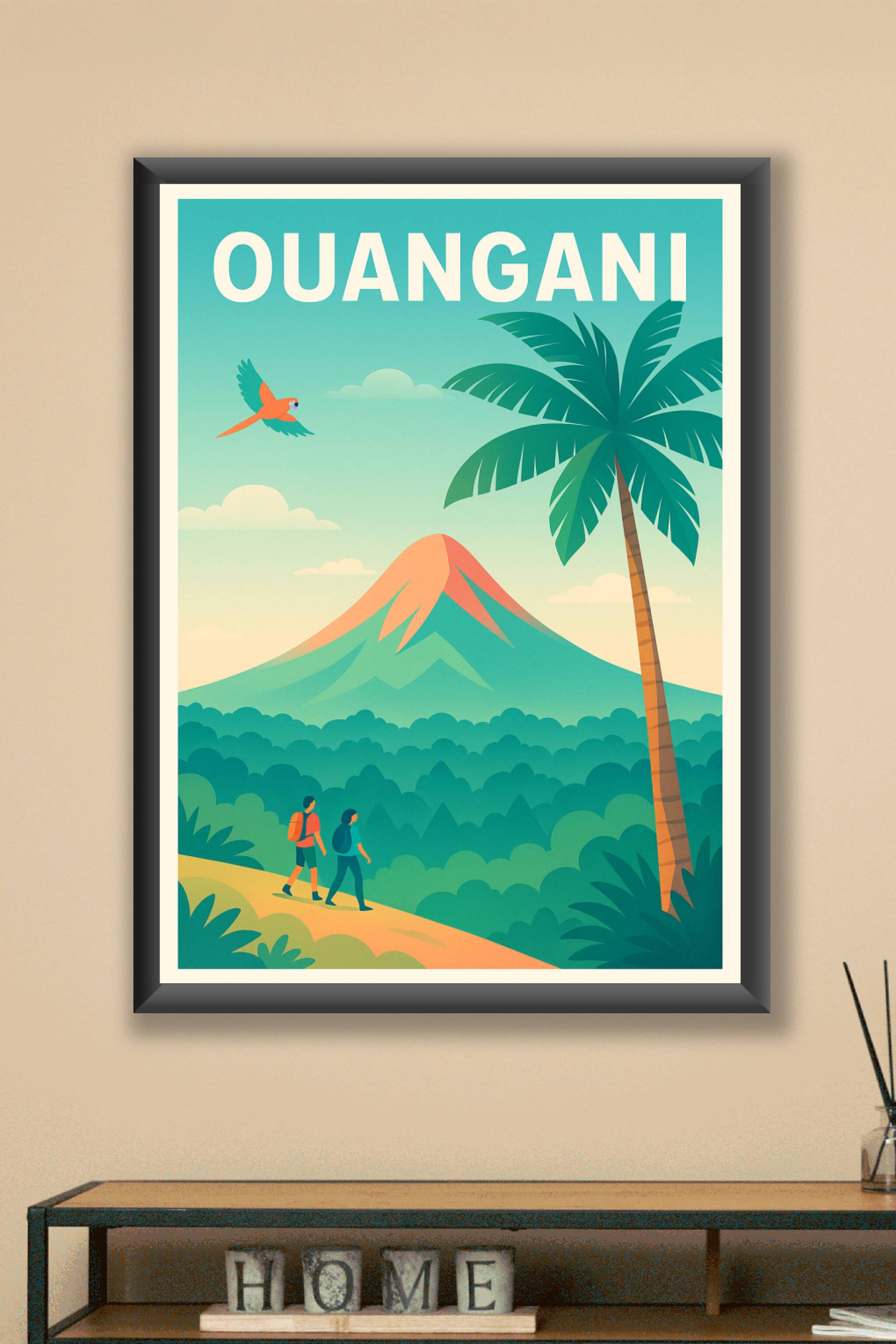 Découvrez la beauté sauvage d'Ouangani avec cette affiche illustrée aux couleurs douces et apaisantes, mettant en scène un volcan majestueux surplo...