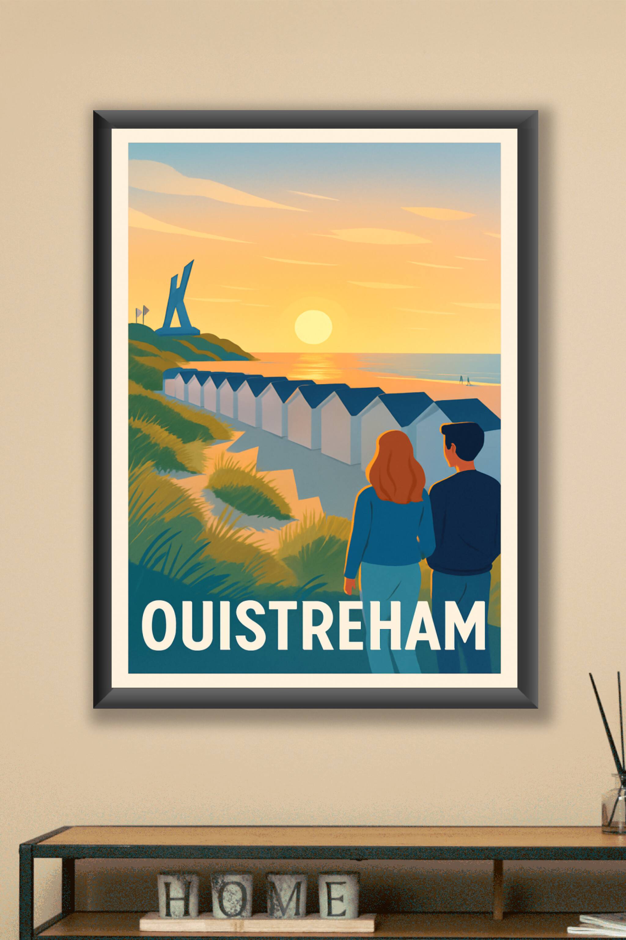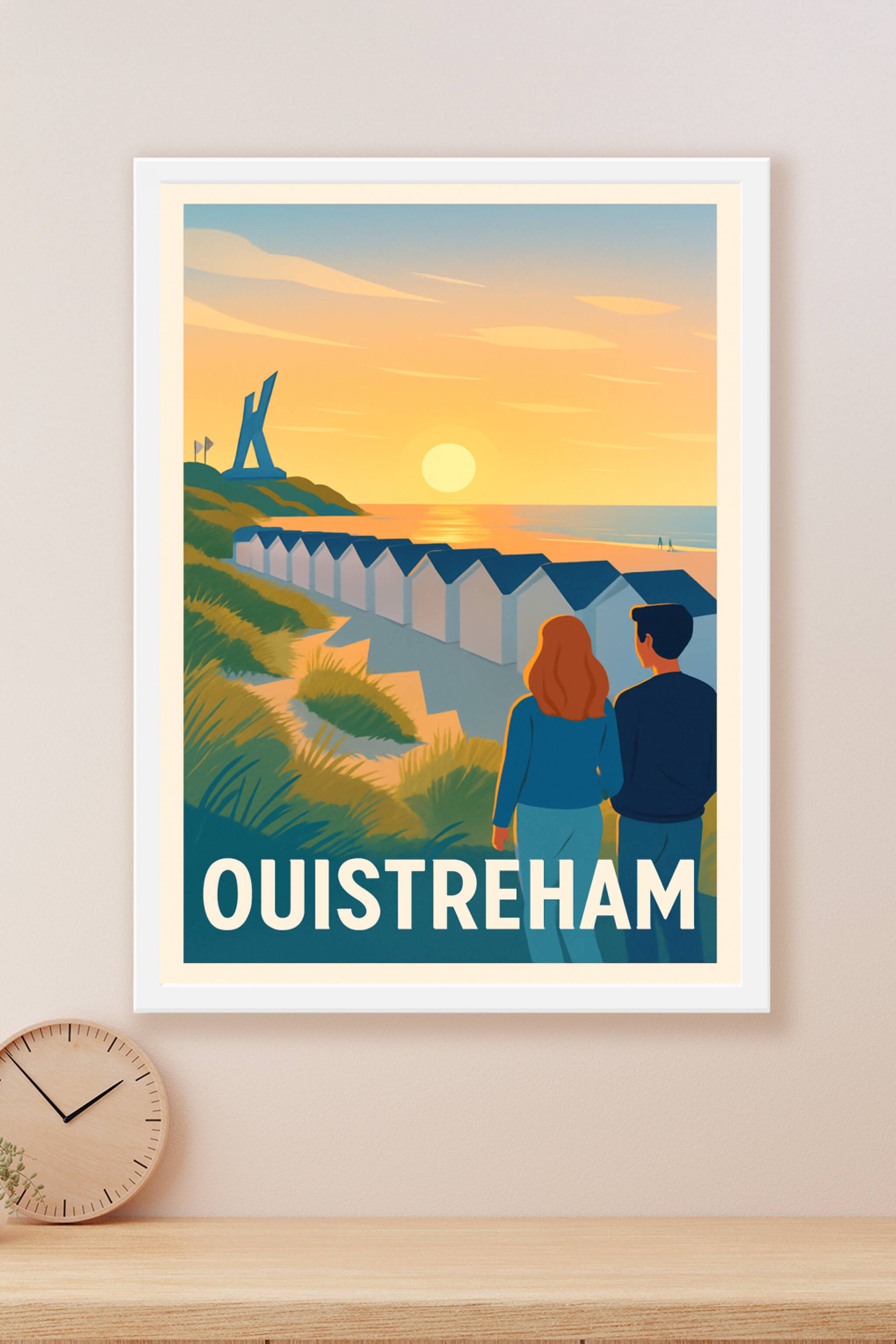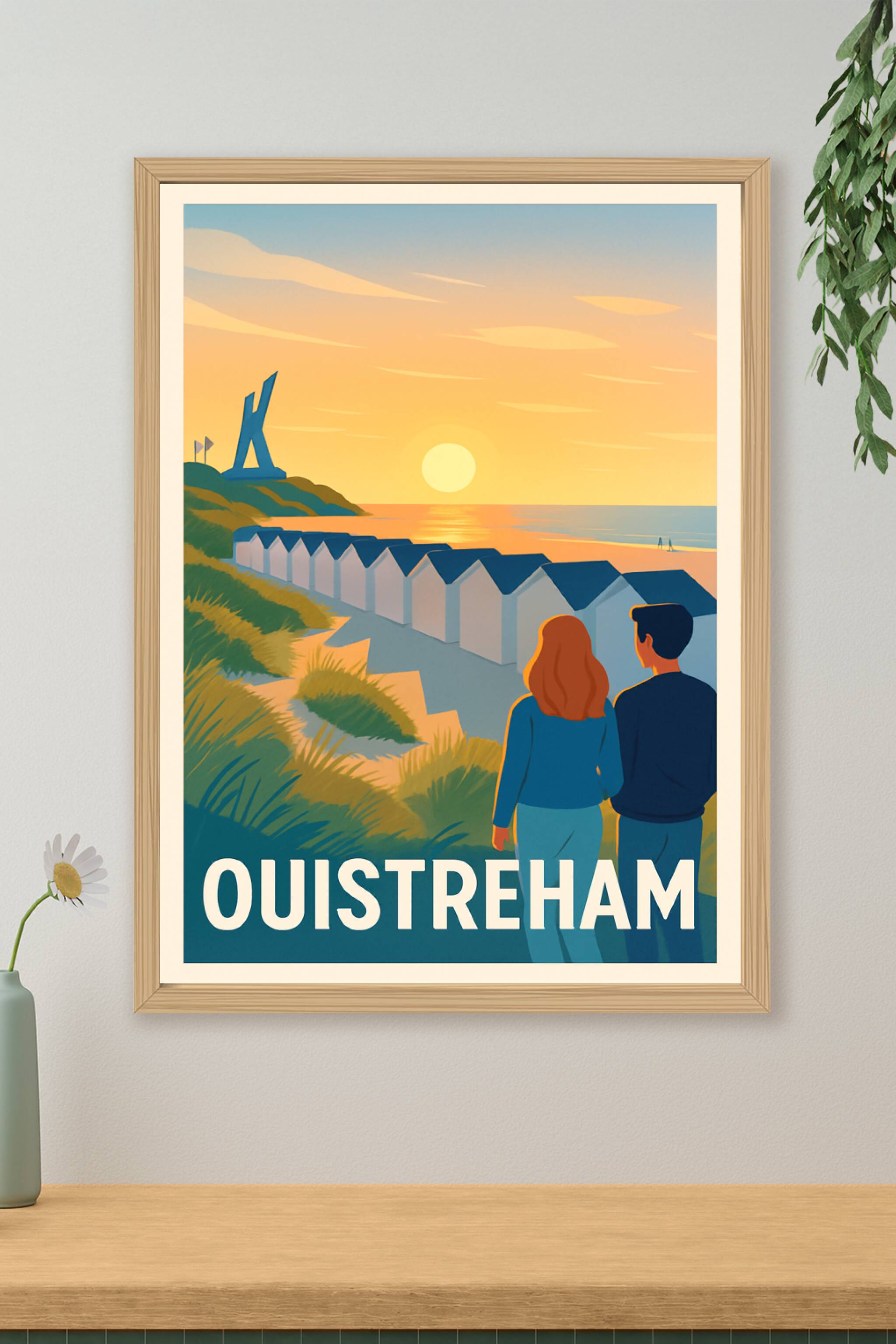 Capturez la douceur du littoral normand avec cette affiche illustrant une scène romantique au coucher du soleil sur les cabines de plage d'Ouistreh...