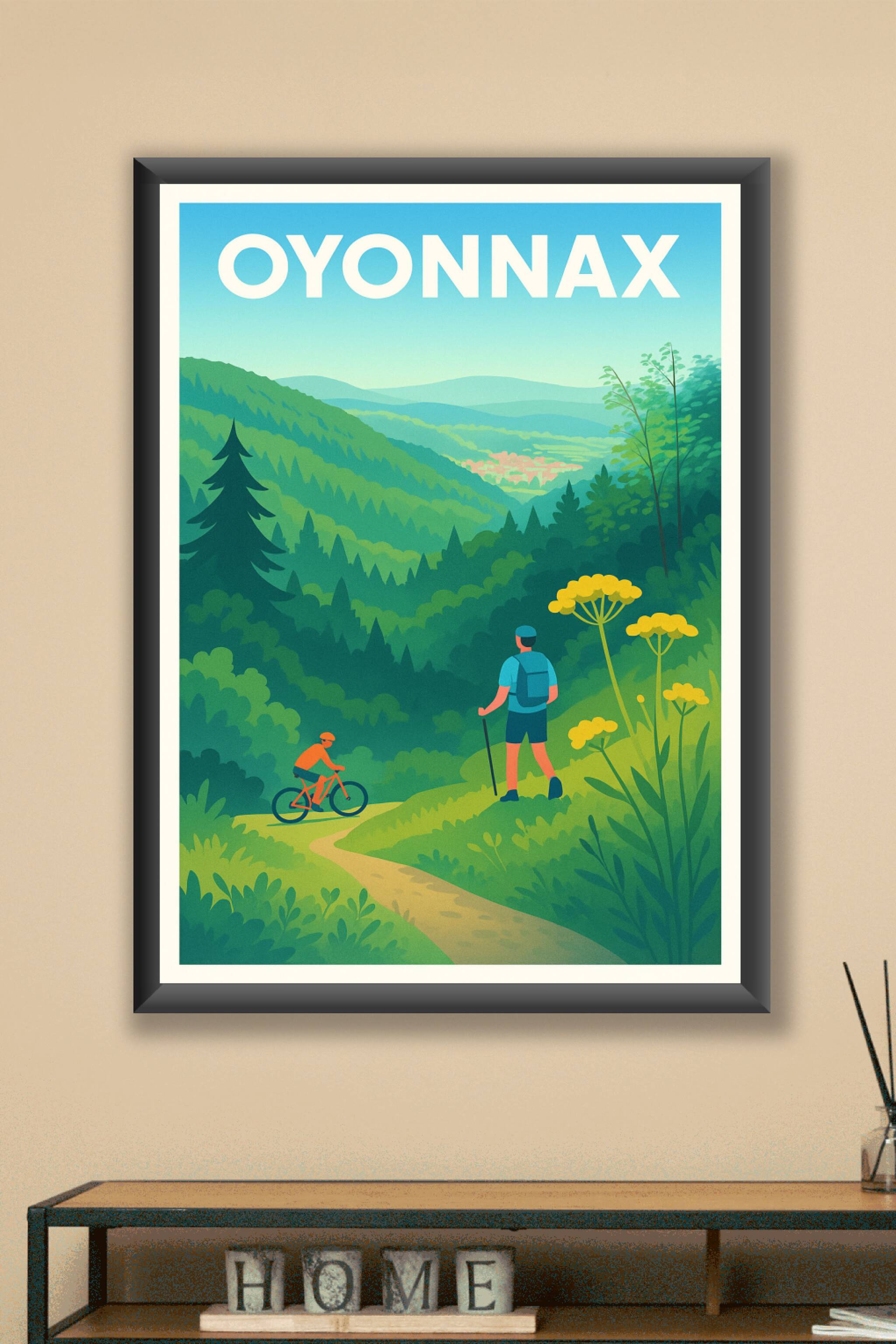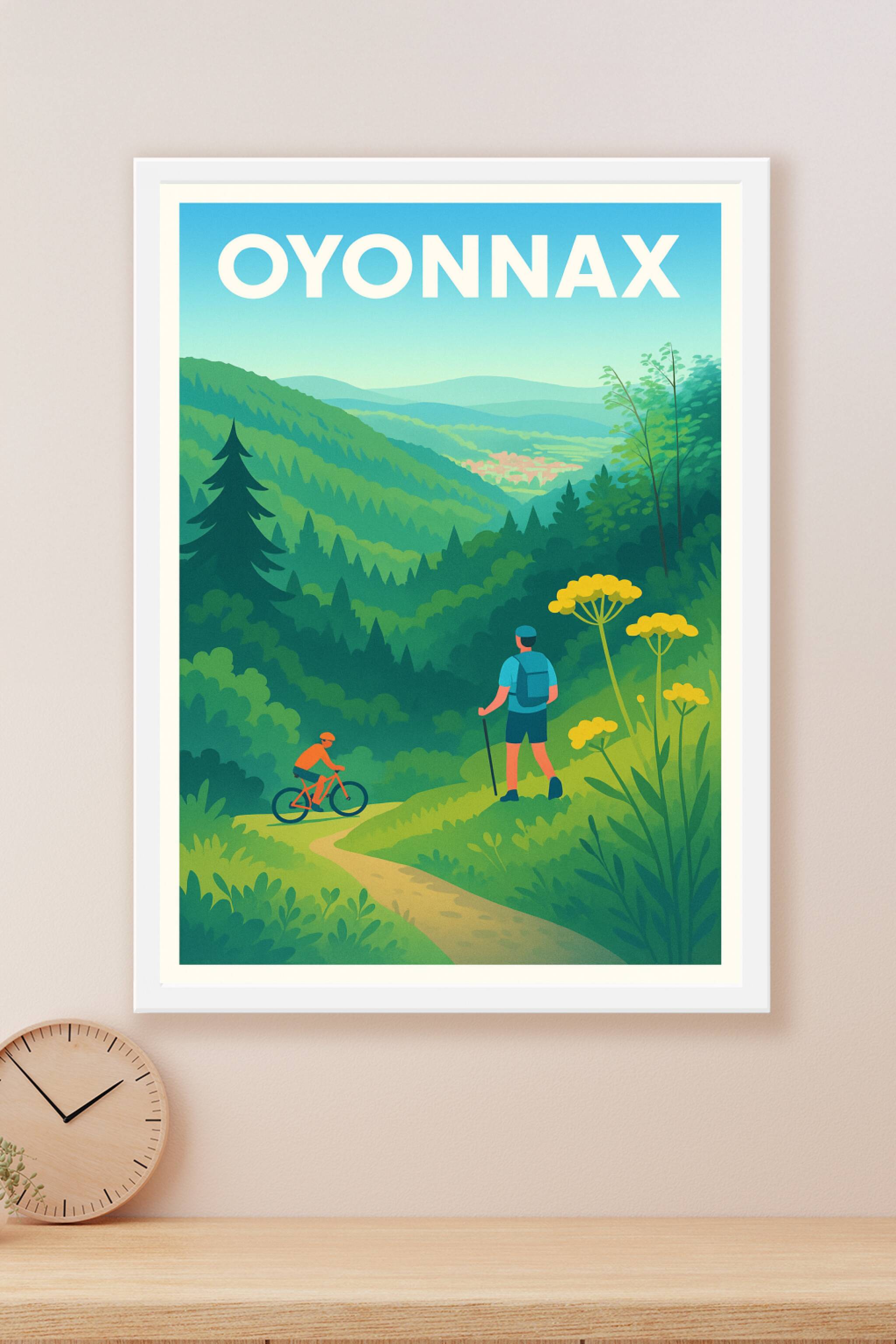 Découvrez la beauté verdoyante des paysages d'Oyonnax avec cette affiche illustrée mettant en scène une balade à pied et à vélo au cœur de la natur...