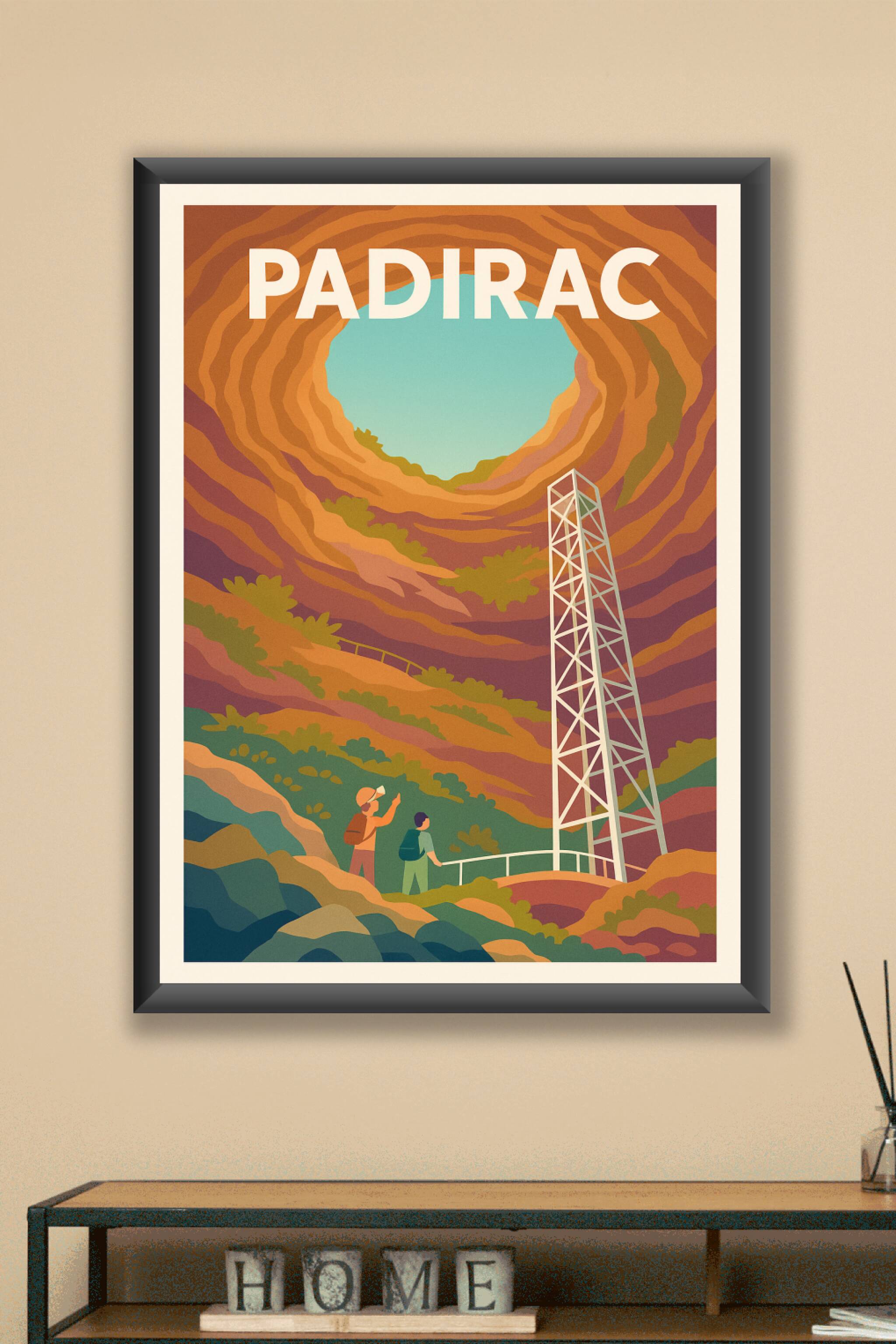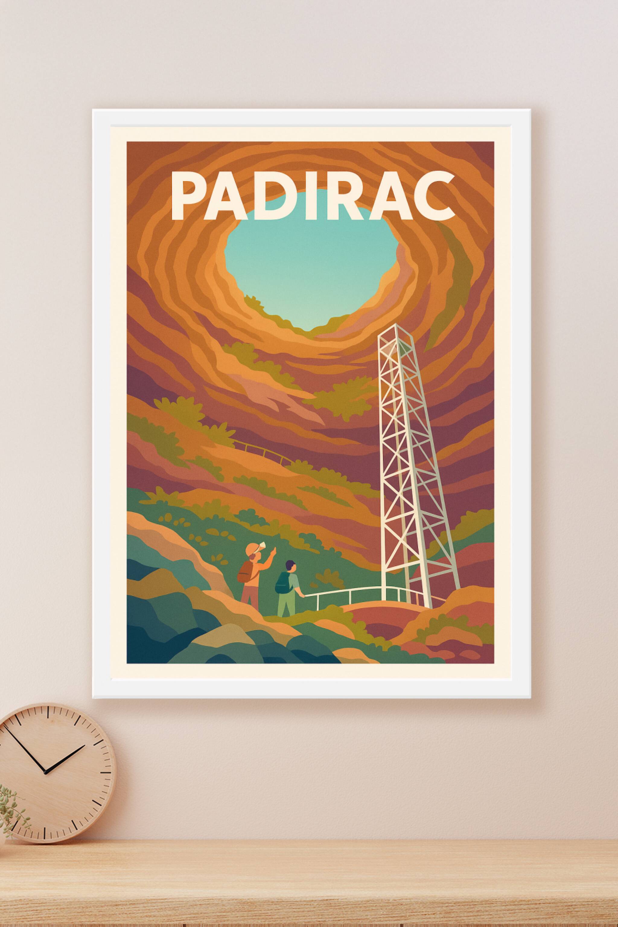 Découvrez l'émerveillement du gouffre de Padirac avec cette affiche illustrée qui capture la beauté des parois colorées et l'immensité de ce site n...