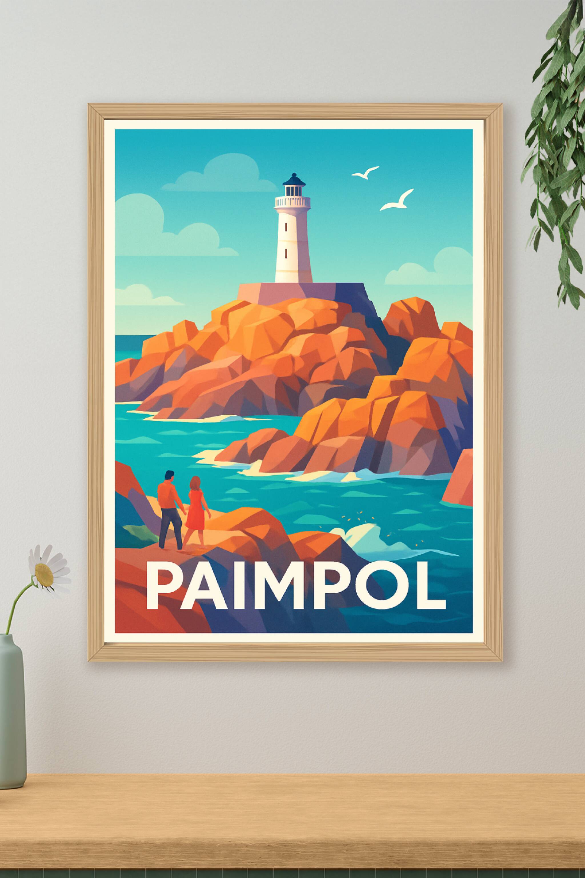 Découvrez la beauté saisissante de Paimpol à travers cette affiche illustrée mettant en scène un phare emblématique posé sur les rochers orangés, b...