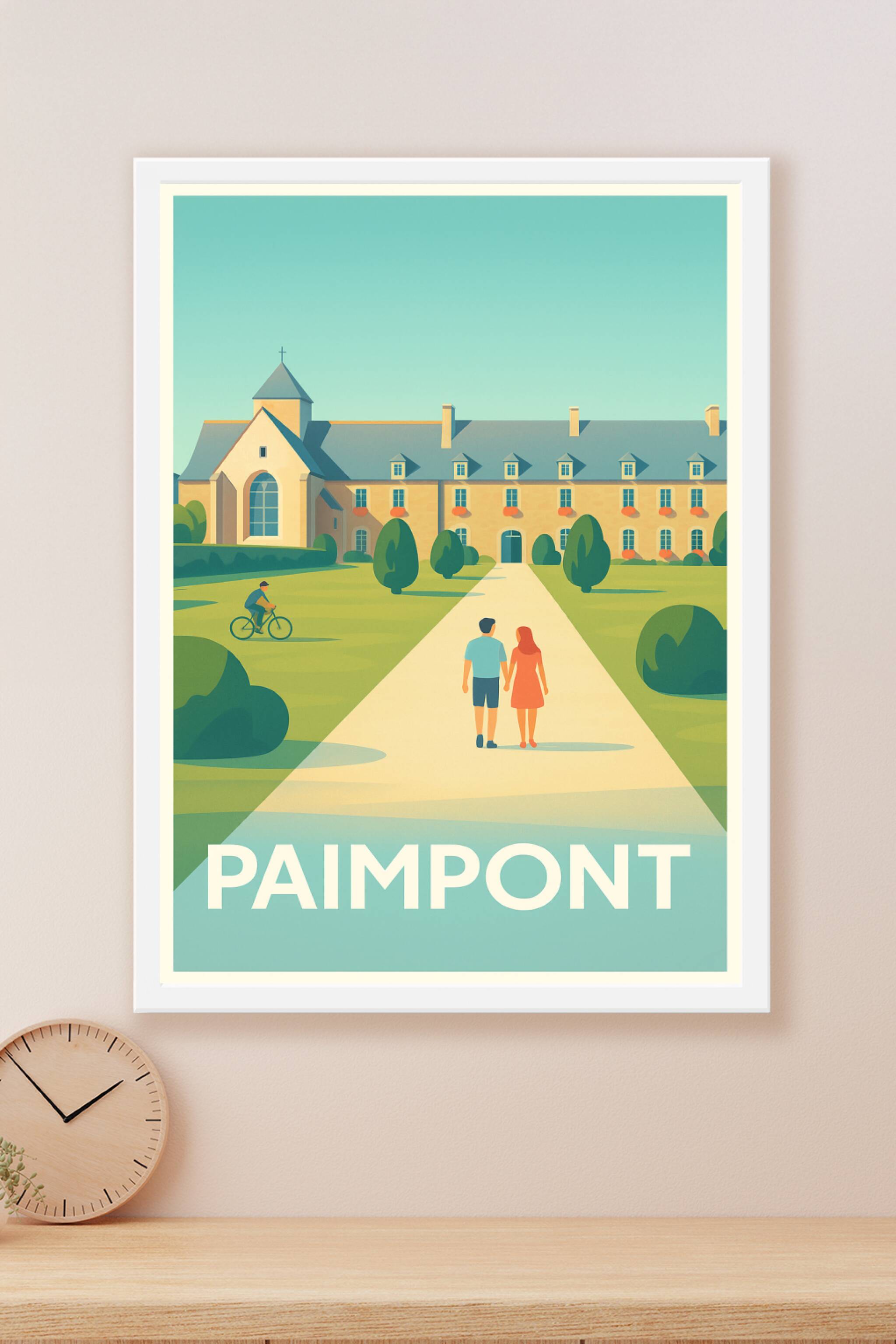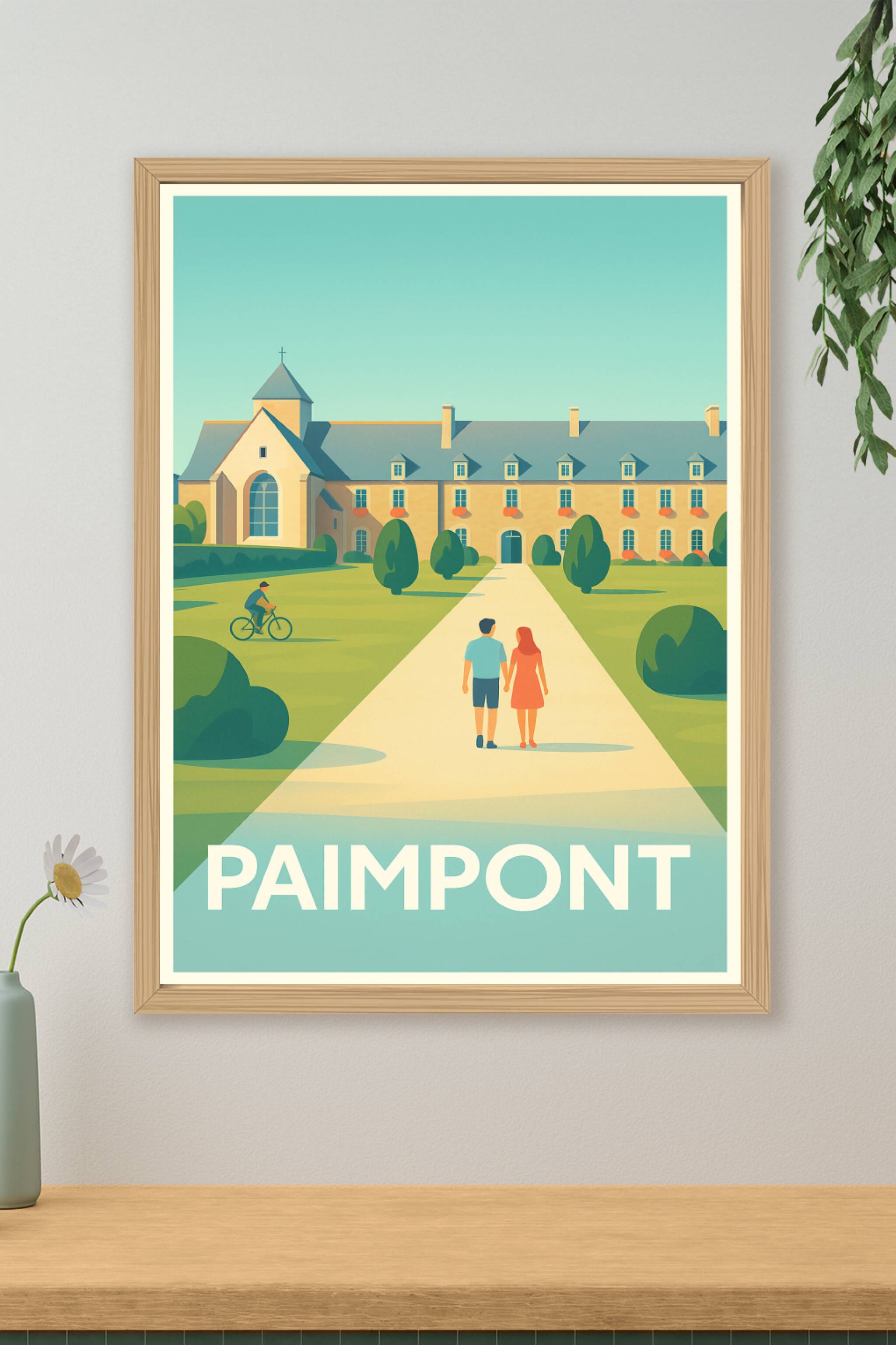 Découvrez l'ambiance paisible et romantique de Paimpont avec cette affiche illustrée mettant en scène une balade au soleil devant un bâtiment typiq...
