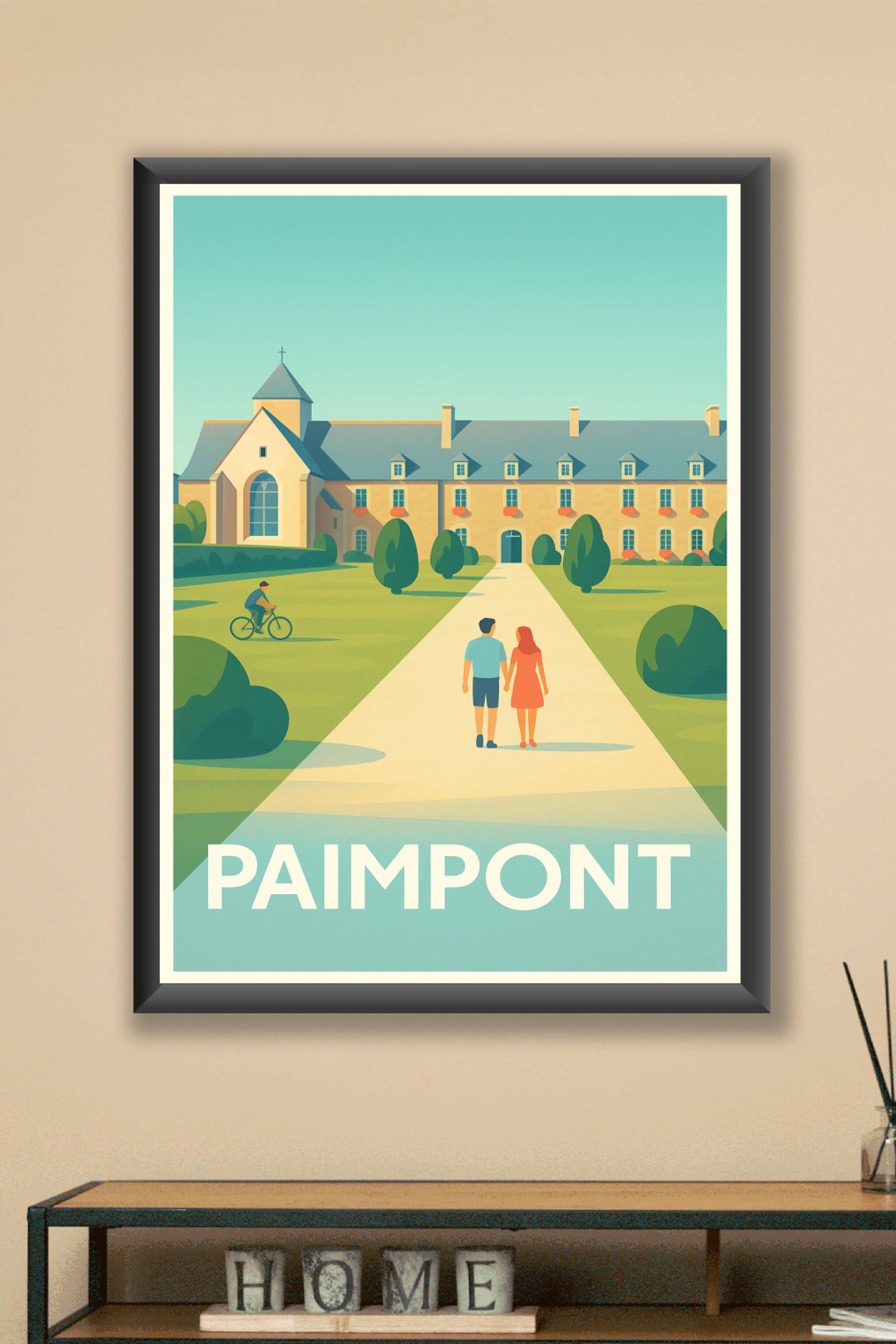 Découvrez l'ambiance paisible et romantique de Paimpont avec cette affiche illustrée mettant en scène une balade au soleil devant un bâtiment typique de la région. Ce poster offre une invitation à la détente et à la découverte de ce lieu chargé d'histoire et de nature.Cet affichage est imprimé en tirage "Fine Art" sur papier 305g coton, garantissant une qualité d'impression exceptionnelle et une durabilité parfaite. Disponible en formats A1 à A4, avec ou sans cadre, cette affiche s'adapte à tous les espaces et styles de décoration.Parfaite pour égayer votre intérieur ou pour offrir un cadeau original, cette affiche allie esthétique et qualité d'impression premium, 100% fabriquée en France.