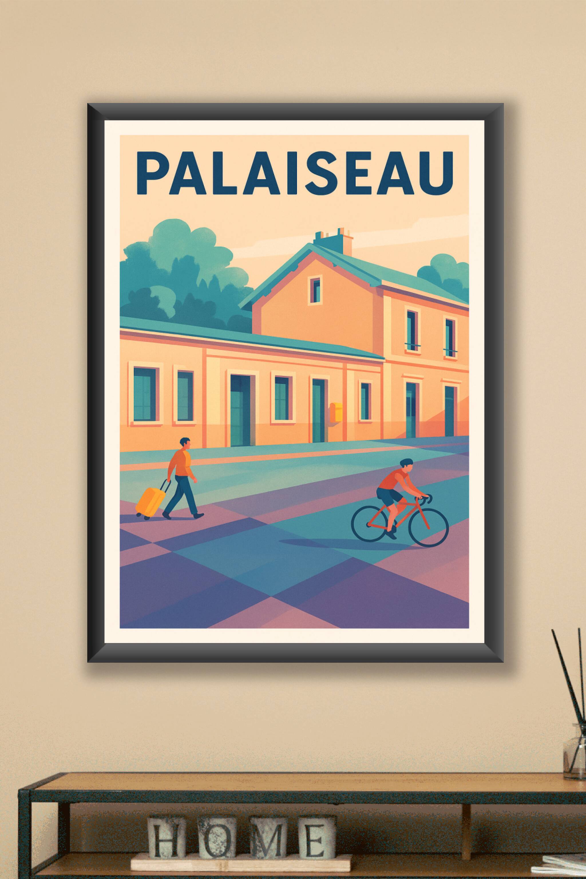 Découvrez cette affiche vintage illustrant une scène calme et colorée de Palaiseau, avec un cycliste et un voyageur tirant sa valise devant un bâti...