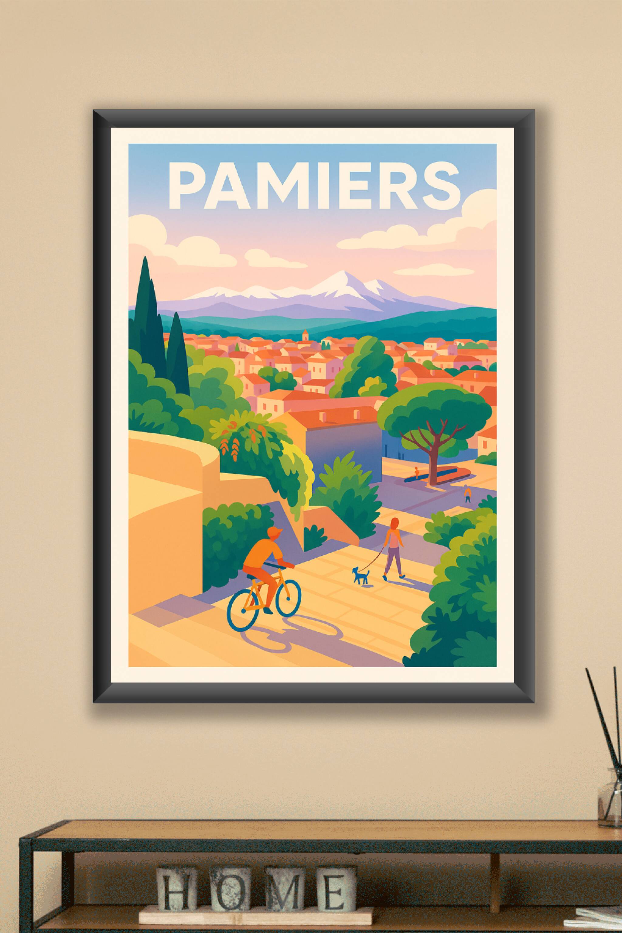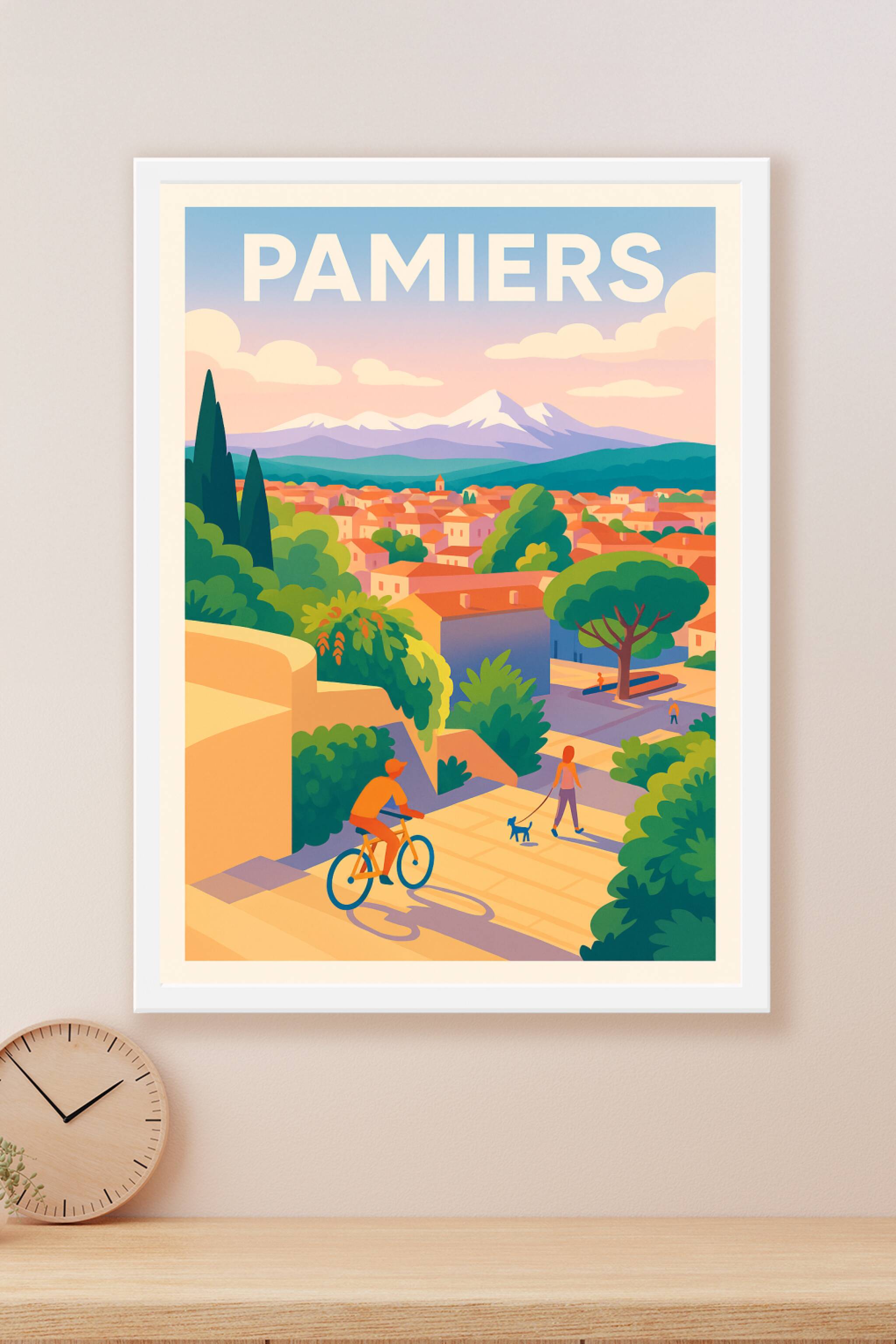Découvrez la douceur de vivre à Pamiers avec cette affiche illustrée au style lumineux et coloré. Ce poster dévoile une scène paisible entre nature...