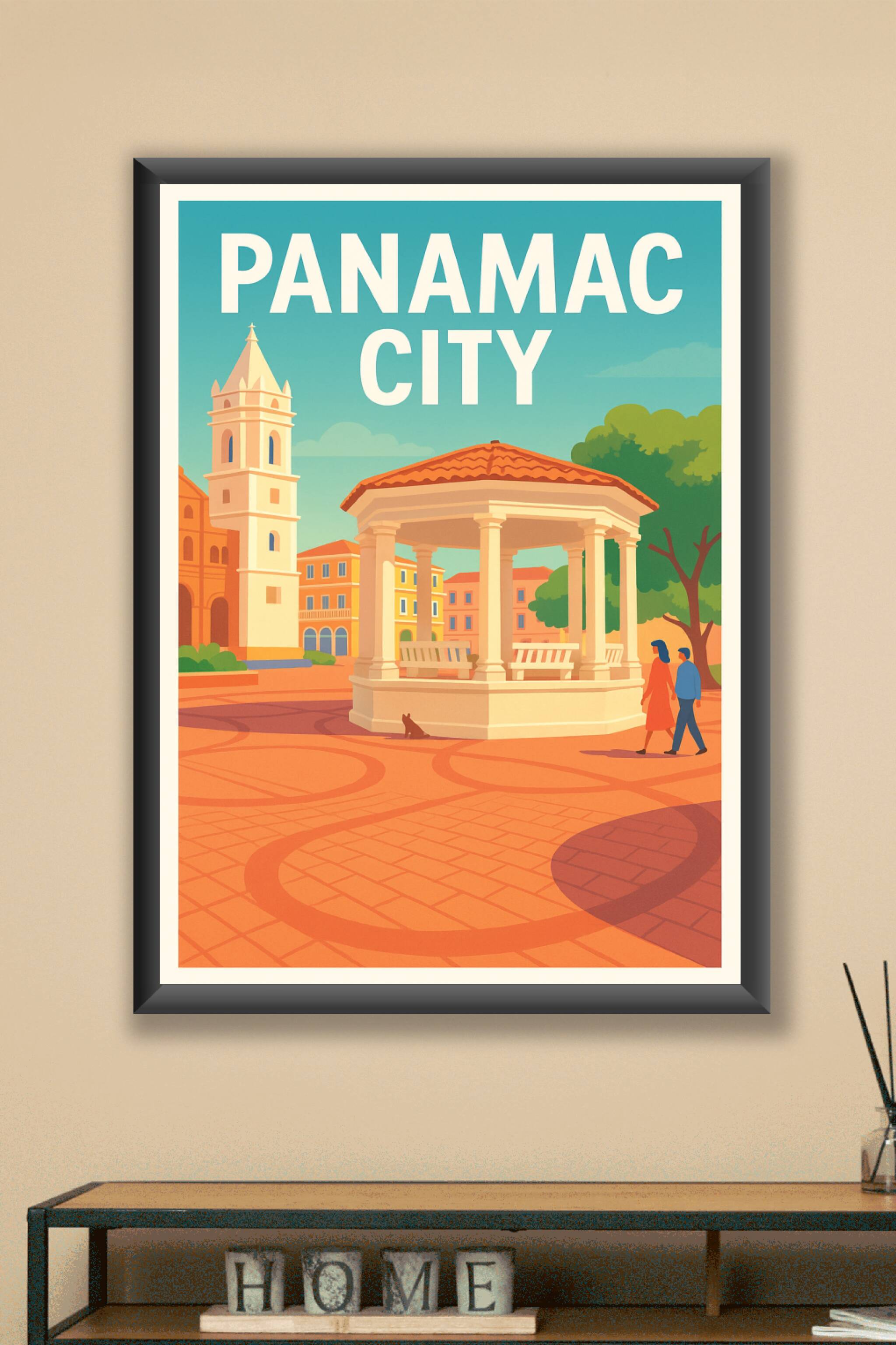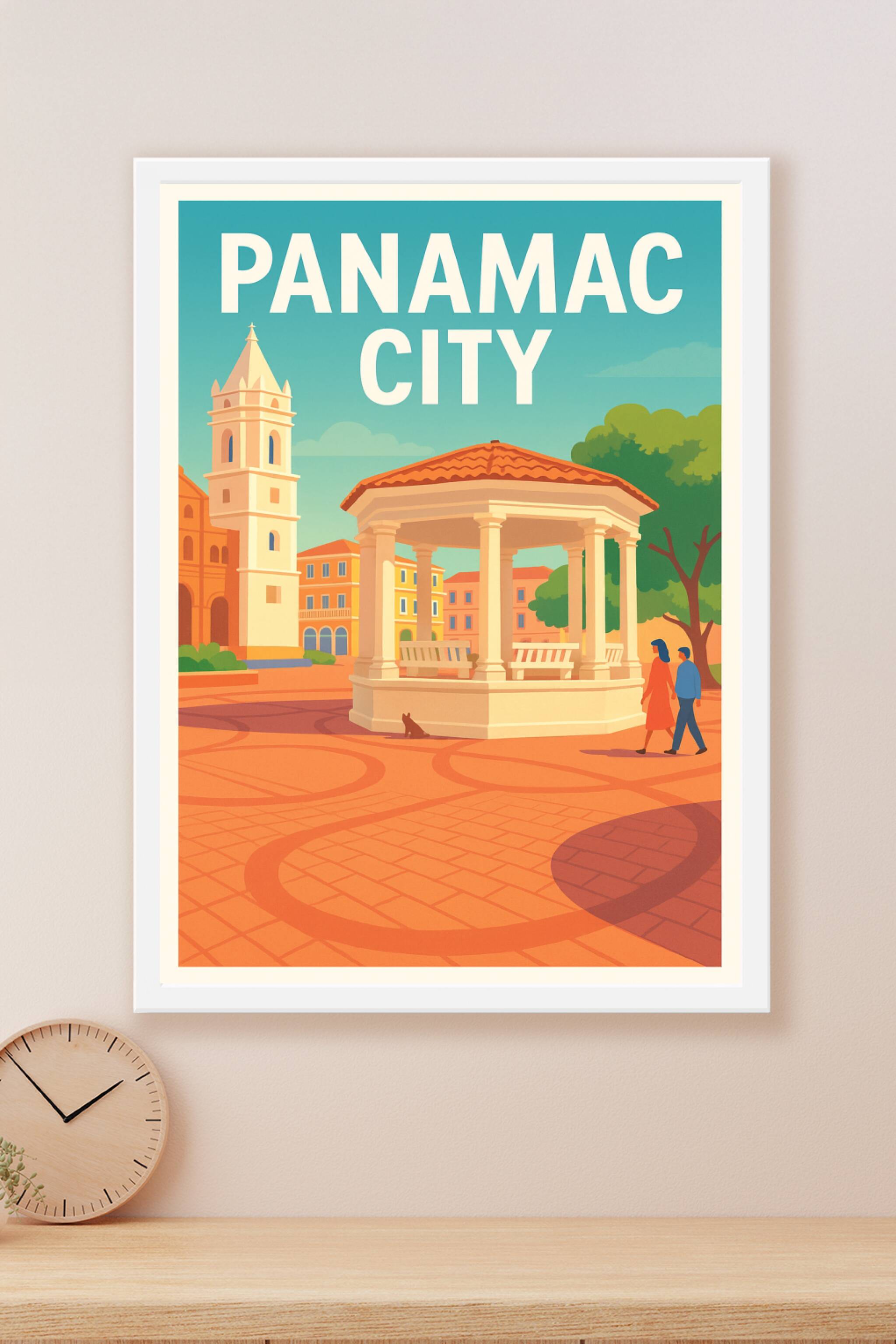 Découvrez l'élégance tranquille de Panama City à travers cette affiche au style vintage et couleurs douces, mettant en scène une place emblématique...