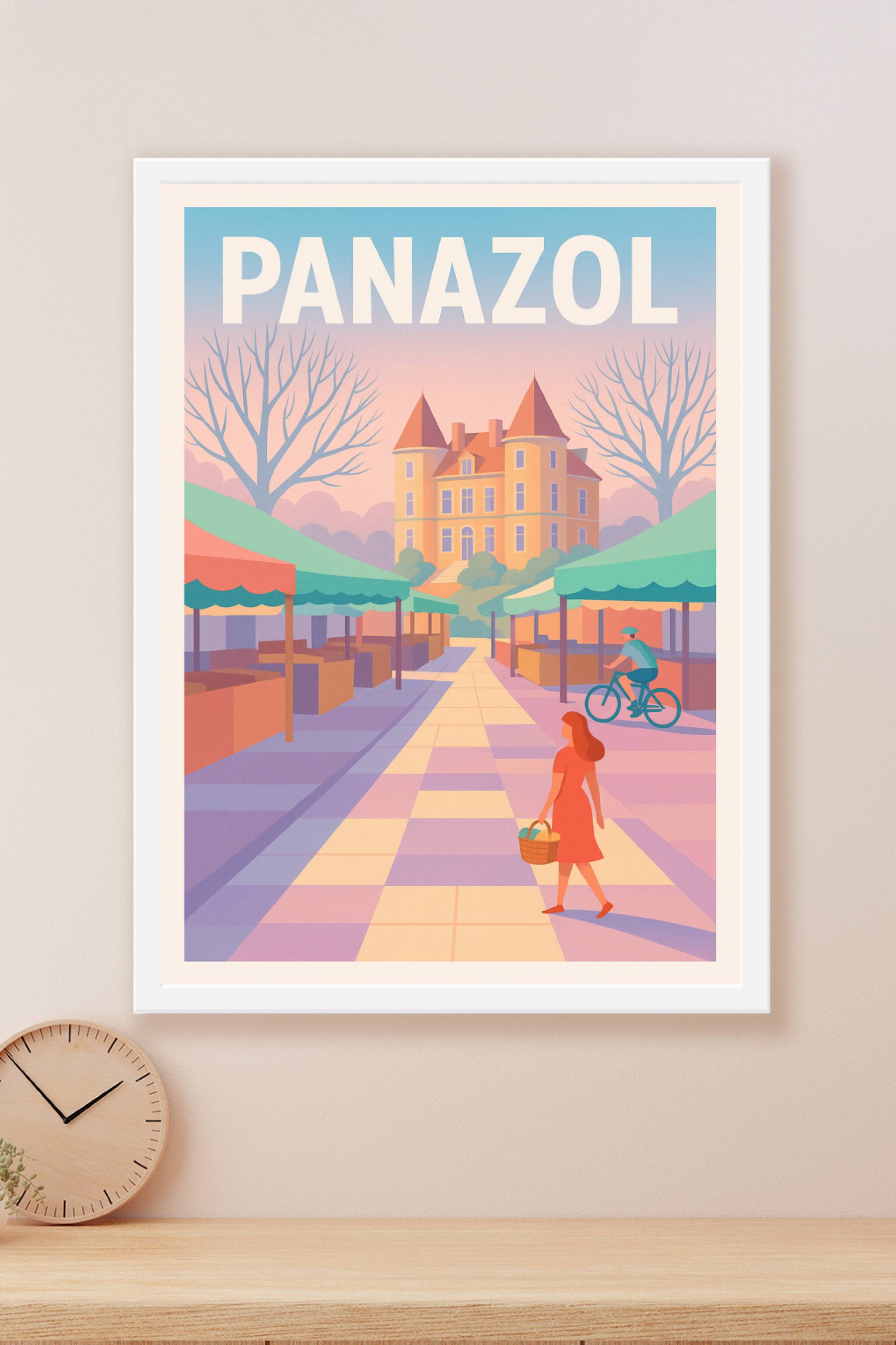 Découvrez l'atmosphère douce et sereine de Panazol à travers cette affiche illustrée dans des teintes pastel chaleureuses. Le poster met en scène une allée de marché sous les tentes colorées et le château emblématique en arrière-plan, invitant à une promenade tranquille au cœur de cette charmante ville. Disponible en tirage "Fine Art" sur papier 305g coton pour une qualité d'impression optimale, cette affiche est proposée en formats A1 à A4, avec ou sans cadre. Offrez à votre intérieur une touche d'élégance et de poésie régionale grâce à ce poster unique, idéal pour les amateurs de décoration raffinée et les passionnés de Panazol. Livraison 100% française pour une qualité garantie.