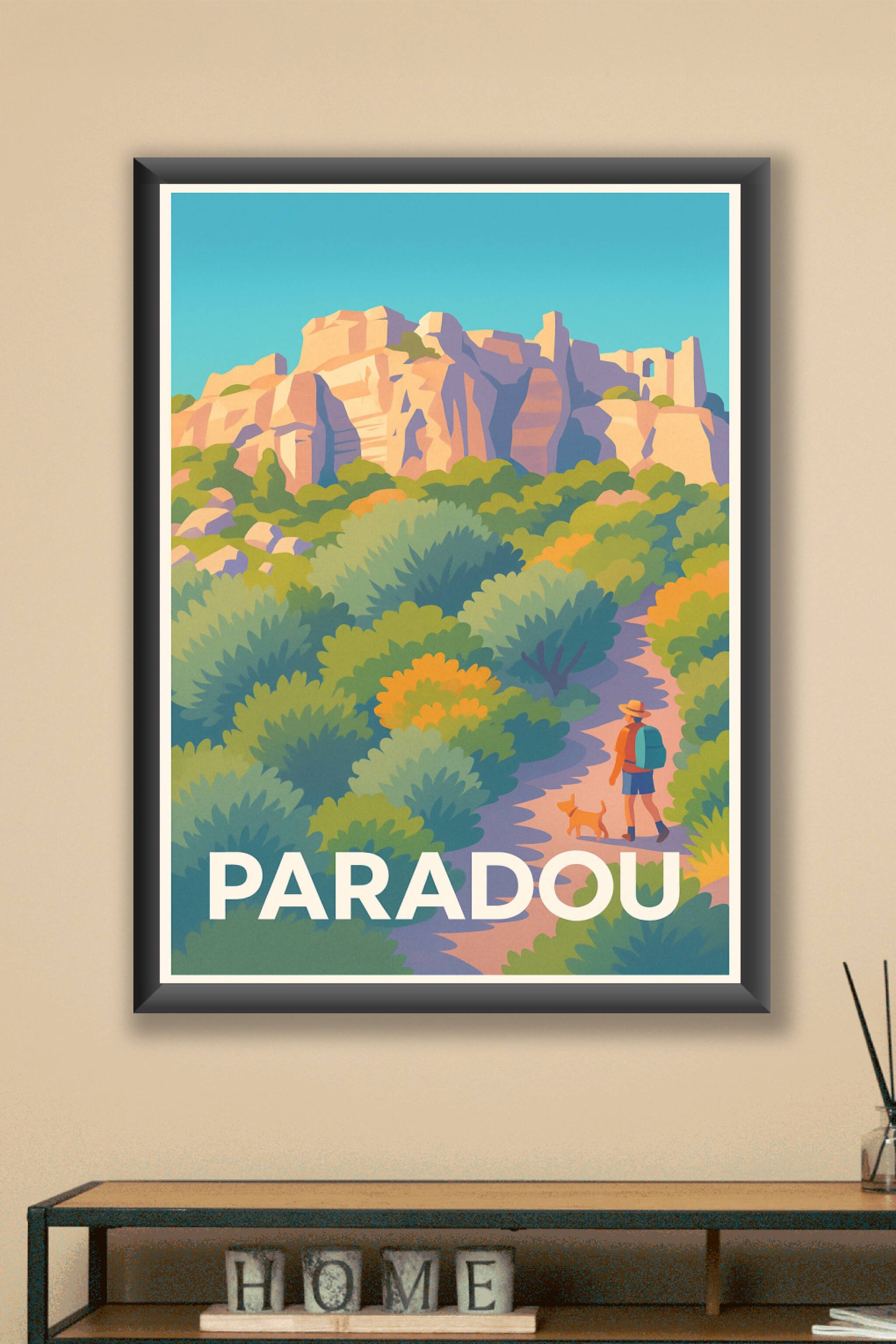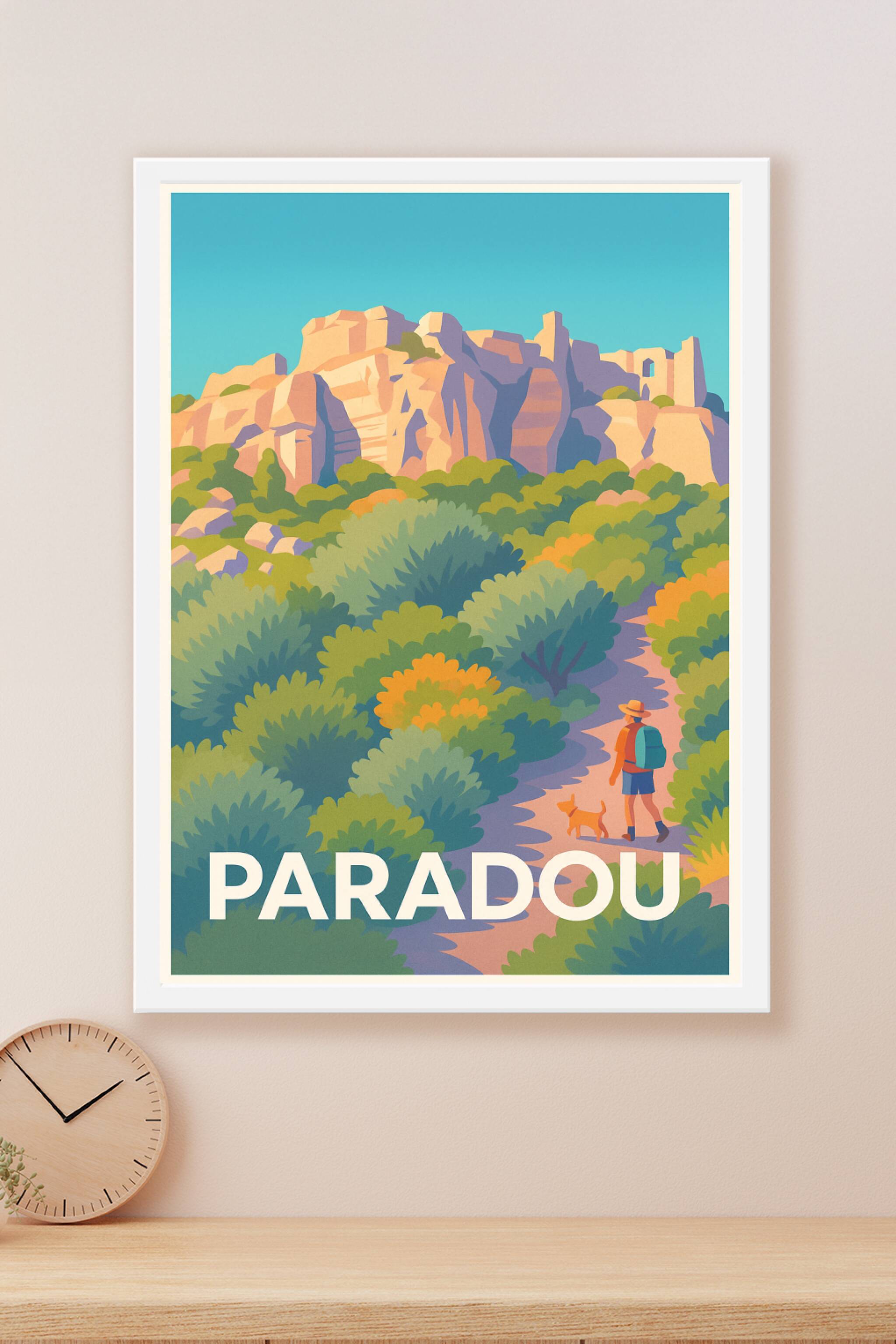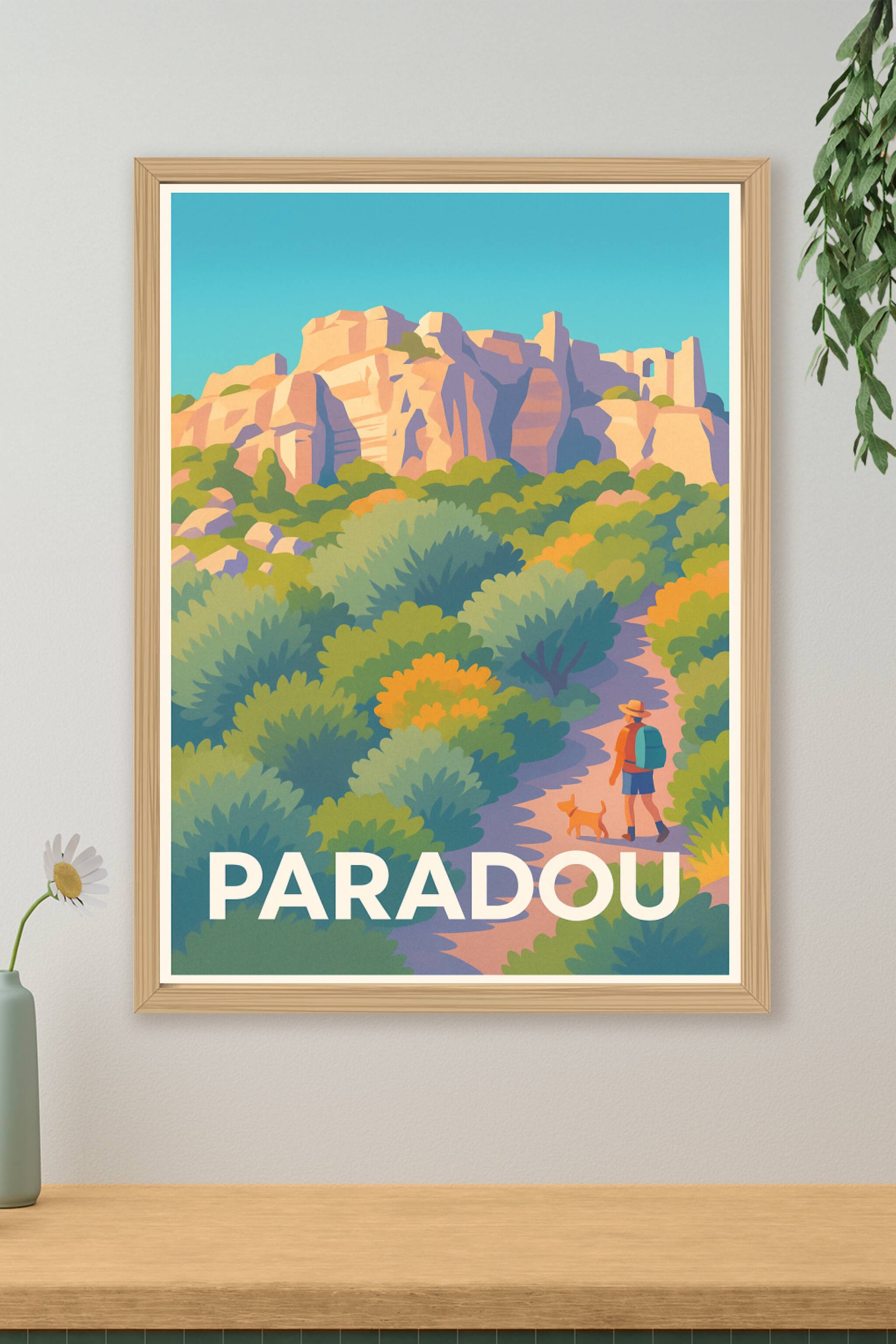 Découvrez le charme authentique de Paradou avec cette affiche illustrée qui met en valeur ses paysages naturels et ses sentiers pittoresques. Un ra...