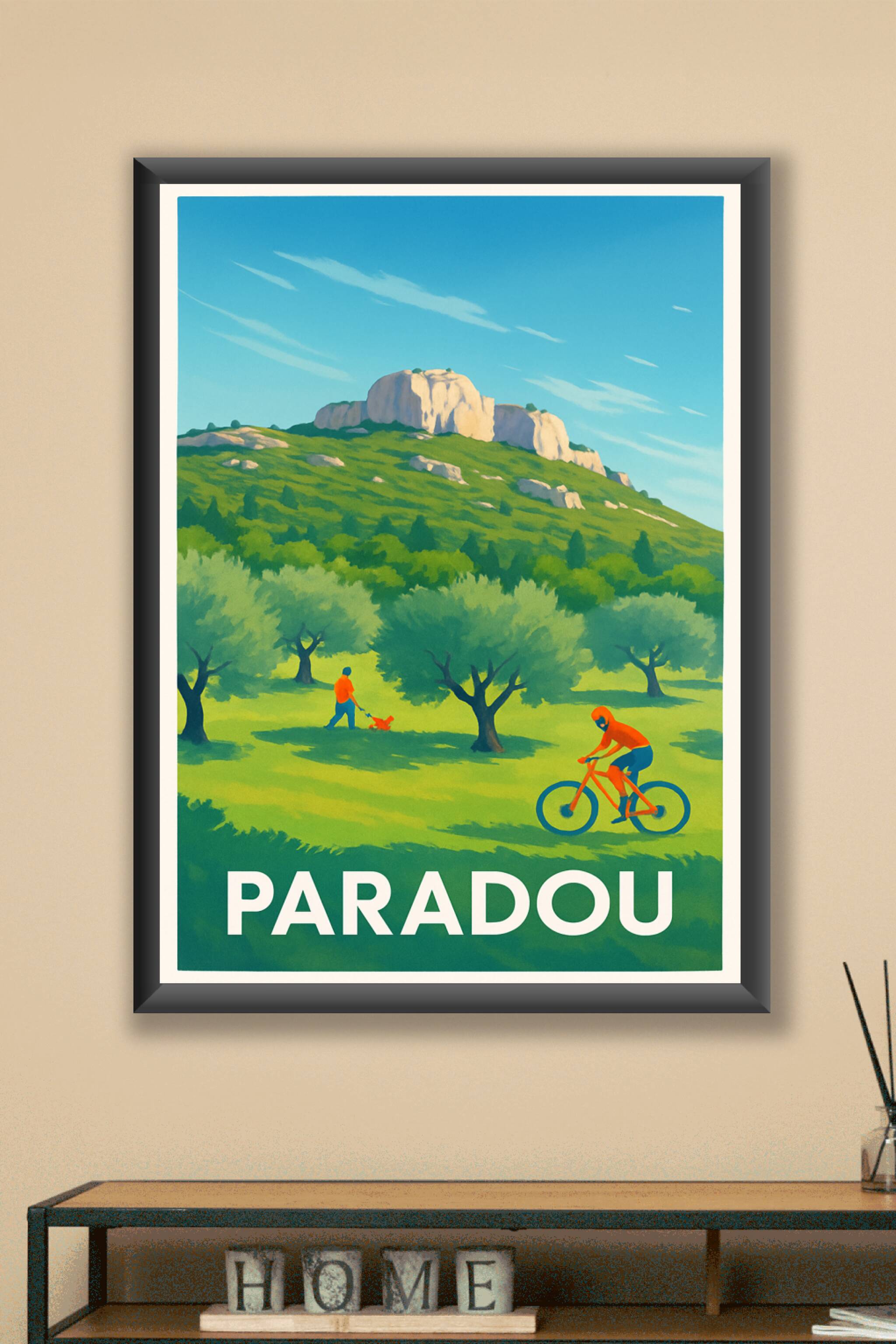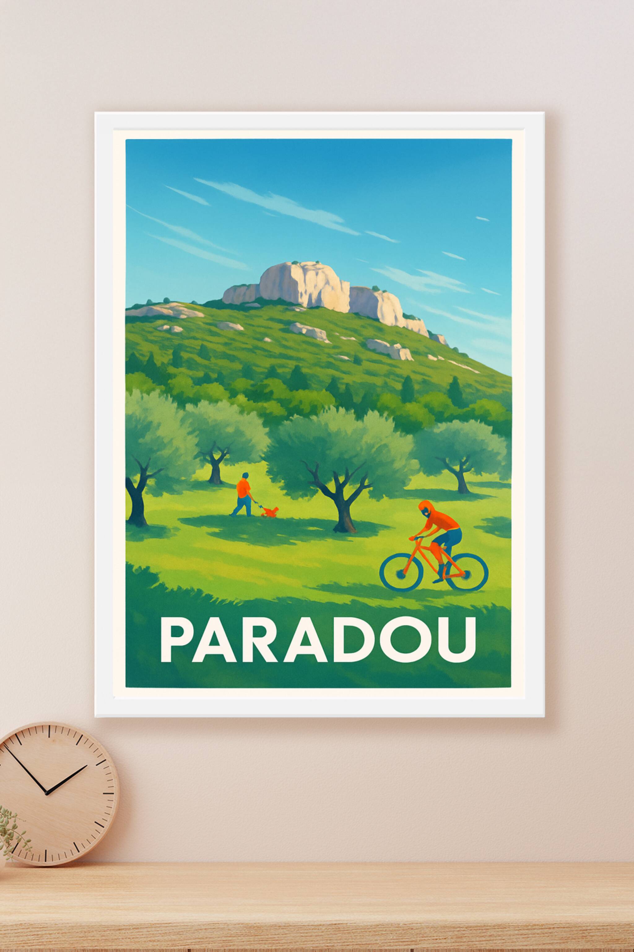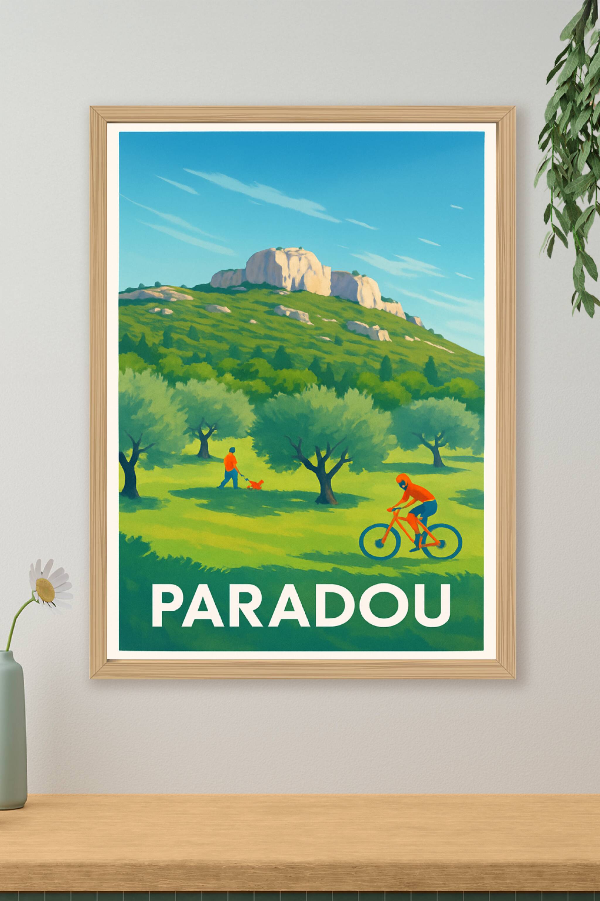 Découvrez l'affiche qui capture la beauté verdoyante et paisible du Paradou, niché au cœur de la Provence. Cette scène illustrée met en avant la douceur de vivre entre oliviers, randonnées et balades à vélo, parfaite pour tous les amoureux de la nature et des paysages provençaux. Ce poster est imprimé en tirage "Fine Art" sur un papier 305g coton qui garantit une qualité d'impression exceptionnelle et des couleurs vives qui traversent le temps. Disponible en formats allant du A1 au A4, avec ou sans cadre, cette affiche apportera une touche de nature et de sérénité à votre décoration intérieure. Profitez d'une fabrication 100% française pour offrir ou enrichir votre collection d'art mural sur le thème des plus beaux coins de Provence.