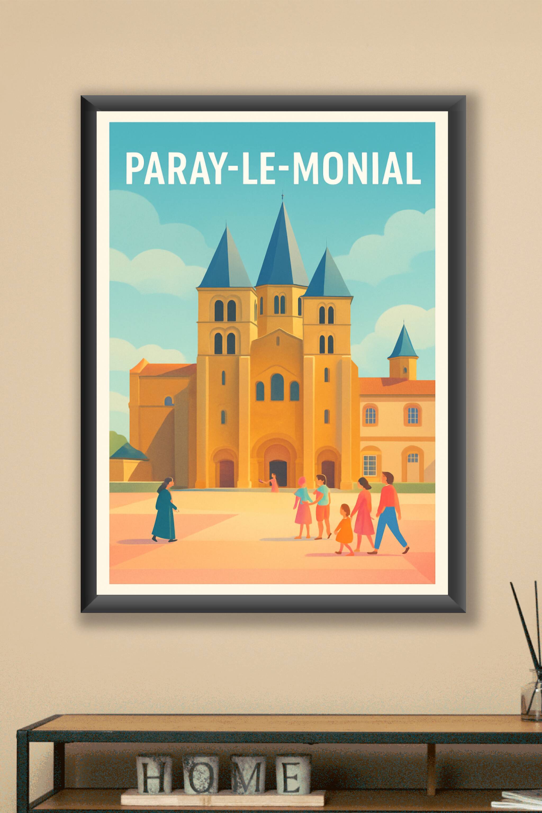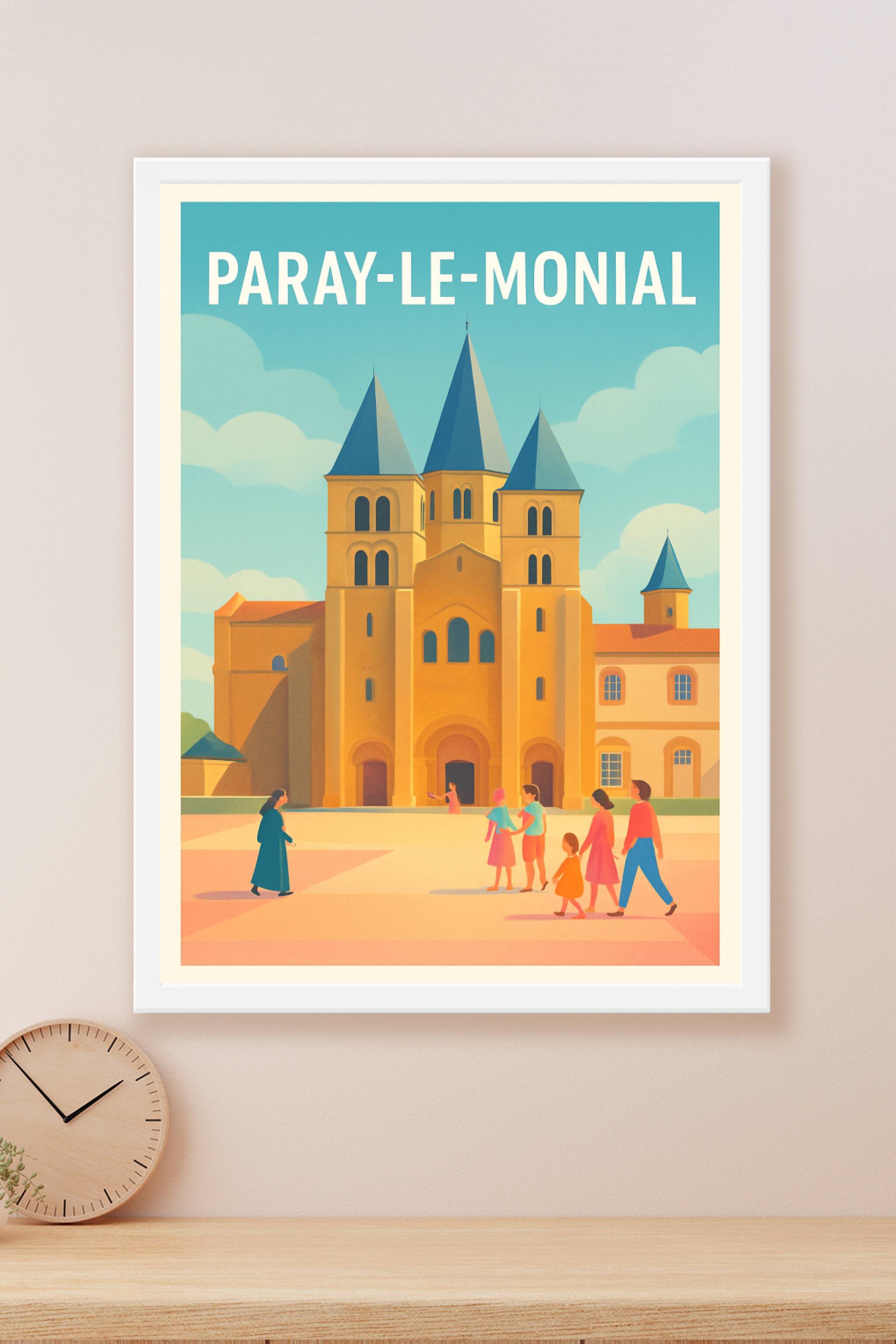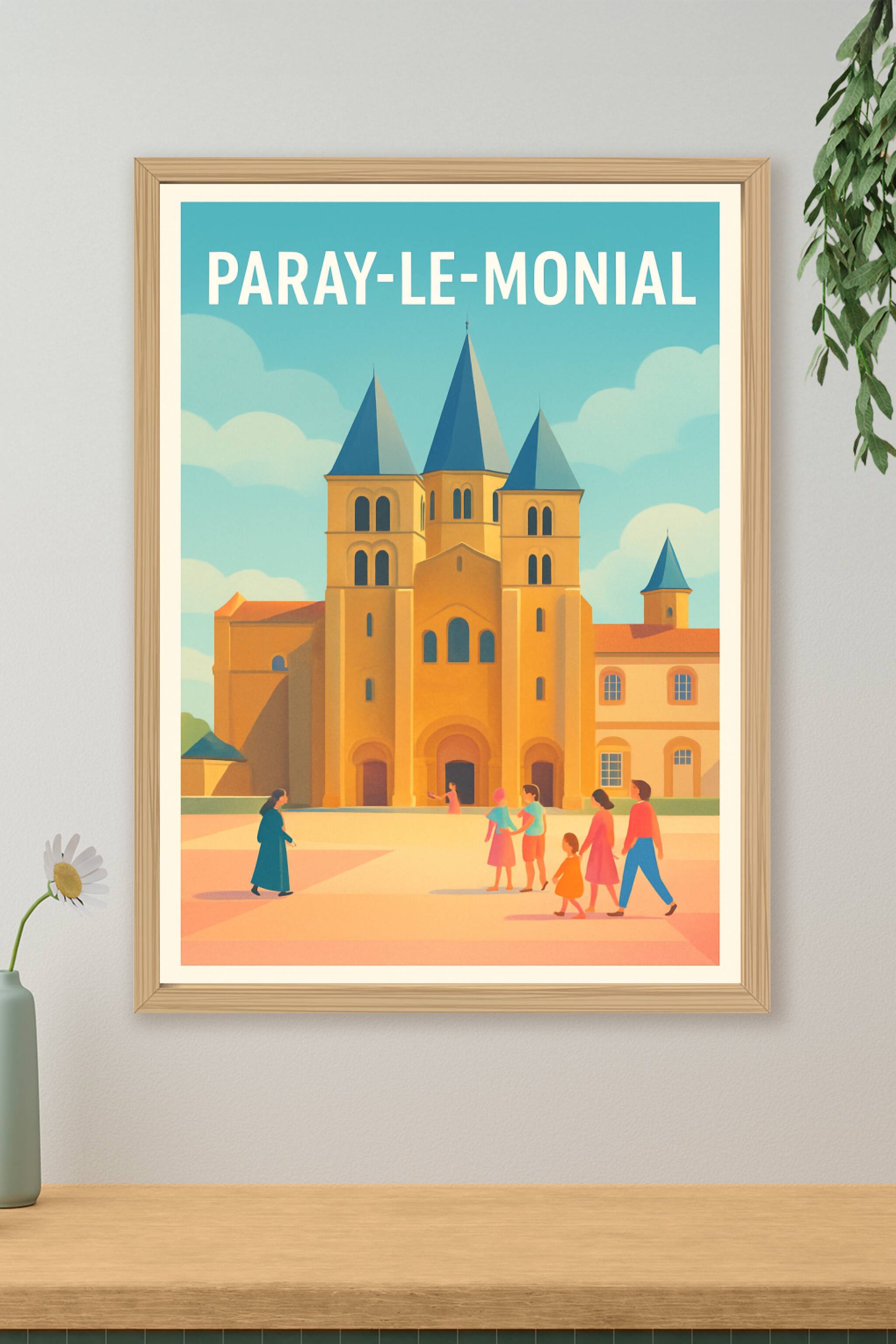 Découvrez la majesté intemporelle de Paray-le-Monial avec cette affiche illustrée mettant en valeur la célèbre basilique, emblème de l'histoire et ...