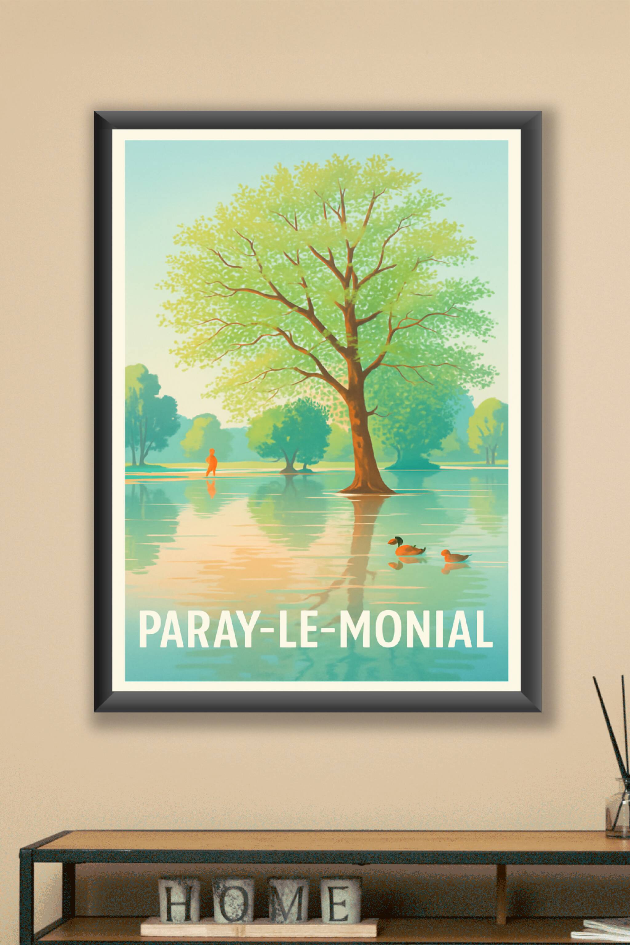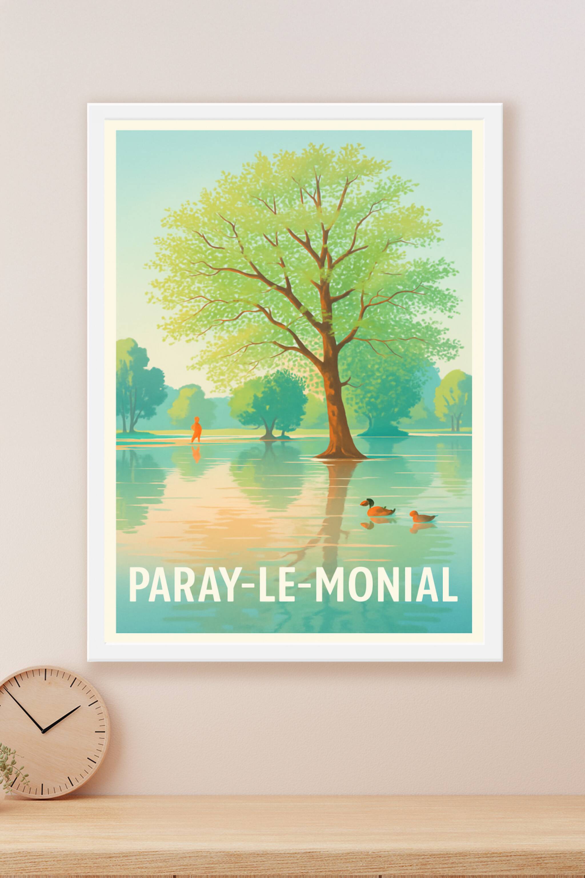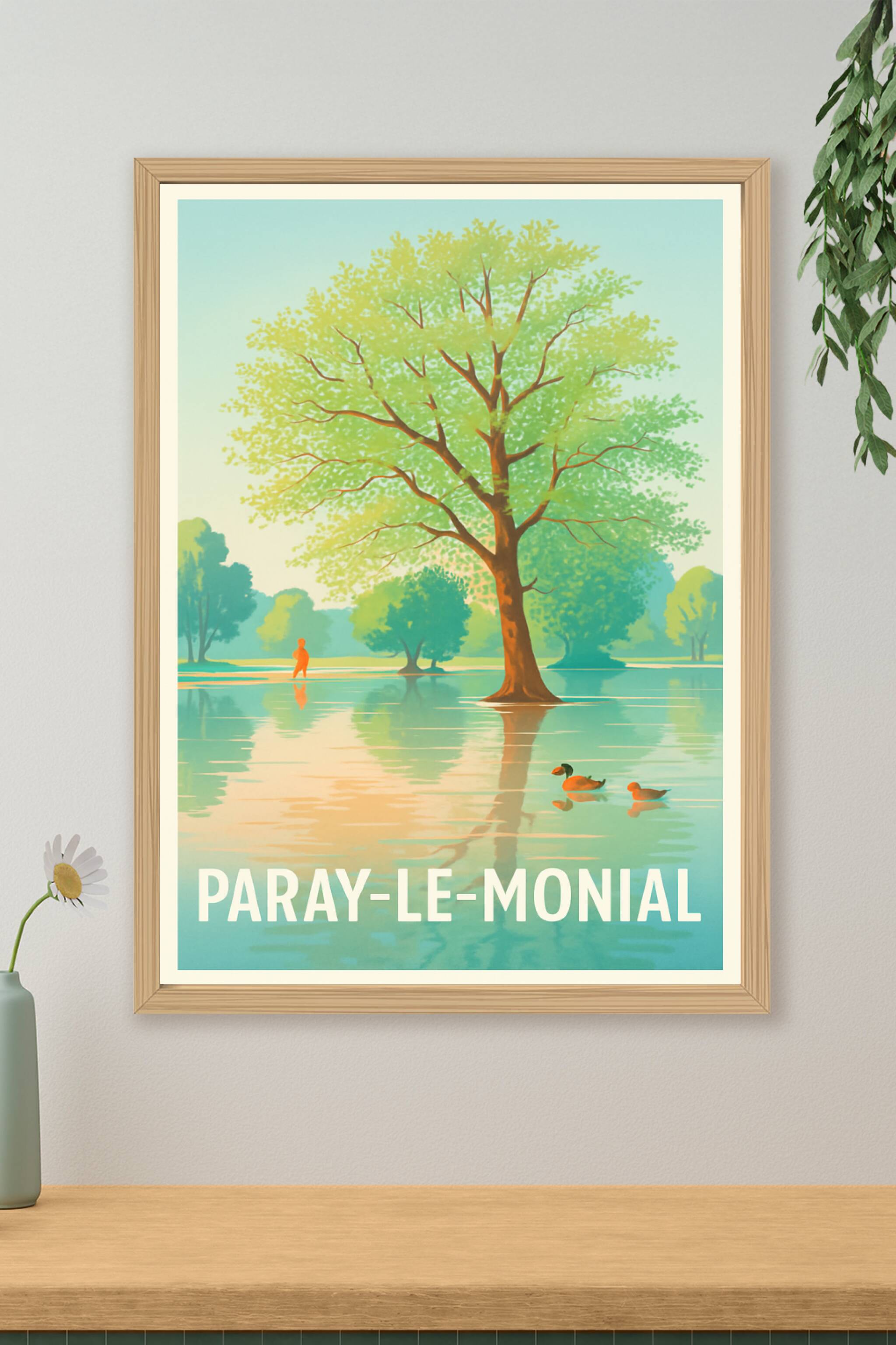 Découvrez la sérénité et la beauté naturelle de Paray-le-Monial avec cette affiche inspirante illustrant un paysage paisible au bord de l'eau, où u...