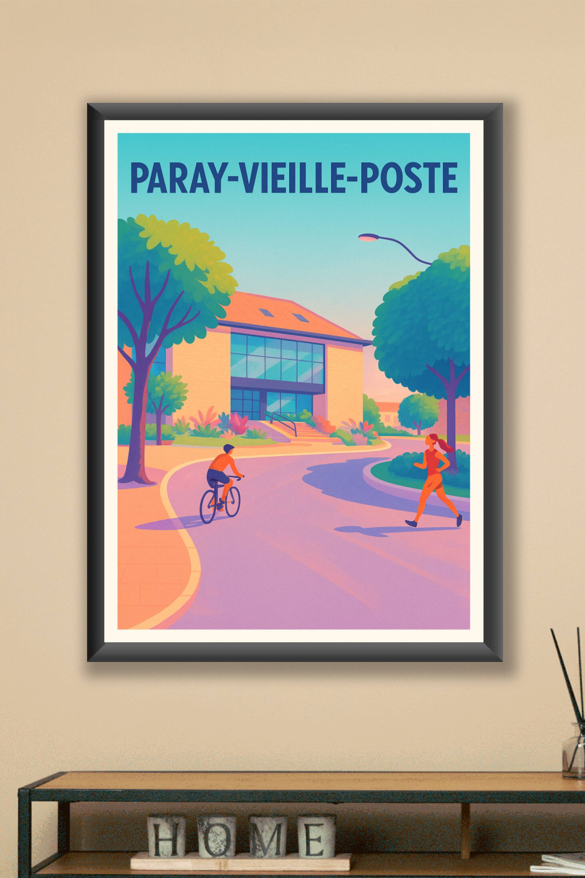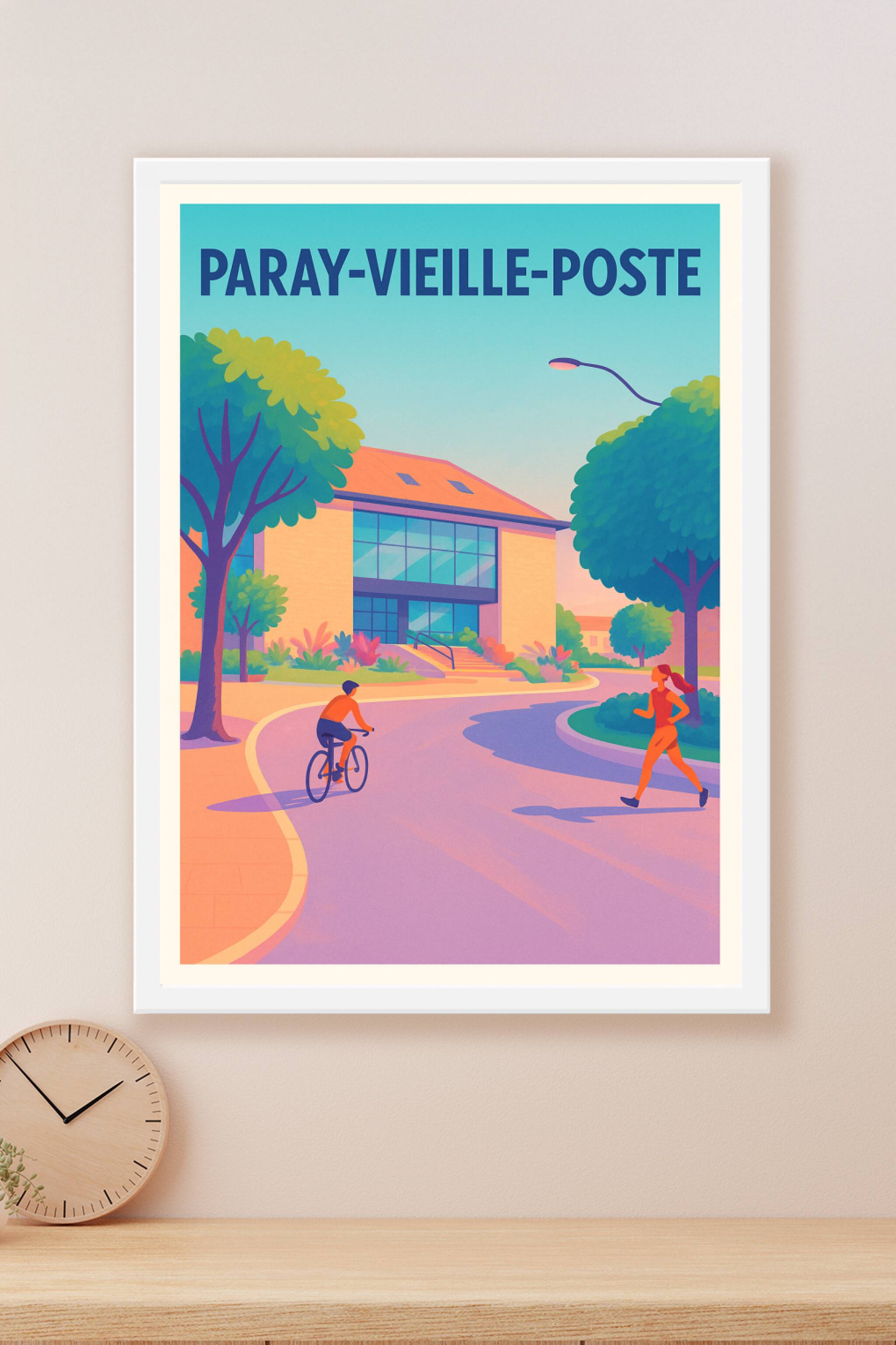 Découvrez l’atmosphère sereine de Paray-Vieille-Poste à travers cette affiche illustrée, mettant en scène une rue paisible animée par un cycliste e...