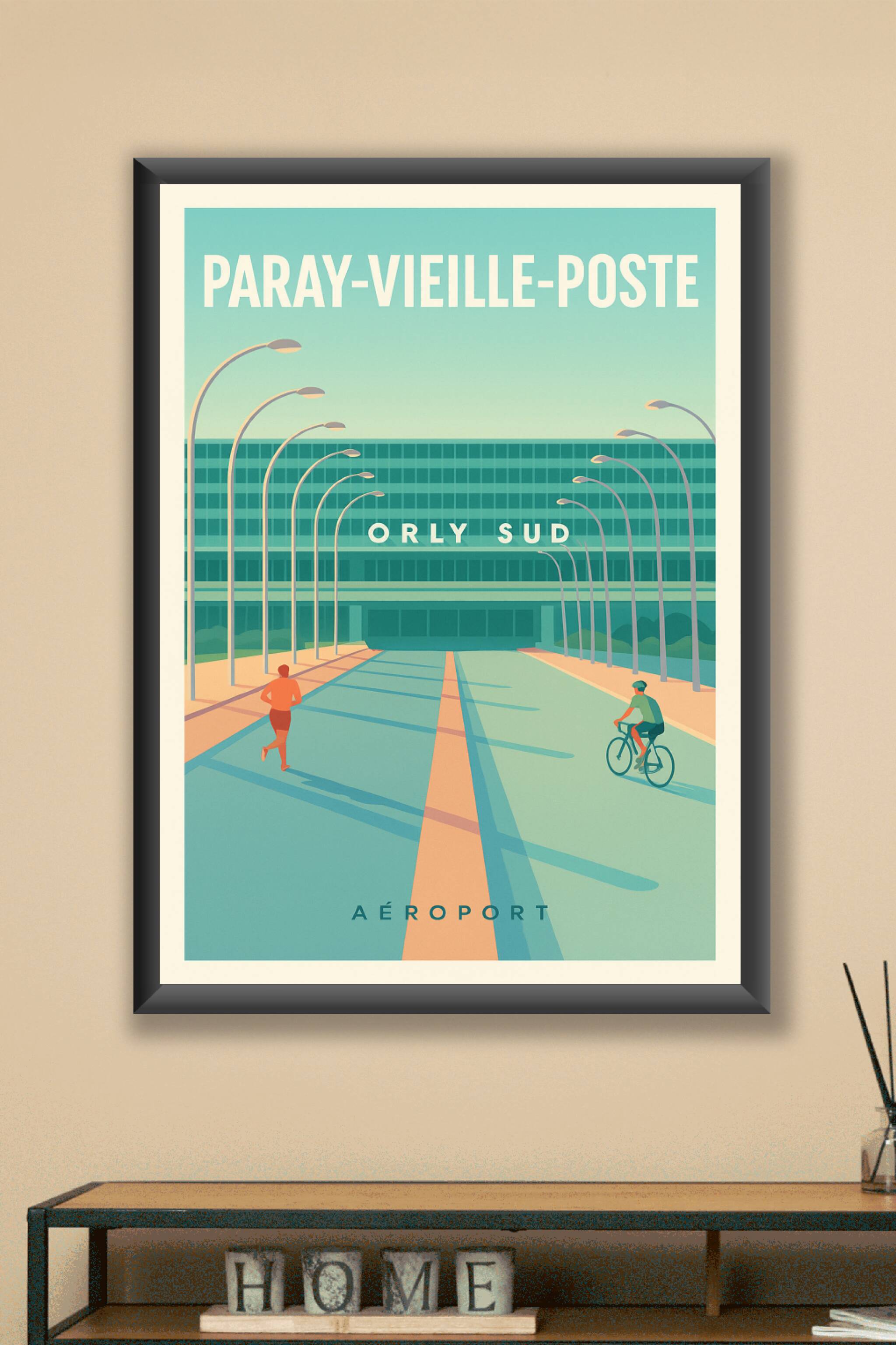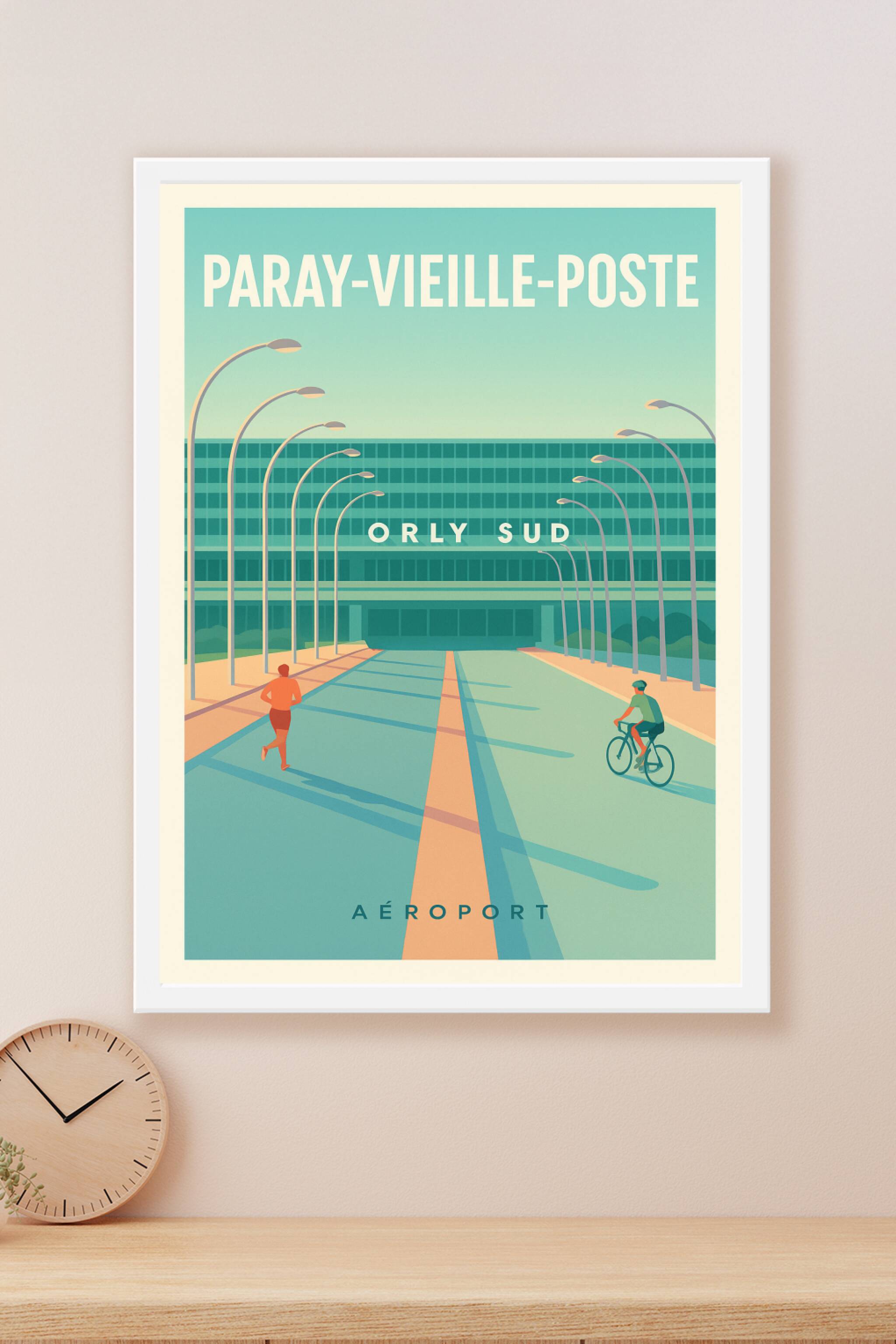 Découvrez cette affiche au design contemporain mettant en lumière l'entrée emblématique de l'Aéroport Orly Sud à Paray-Vieille-Poste. Le poster ill...