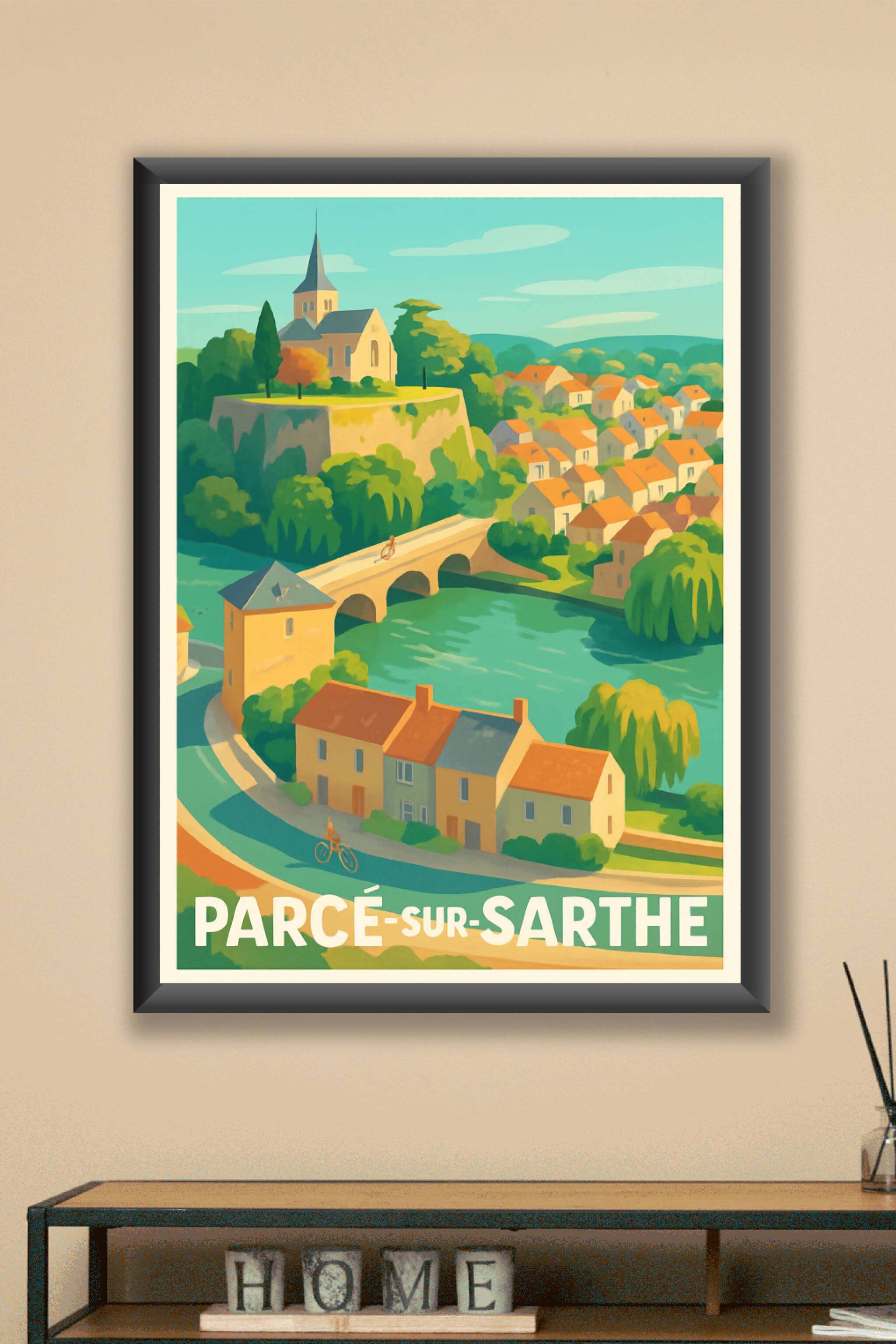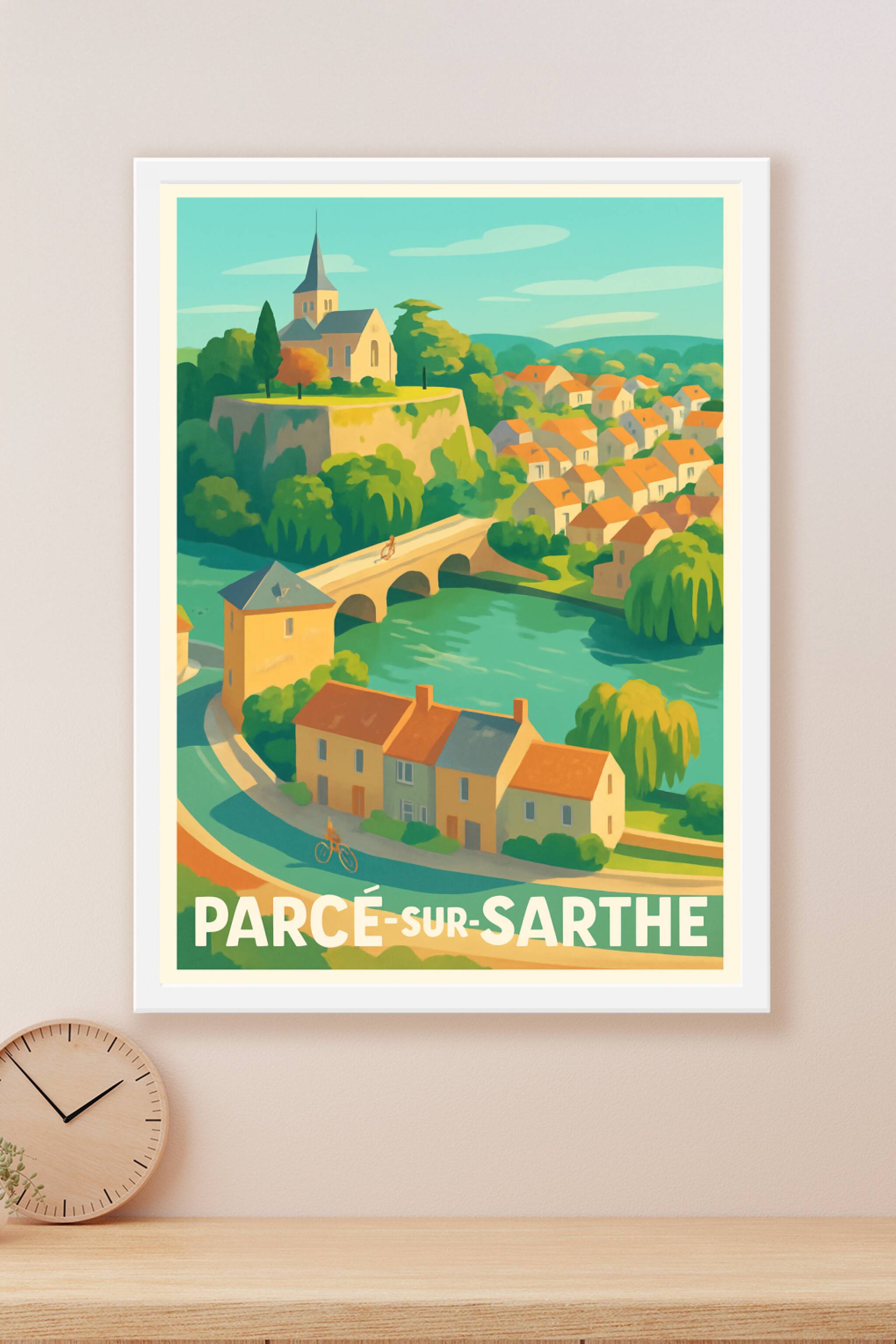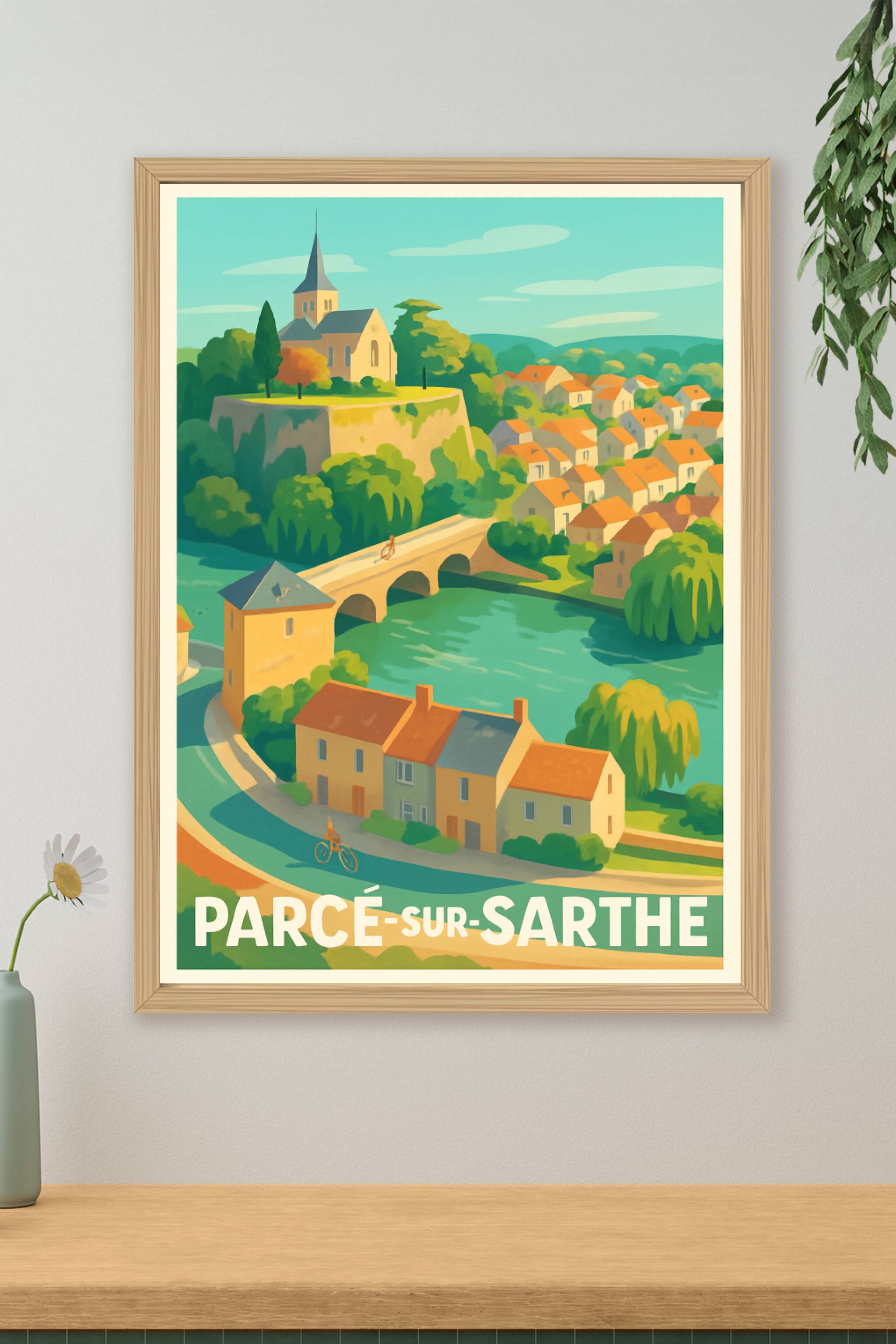 Découvrez l'envoûtante douceur de vivre à Parcé-sur-Sarthe avec cette affiche au design vintage doux et lumineux. Ce poster met en valeur le pont h...