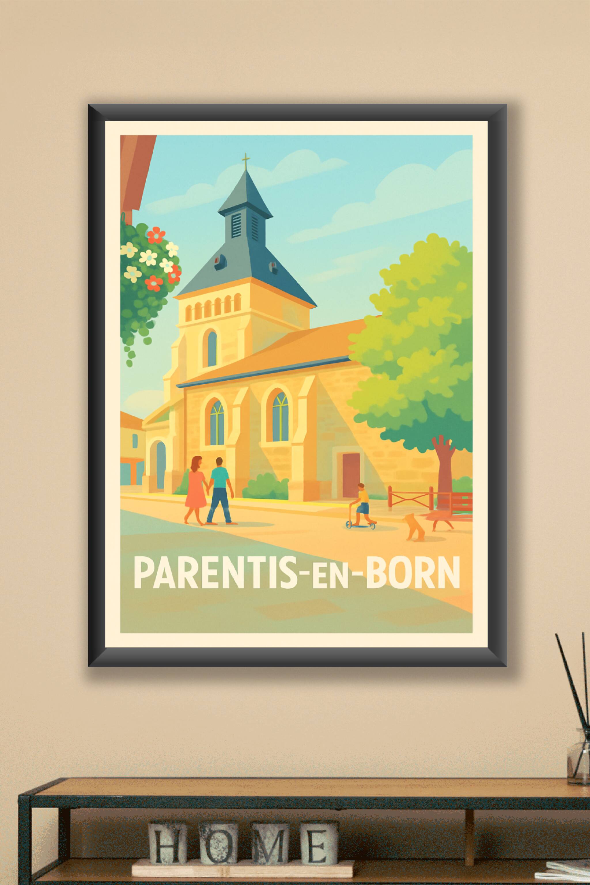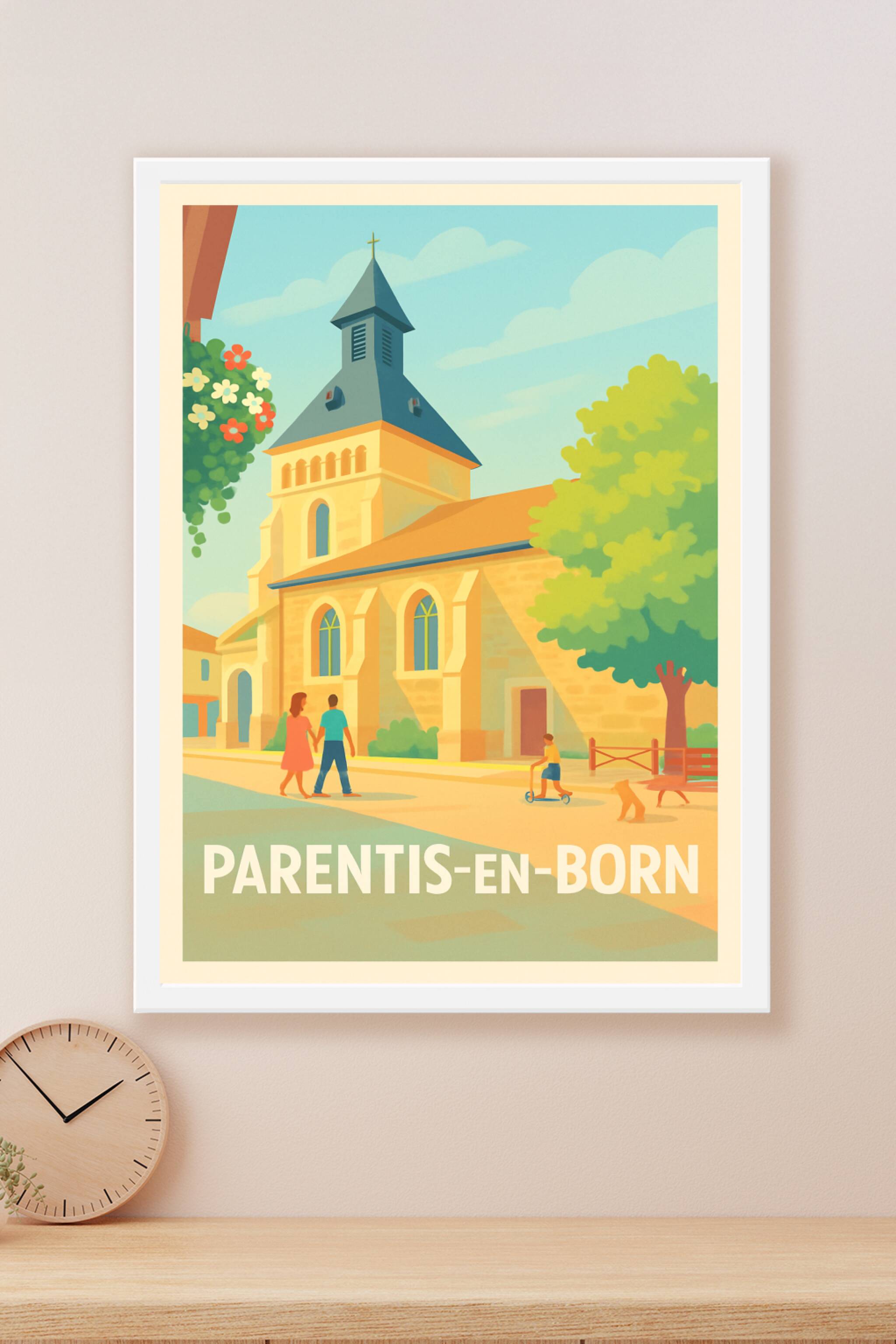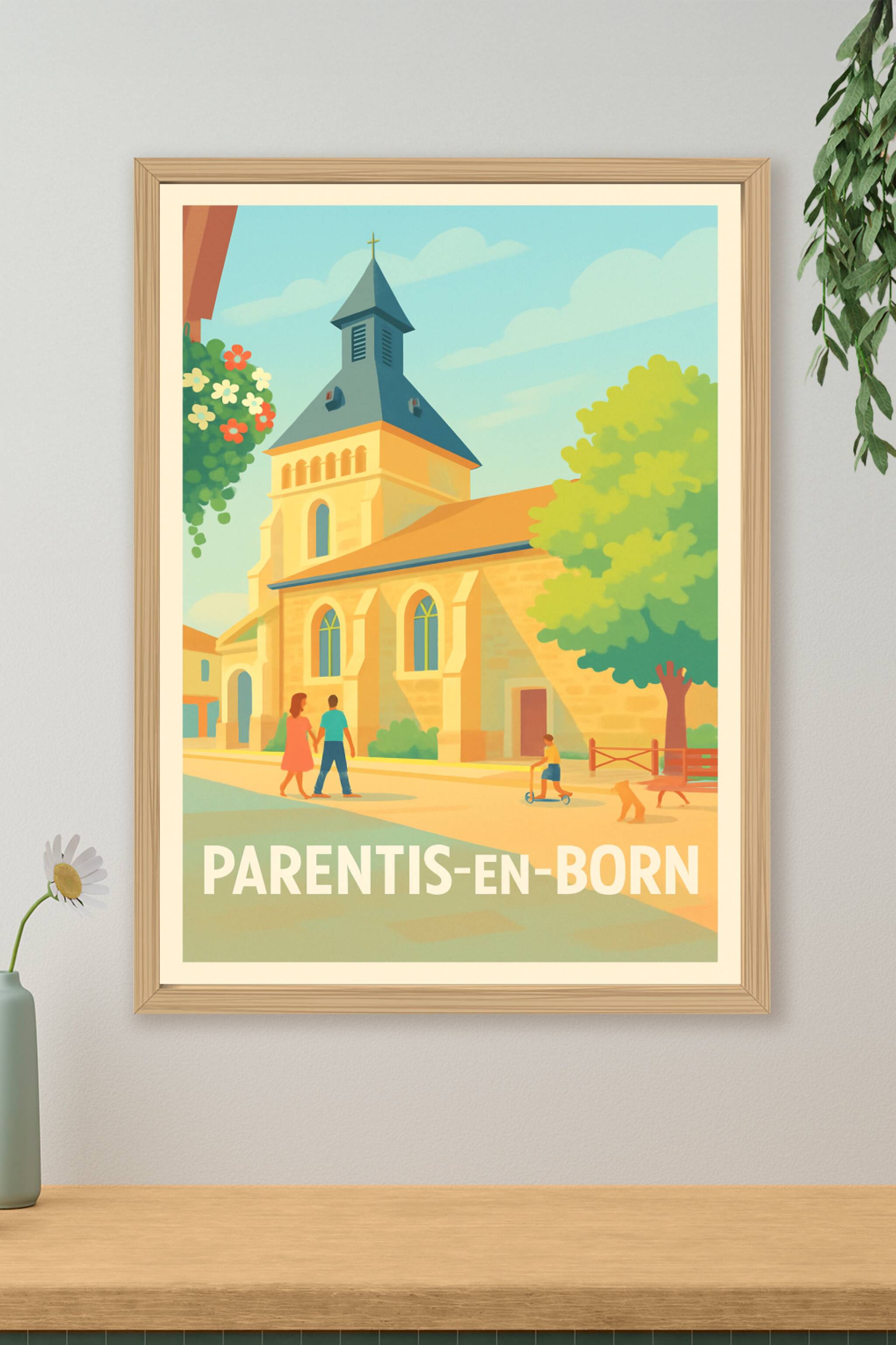 Découvrez le charme paisible de Parentis-en-Born à travers cette affiche illustrée dans un style vintage qui capture la lumière douce d'une après-midi ensoleillée. Ce poster met en scène un coin tranquille du village avec son église traditionnelle, un couple se promenant et un enfant à trottinette, évoquant une ambiance conviviale et familiale.Cette affiche est imprimée en tirage "Fine Art" sur un papier 305g coton de haute qualité pour assurer durabilité et rendu des couleurs exceptionnel. Disponibles en formats A1 à A4, avec ou sans cadre, ces posters s'adaptent parfaitement à tous les styles d'intérieur.Offrez-vous une décoration élégante et chaleureuse ou un cadeau unique inspiré de la douceur de vivre landaise, grâce à une qualité d'impression premium 100% fabriquée en France.