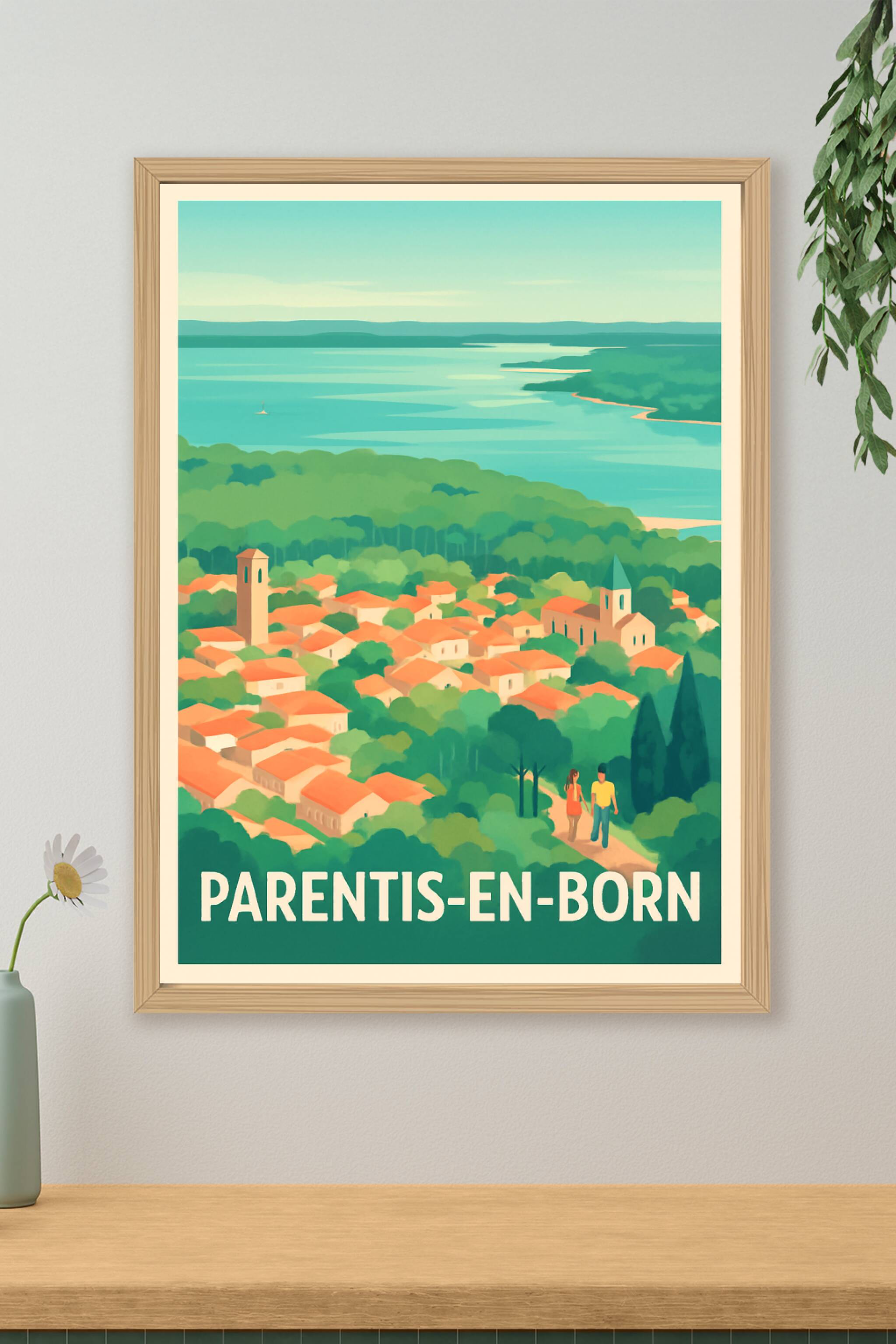 Découvrez la sérénité de Parentis-en-Born avec cette affiche illustrée mettant en valeur les toits typiques de la ville et son cadre naturel paisib...