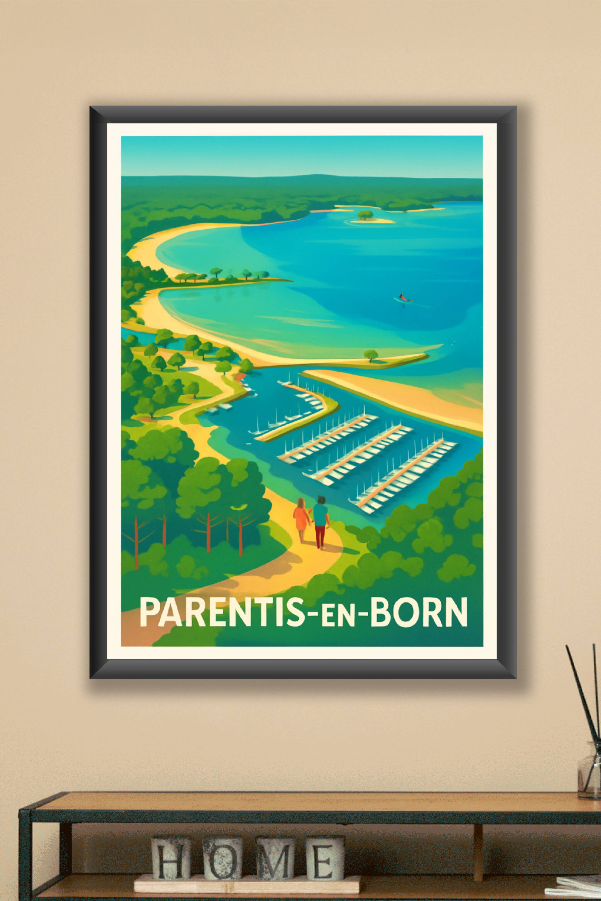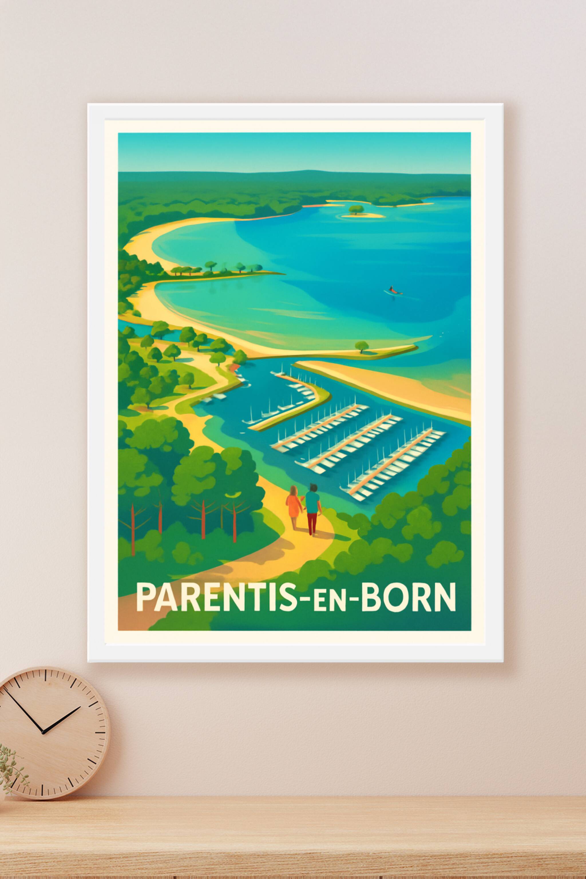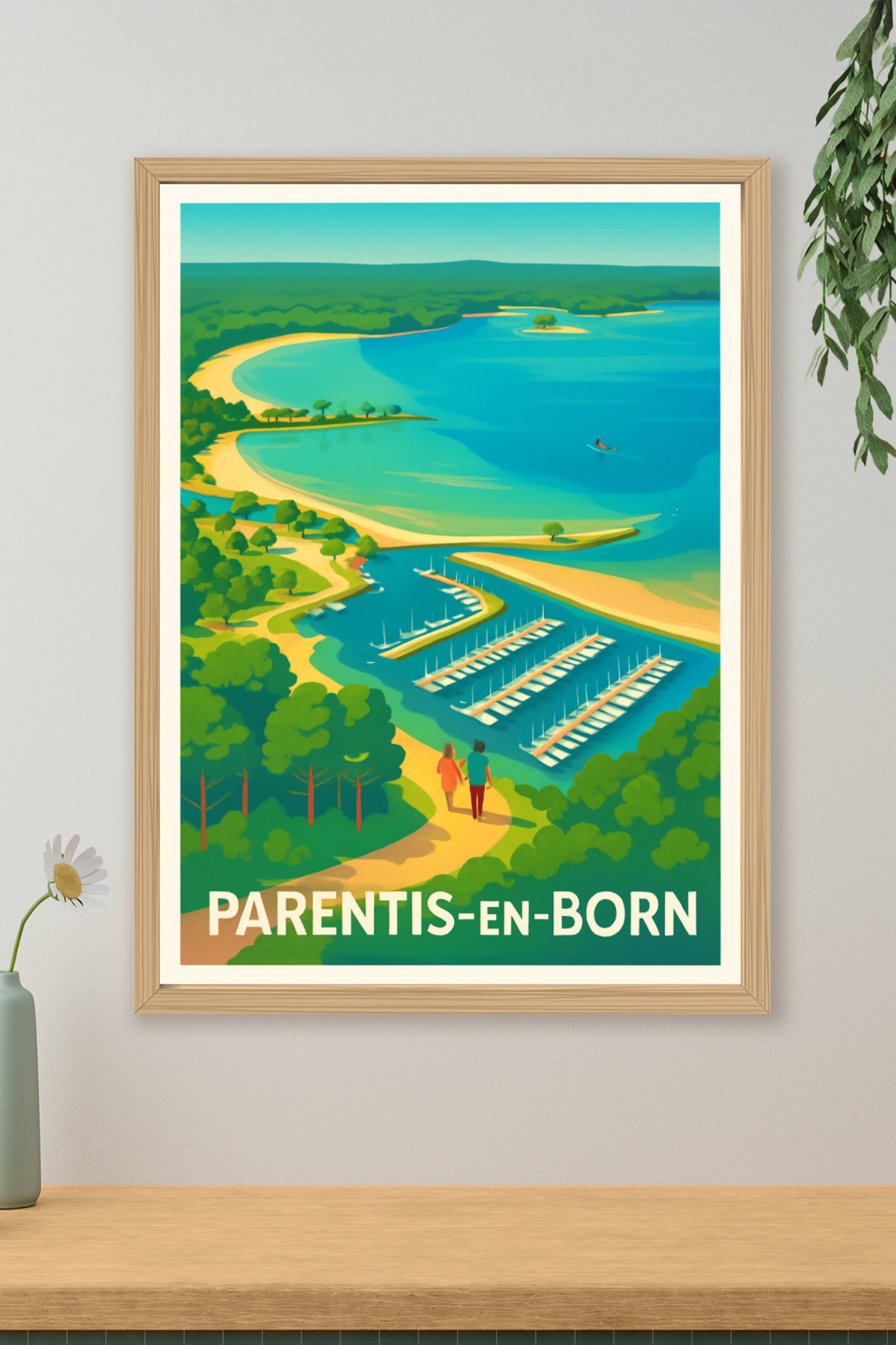 Découvrez la beauté naturelle et apaisante de Parentis-en-Born avec cette affiche illustrée mettant en scène son lac tranquille et son port de plai...