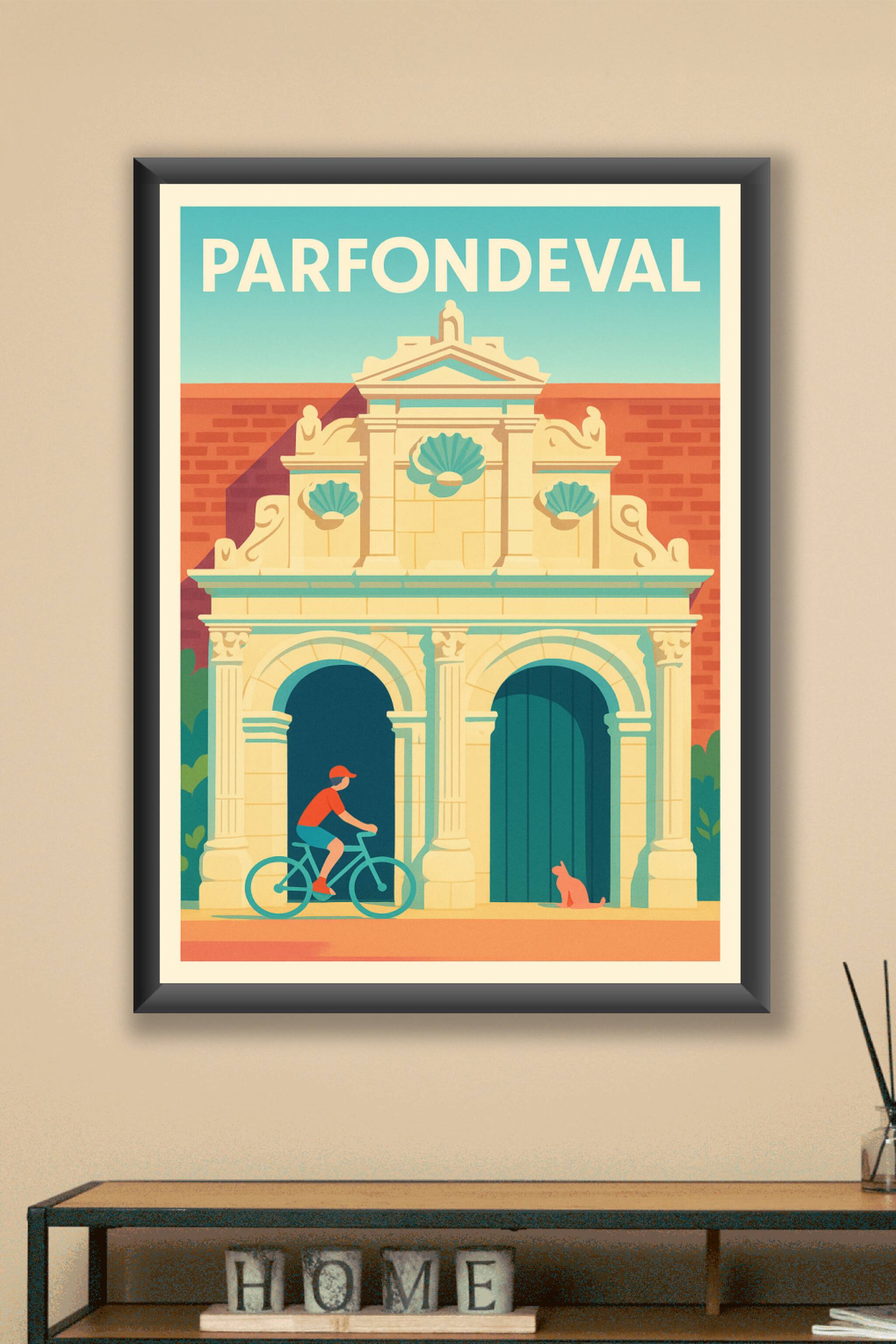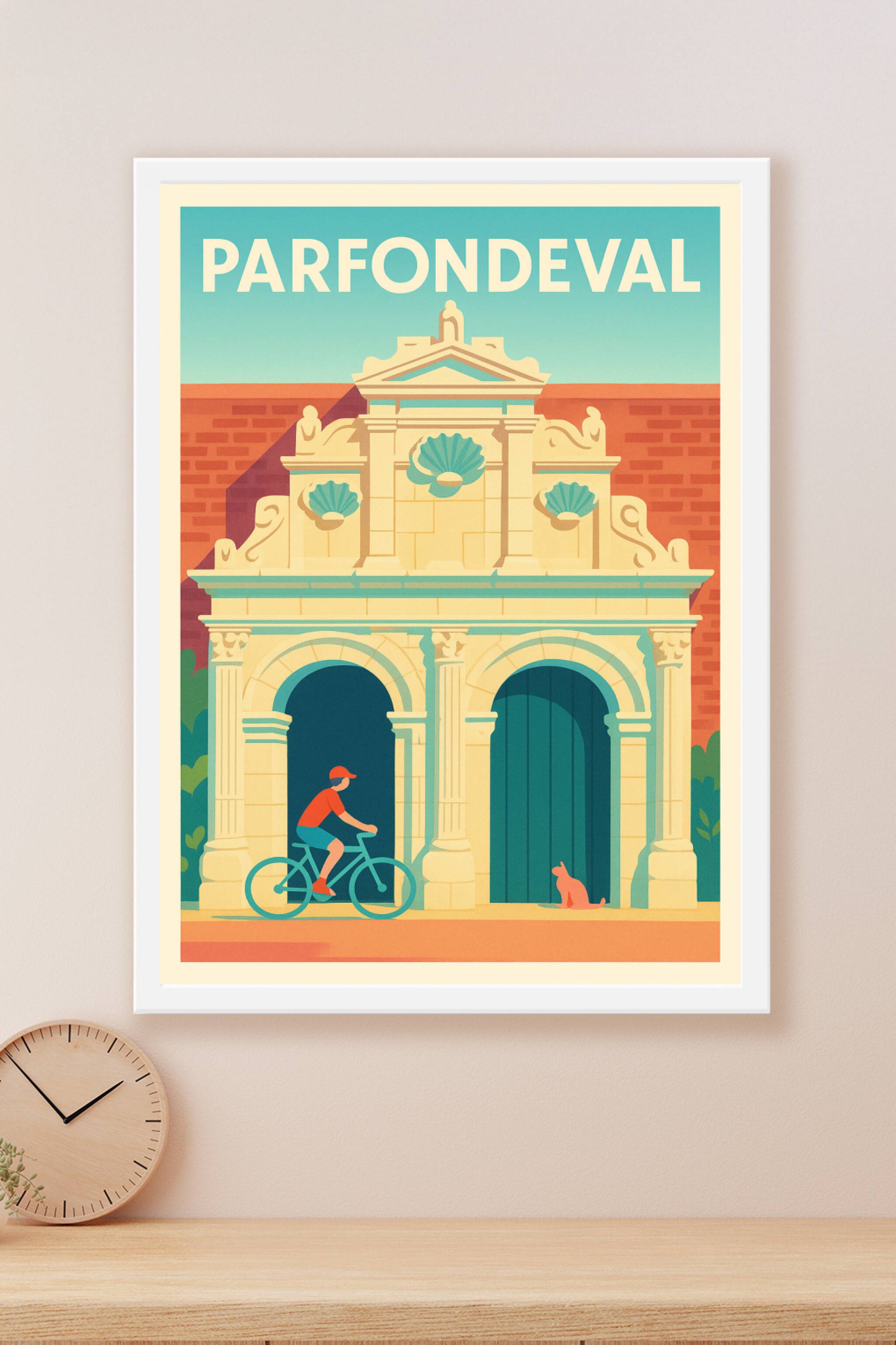 Découvrez le charme unique de Parfondeval avec ce poster illustré mettant en scène une architecture remarquable de la ville, sublimée par des coule...
