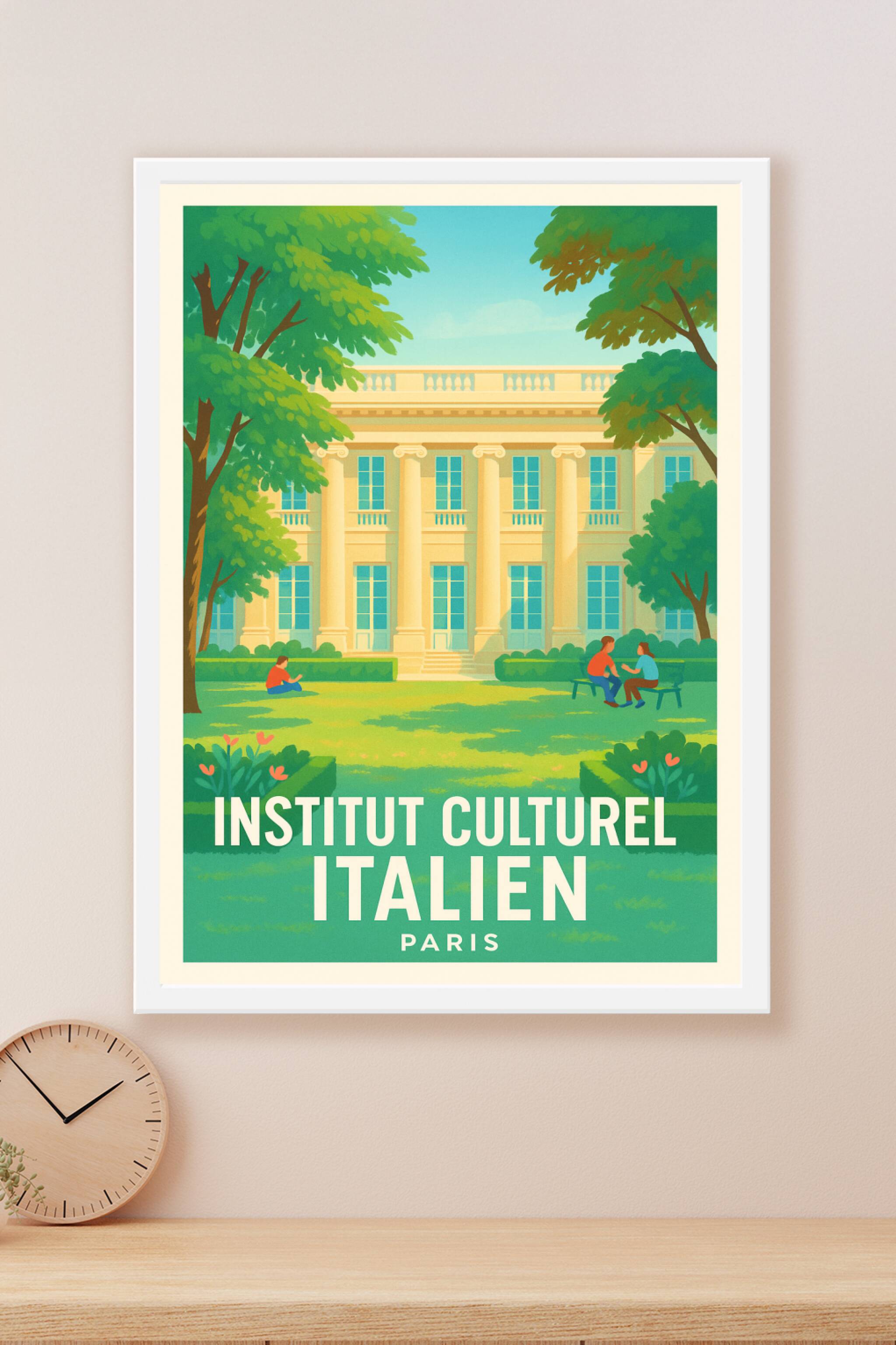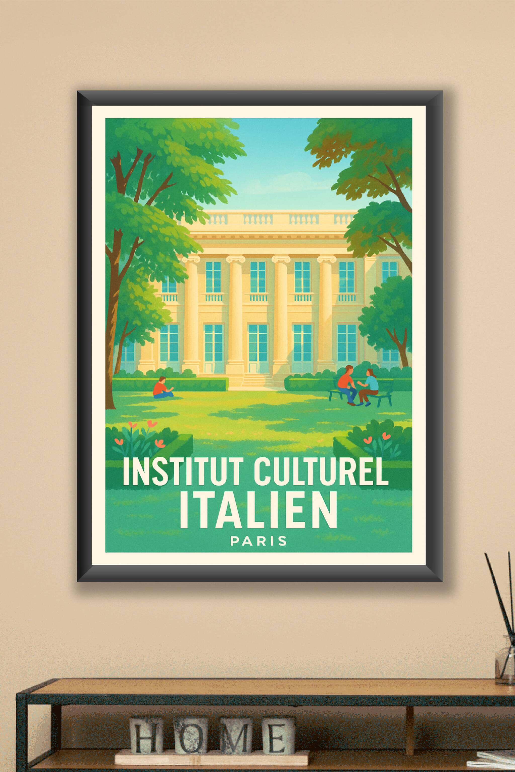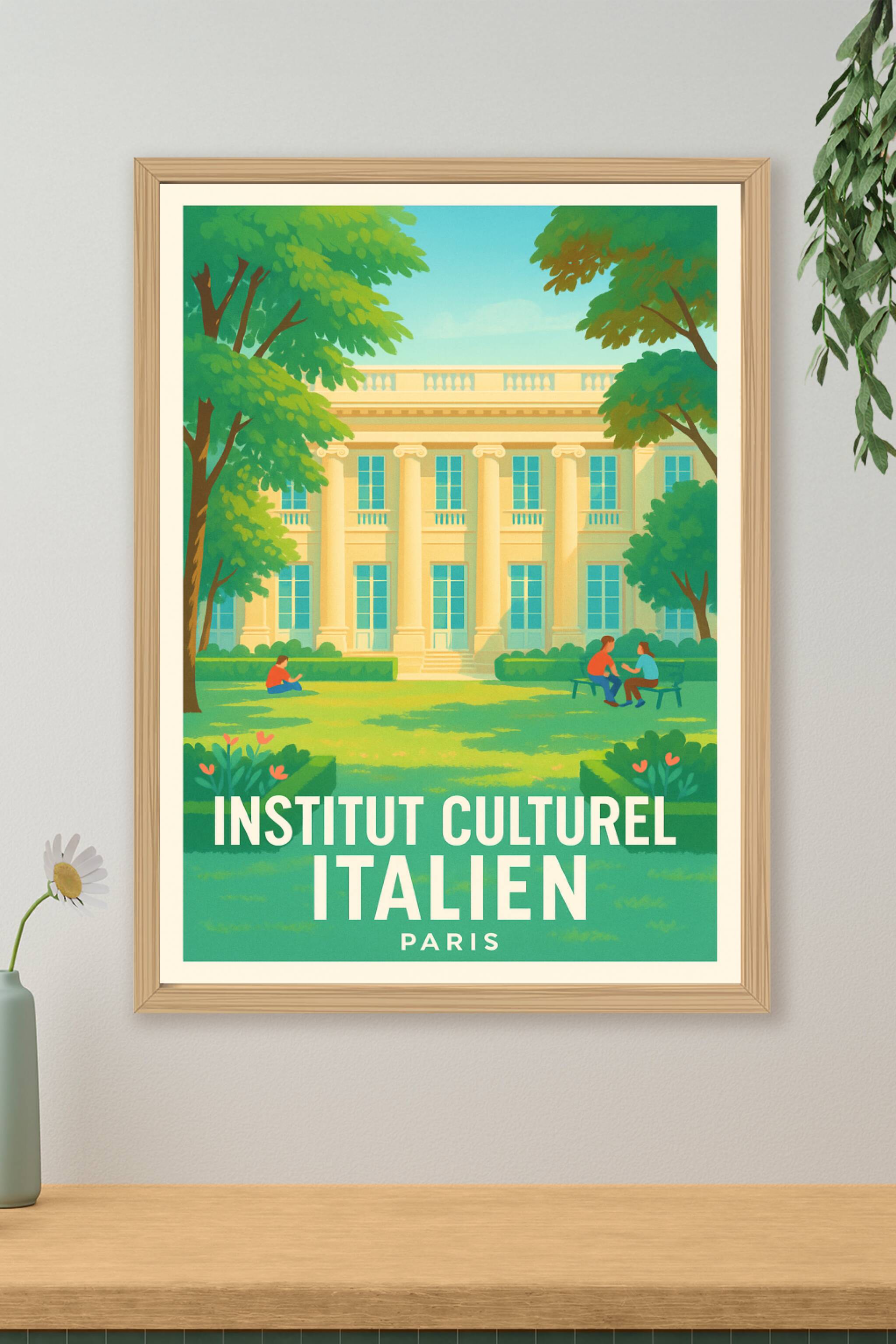 Découvrez l'élégance et la tranquillité du jardin de l'Institut Culturel Italien à Paris avec cette affiche au style illustratif doux et lumineux. ...