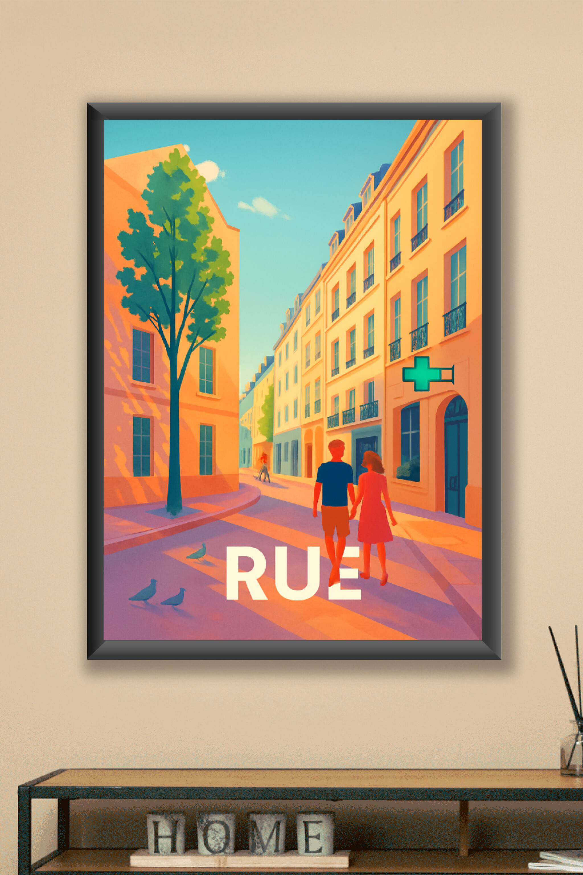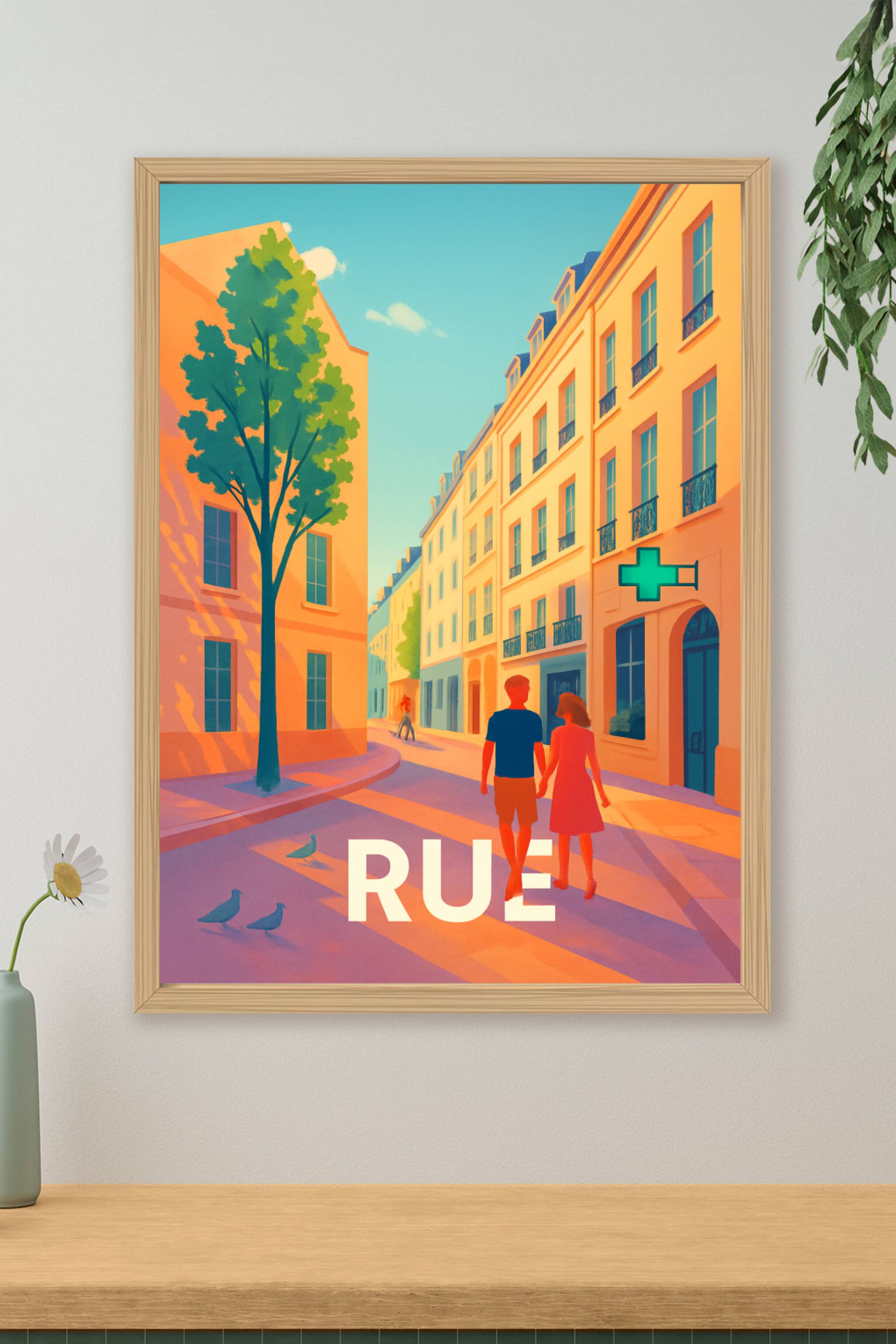 Capturez la douceur et la lumière unique des rues parisiennes avec cette affiche illustrant un couple se promenant au cœur d'un quartier calme baig...