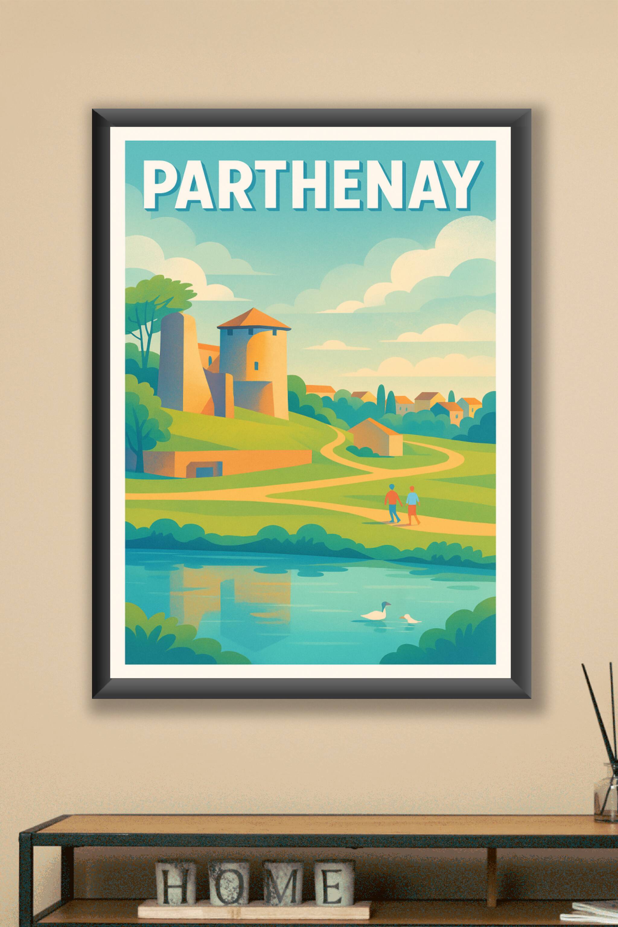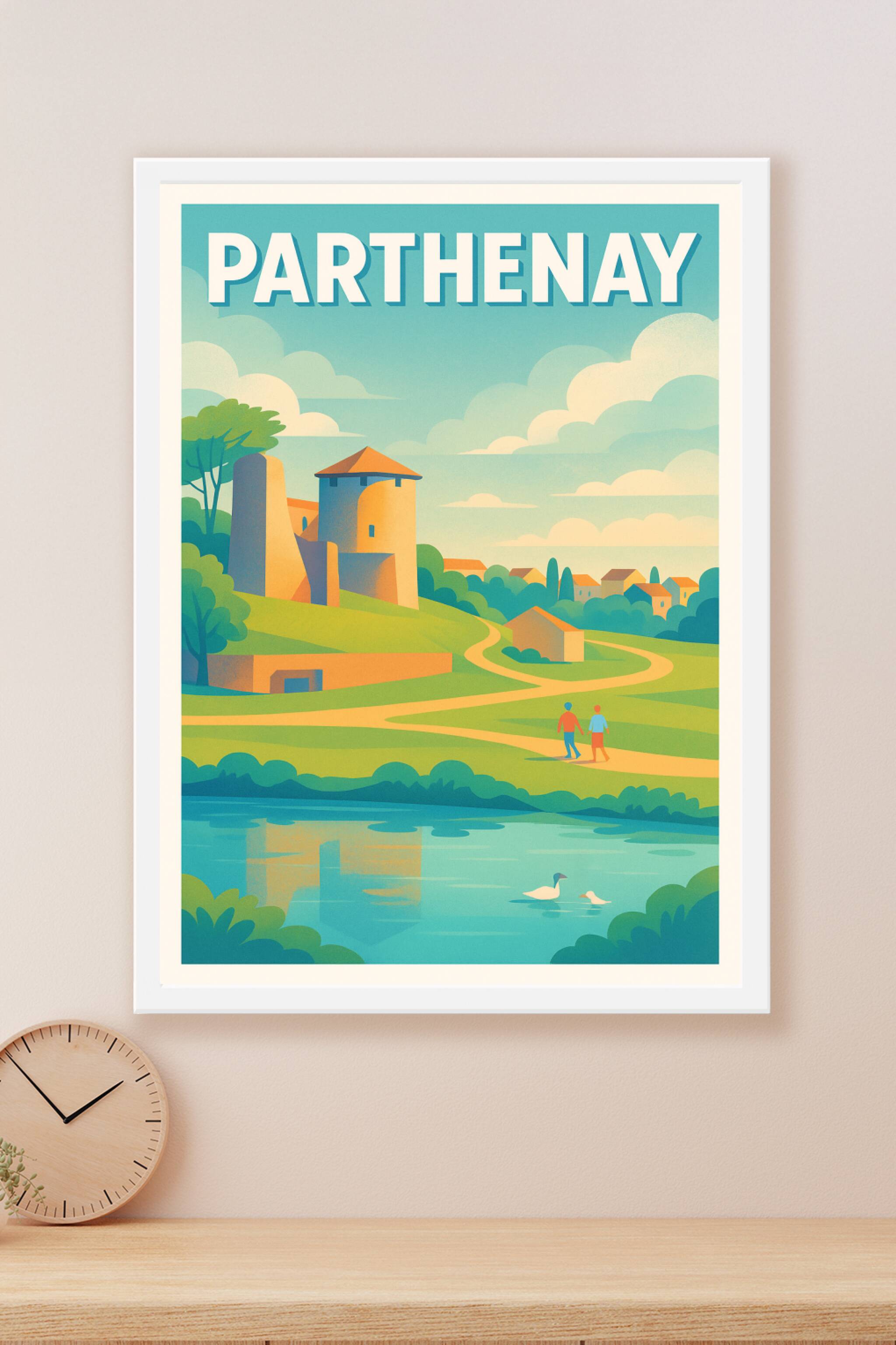 Découvrez l'élégance bucolique de Parthenay avec cette affiche illustrée où la douceur des paysages, les ruines médiévales et le calme de la rivièr...