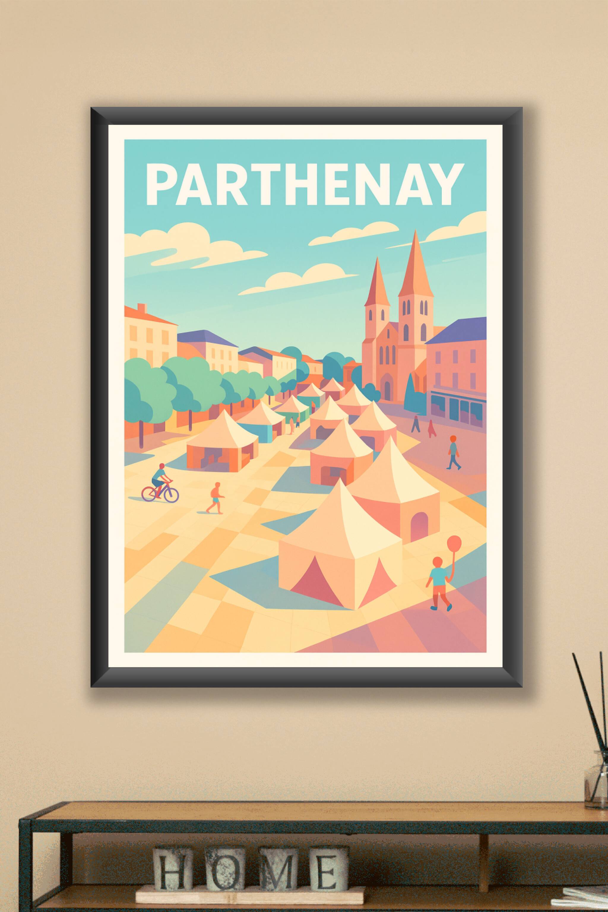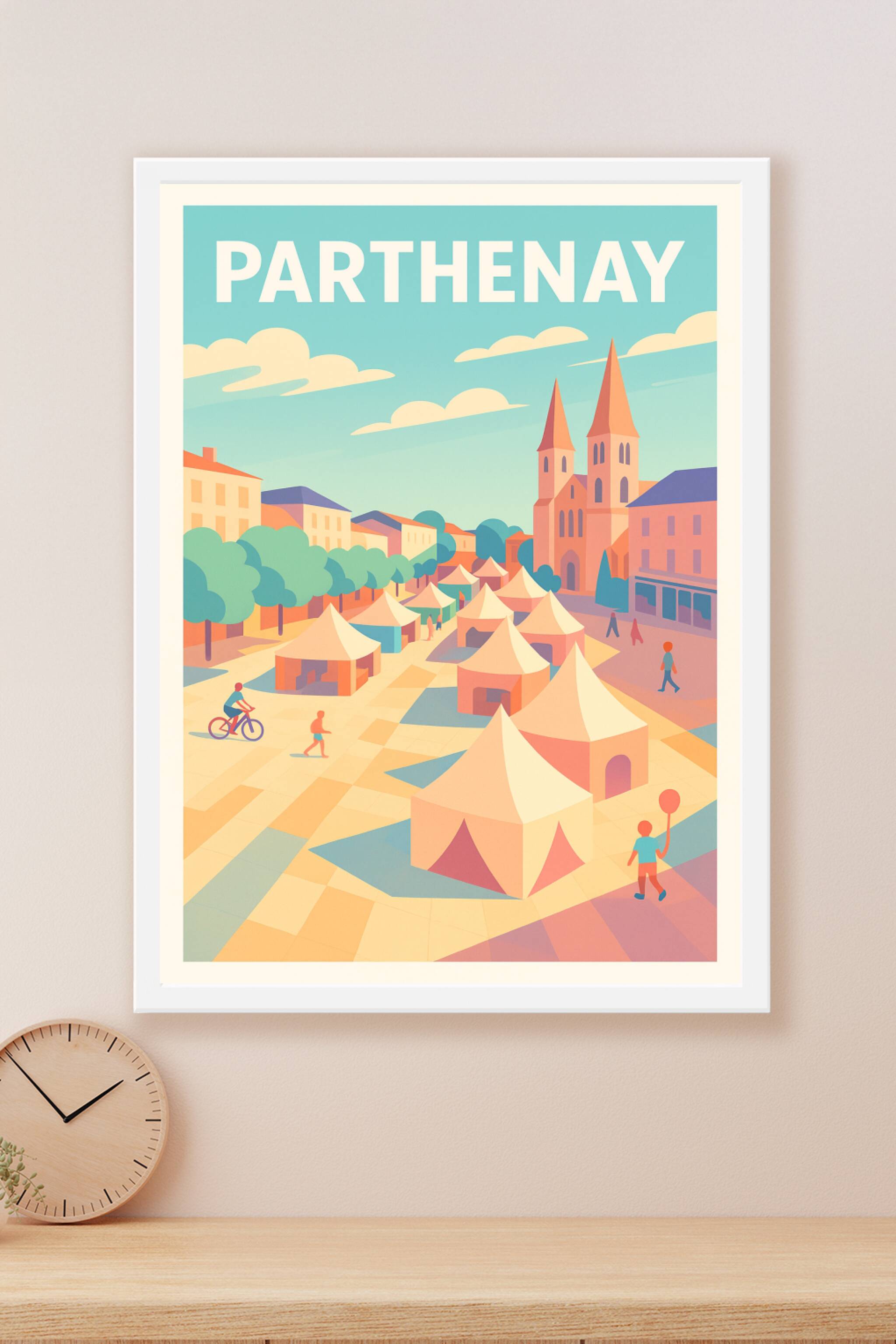 Découvrez l'ambiance conviviale et colorée de Parthenay avec cette affiche illustrée mettant en scène son charmant marché et ses architectures typi...