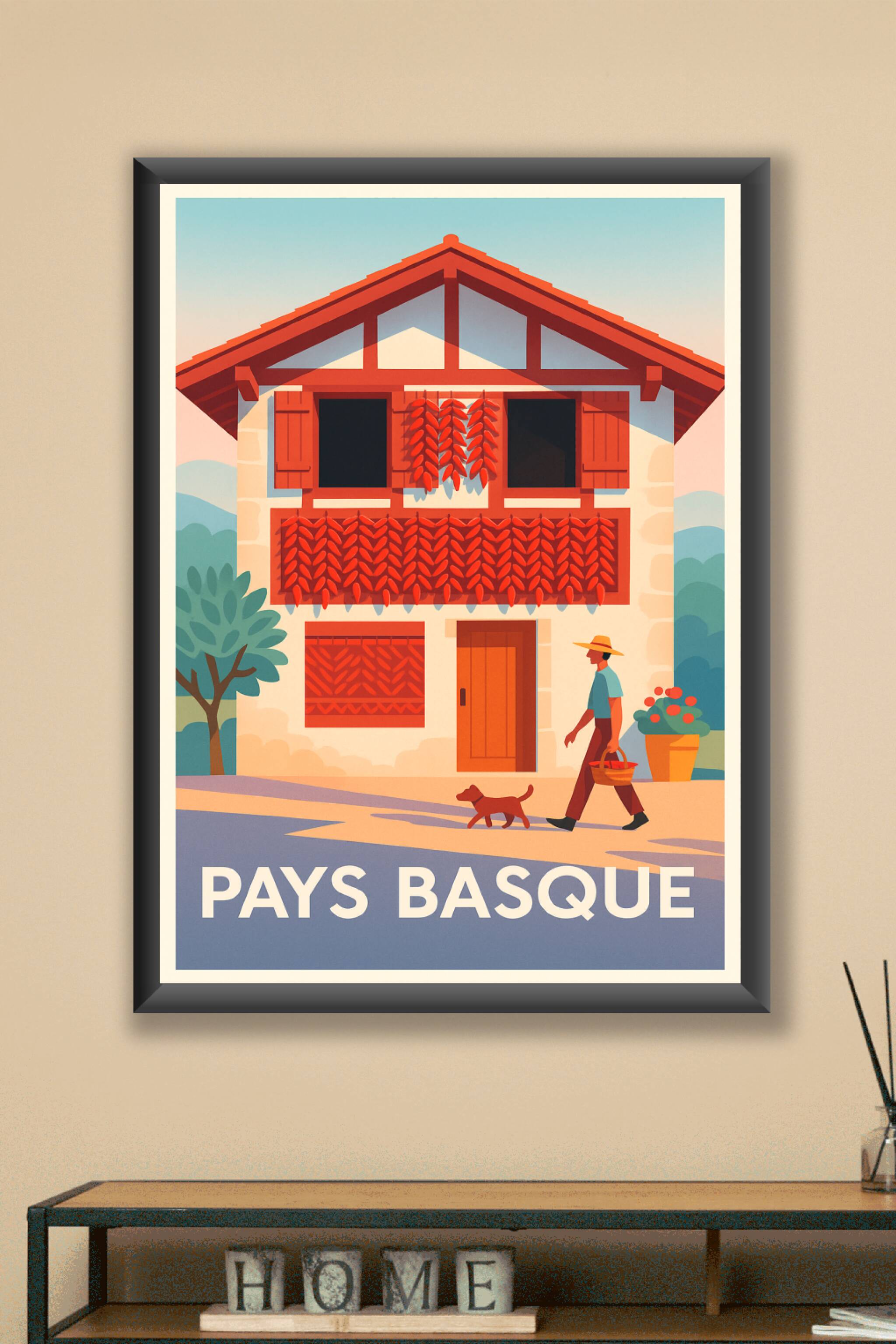 Découvrez le charme unique du Pays Basque à travers cette affiche au style vintage et chaleureux. L'illustration met en scène une maison traditionn...