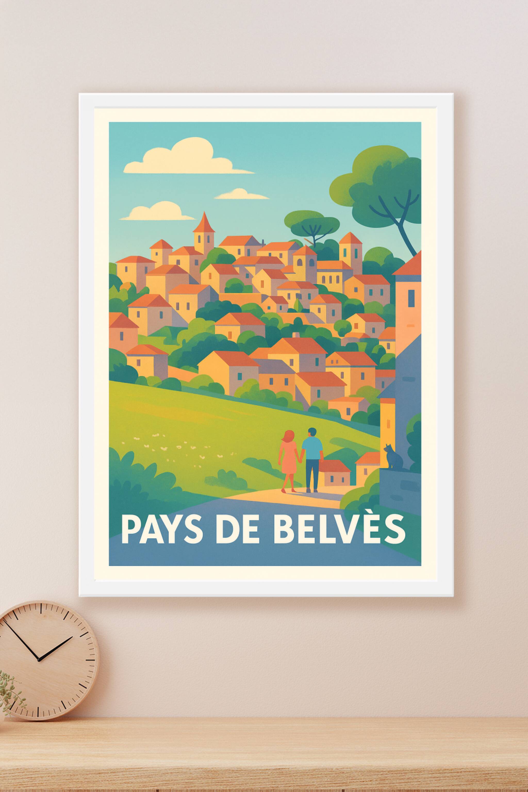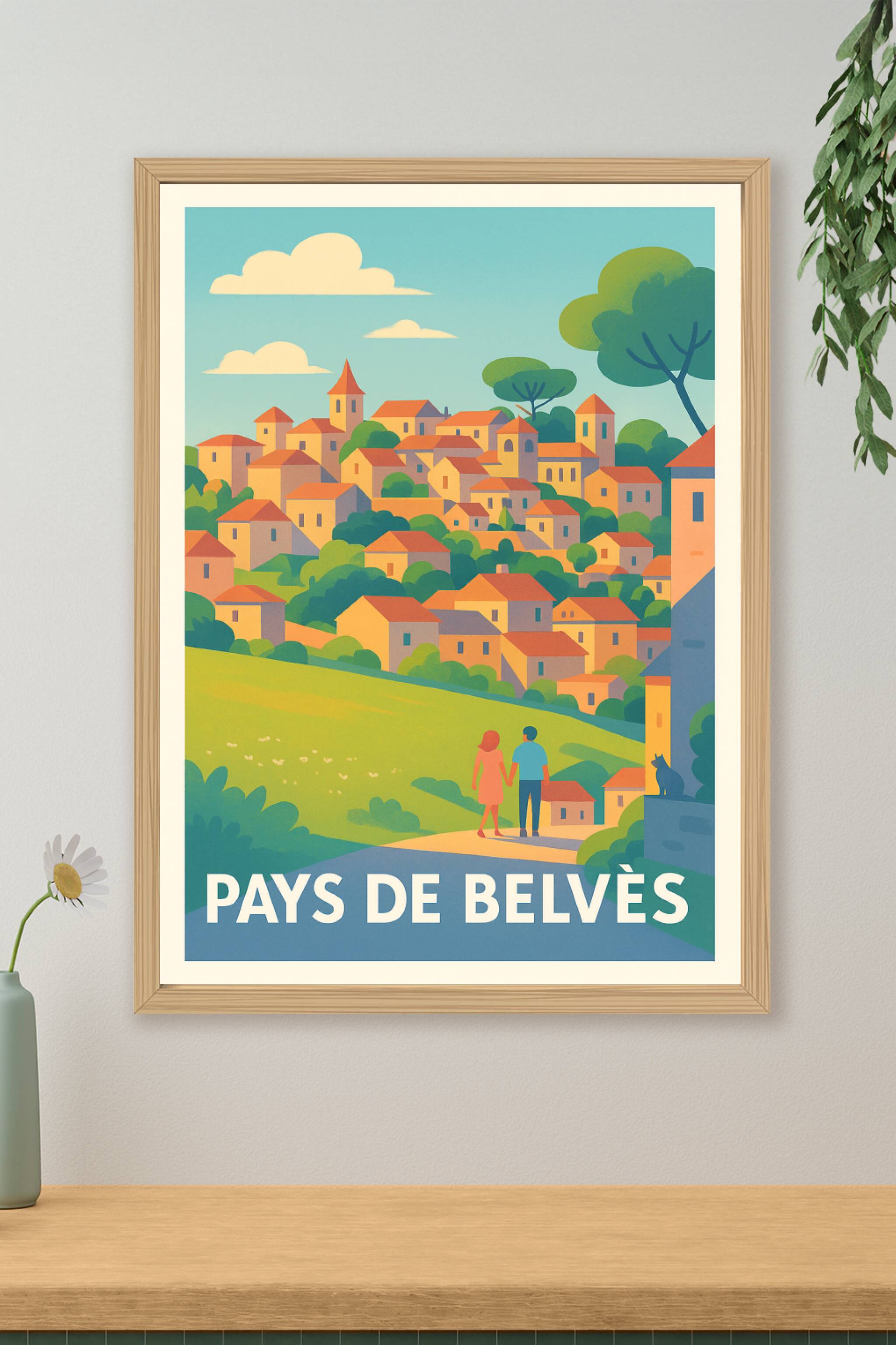 Découvrez le paysage bucolique et pittoresque du Pays de Belvès avec cette affiche au style rétro et coloré, qui met en lumière le charme authentiq...