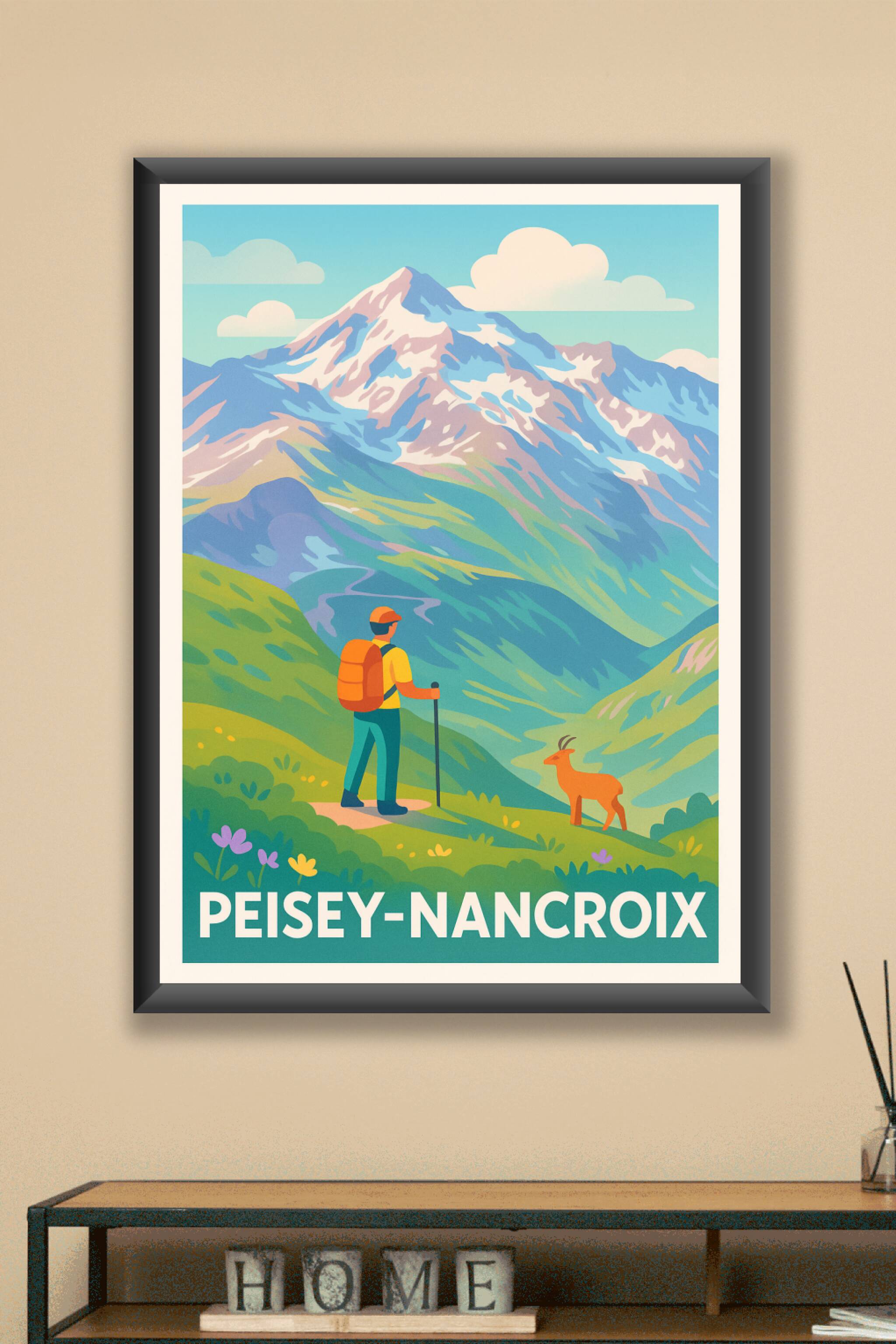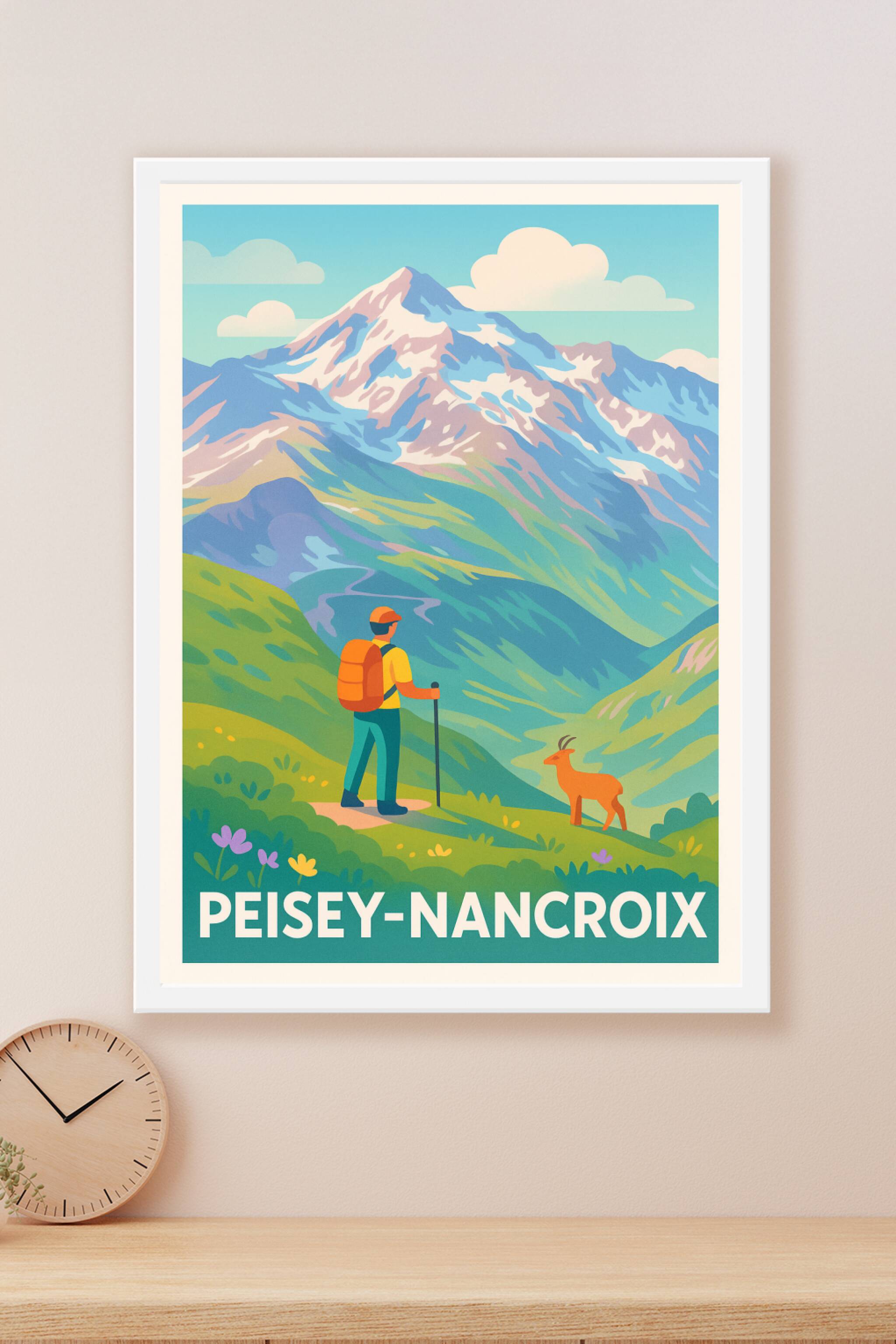Découvrez la beauté naturelle de Peisey-Nancroix avec cette affiche inspirante qui capture une scène de randonnée au cœur des sommets alpins. Ce po...