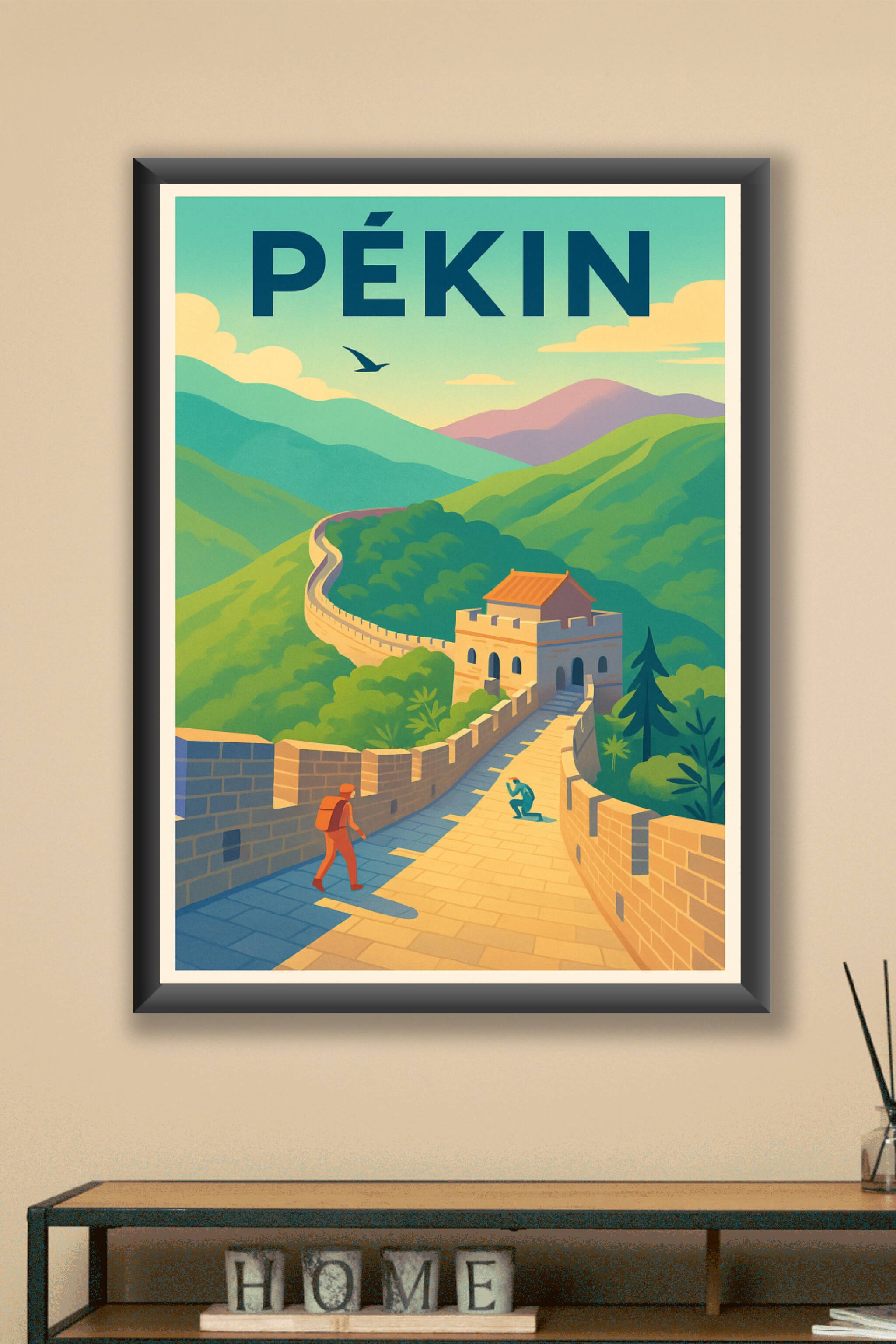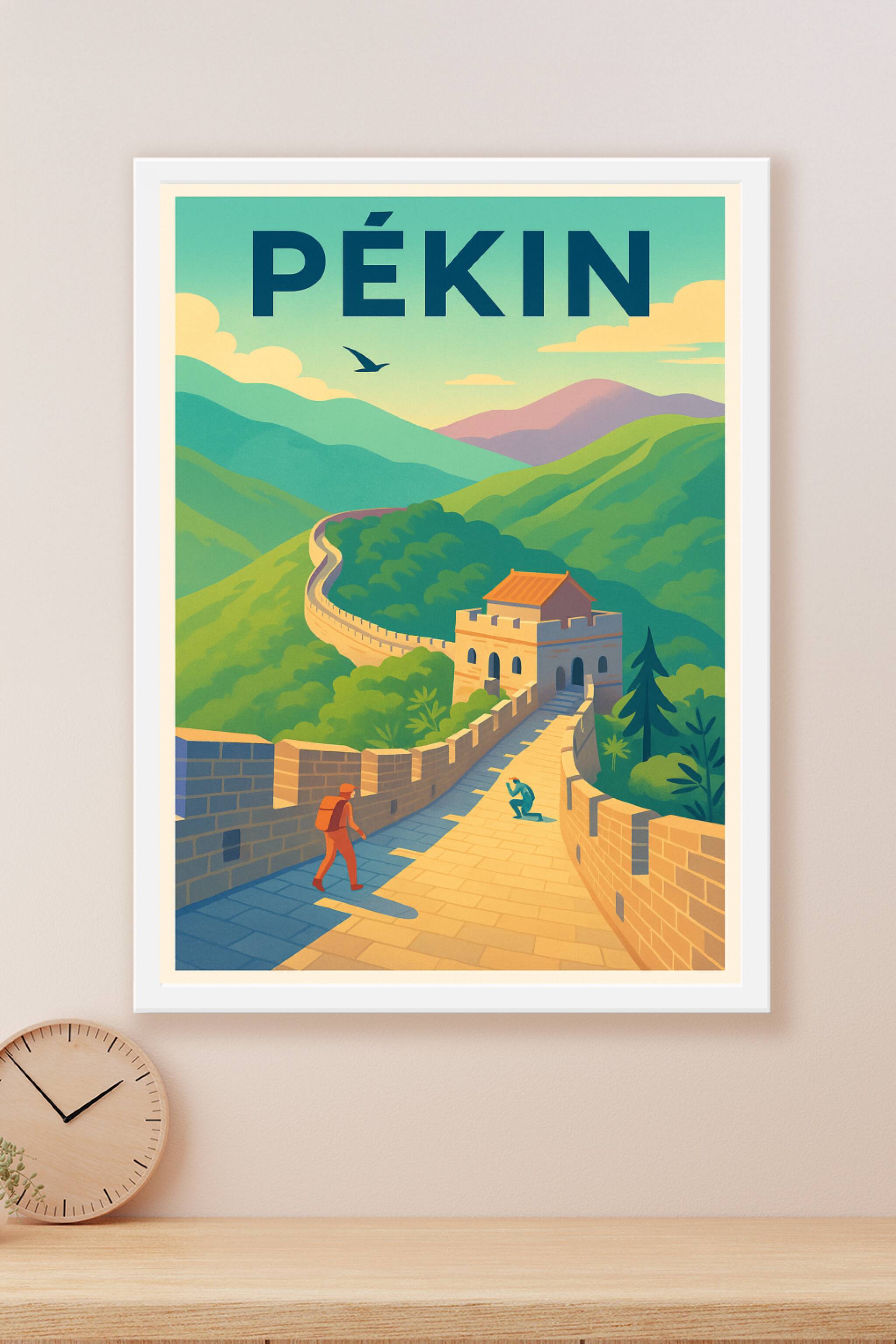 Revivez l'aventure et la grandeur historique de Pékin avec cette affiche au style rétro illustrant la majestueuse Grande Muraille serpentant à trav...