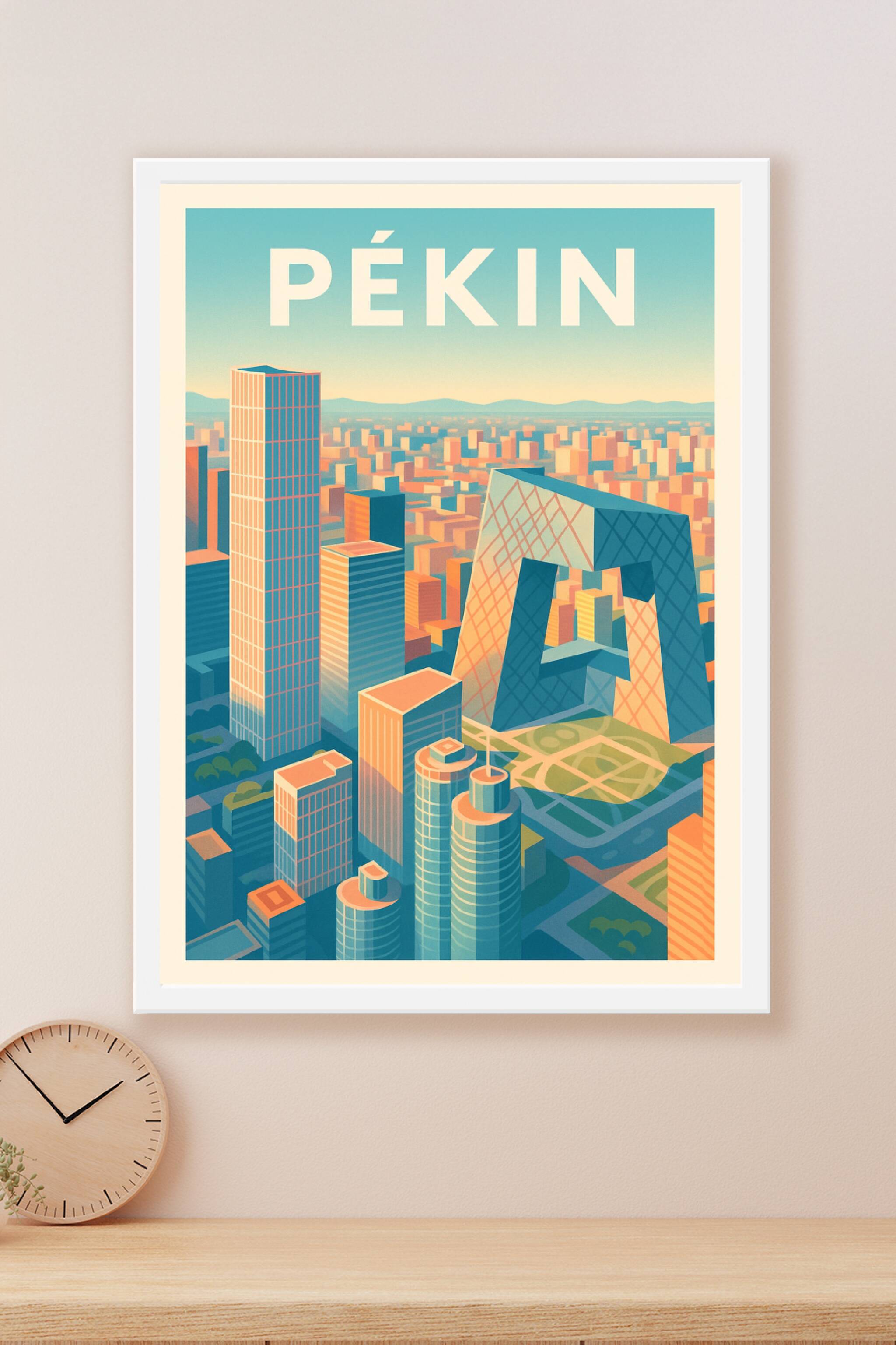 Découvrez l'effervescence architecturale de Pékin avec cette affiche illustrée qui capture la modernité et le dynamisme de la capitale chinoise. Ce poster met en lumière les gratte-ciels impressionnants et le célèbre bâtiment atypique, symbole de l'innovation urbaine.Dans une palette de couleurs chaleureuses et lumineuses, cette affiche apportera une touche contemporaine et élégante à votre décoration intérieure. Imprimée en tirage "Fine Art" sur un papier 305g coton, elle garantit une qualité d'impression exceptionnelle avec des détails précis et des couleurs vibrantes.Vous pouvez choisir parmi plusieurs formats, du A1 au A4, avec ou sans cadre, pour adapter ce poster à votre espace. Profitez d'une fabrication 100% française pour un produit durable et raffiné, idéal pour les passionnés de voyages, d'architecture et de design.
